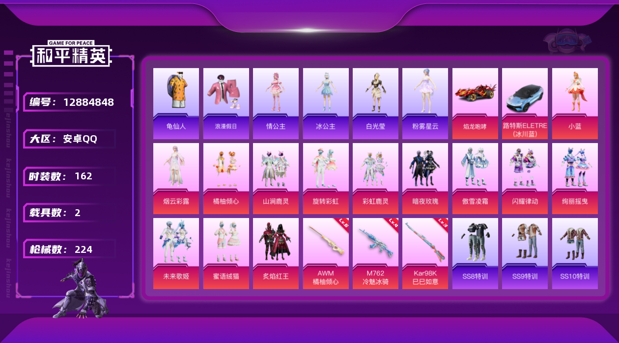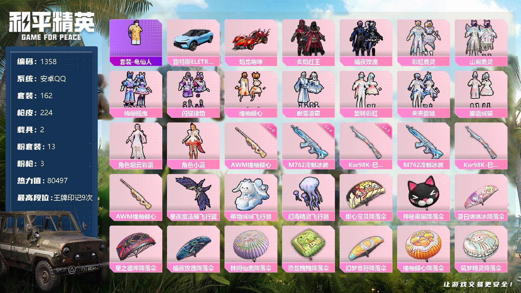 [12884848]安卓 手Q-13粉装-3特效枪-2载具-3粉色飞行器-80497热力值-9王牌印记-162套装-224枪皮 【热门品类】:套装-龟仙人 【粉色载具】:路特斯ELETRE(冰川蓝),焰龙咆哮 【粉色套装】:粉装-炙焰红王,粉装-暗夜玫瑰,粉装-彩虹鹿灵,粉装-山涧鹿灵,粉装-绚丽摇曳,粉装-闪耀律动,粉装-橘柚倾心,粉装-傲雪凌霜,粉装-旋转彩虹,粉装-未来歌姬,粉装-蜜语绒猫,角色-烟云彩露,角色-小蓝 【粉色枪皮等级】:M762-冷魅冰骑(四级),Kar98K-巳巳如意(三级),AWM-橘柚倾心(六级) 【粉色枪皮】:M762-冷魅冰骑,Kar98K-巳巳如意,AWM-橘柚倾心 【粉色飞行器】:星夜魔法师飞行翼,萌物绒绒飞行器,幻海精灵飞行器 【粉色降落伞】:甜心宝贝降落伞,神秘黑猫降落伞,夏日绵绵冰降落伞,星之彼岸降落伞,暗夜玫瑰降落伞,林间仙鹿降落伞,恐龙拽拽降落伞,幻梦音符降落伞,橘柚倾心降落伞,筑梦精灵降落伞,环太平洋降落伞,垂柳戏鸭降落伞,暗夜鎏金降落伞,天星战神降落伞,莲影清波降落伞,江南烟雨降落伞,精灵梦叶罗丽降落伞,墨龙九天降落伞,鸢尾晶梦降落伞,创世·救赎降落伞,守护天翼降落伞 【稀有套装】:套装-龟仙人 【稀有枪皮】:AKM-春暖花开,AKM-破晓战魂,AKM-筑梦精灵,AKM-萌趣颜团子,AKM-虎虎生威,AKM-锦绣火鲤,AKM-龙的传人,M16A4-幻世战舞者,M16A4-甜心亚梦,M16A4-红色方程式,SCAR-L-炫彩节奏,SCAR-L-玉兔迎春,SCAR-L-碧影闪光,SCAR-L-红色方程式,SCAR-L-青丘仙客,M416-夜灯,M416-糯团青竹,M416-紫翼圣骑,M416-红色方程式,M416-蓝色火焰,GROZA-彩虹符号,GROZA-恐龙拽拽,GROZA-春暖花开,GROZA-林间仙鹿,GROZA-治愈之星,GROZA-田园牧歌,GROZA-紫翼圣骑,AUG-幻梦音符,AUG-炫光贝贝,AUG-耀粉歌者,AUG-青春冒险家,QBZ-彩虹符号,QBZ-飞驰魅影,M762-橘柚倾心,M762-牛气冲天,M762-瑞龙福将,M762-萌物绒绒,Mk47-妙红点点,Mk47-林间仙鹿,Mk47-炫光之旅,Mk47-青春冒险家,AC-VAL-天降萌叽,AC-VAL-快闪甜心,AC-VAL-甜心亚梦,AC-VAL-闲梦青缨,蜜