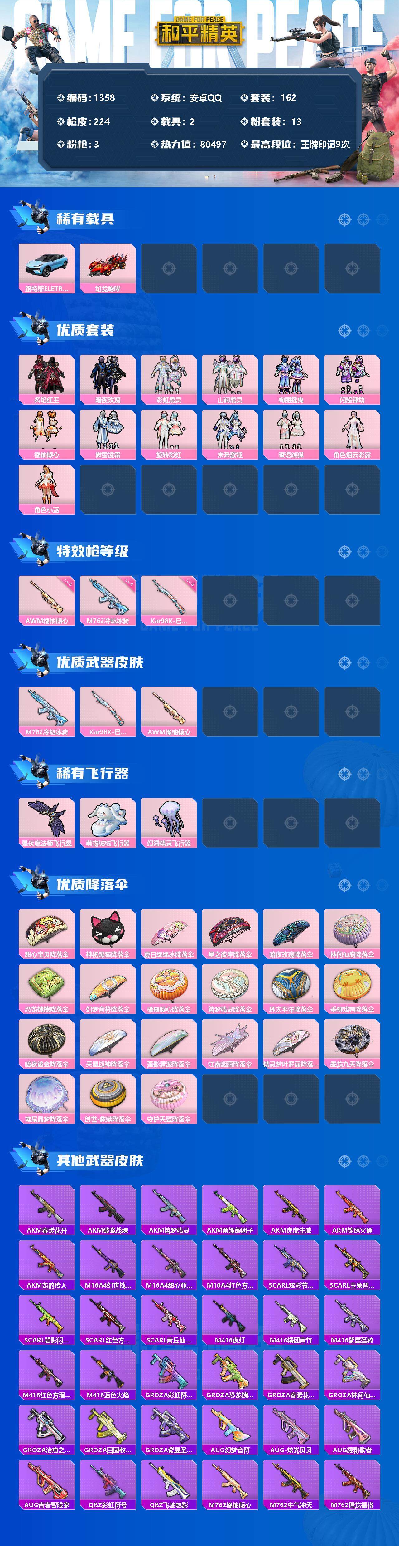 [12884848]安卓 手Q-13粉装-3特效枪-2载具-3粉色飞行器-80497热力值-9王牌印记-162套装-224枪皮