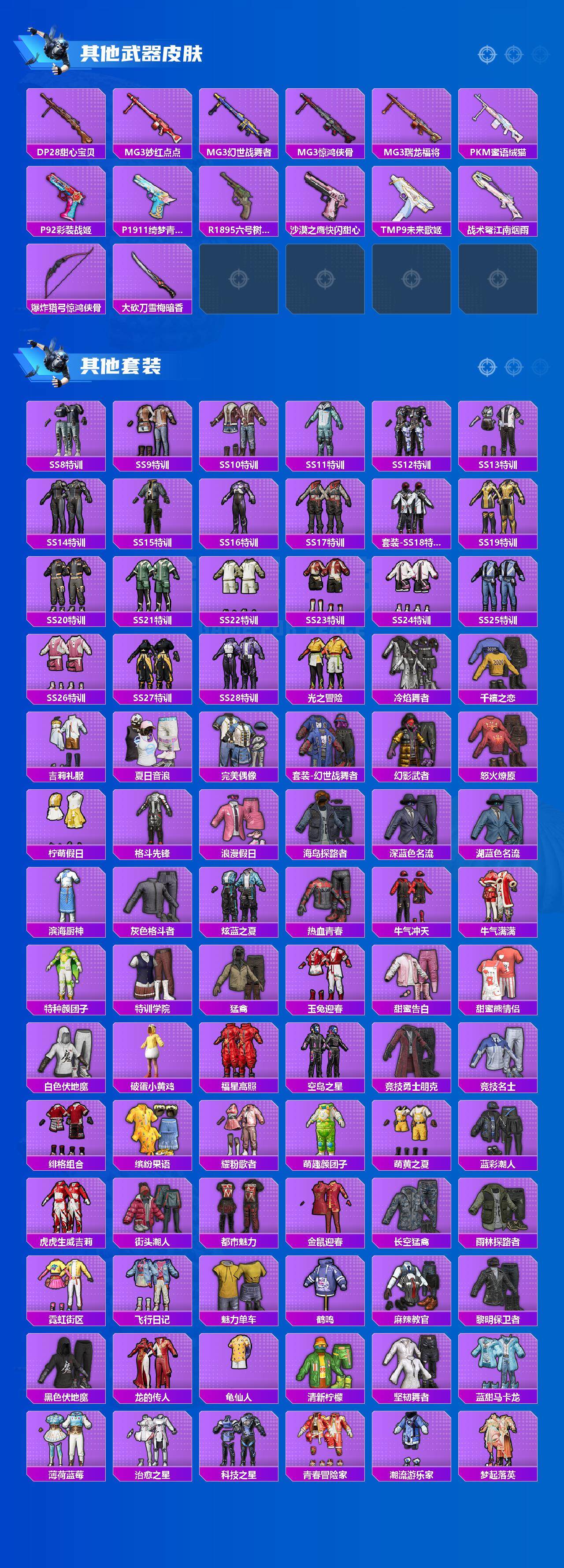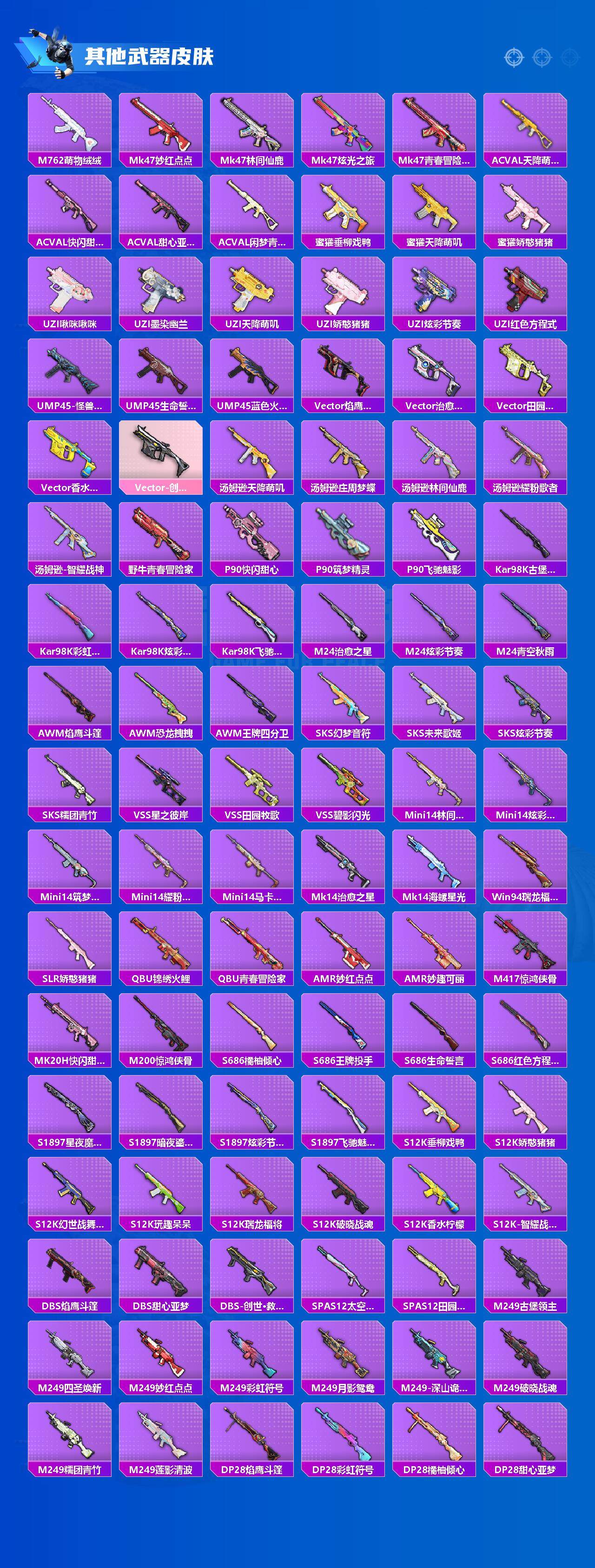 【稀有枪皮】:AKM-春暖花开,AKM-破晓战魂,AKM-筑梦精灵,AKM-萌趣颜团子,AKM-虎虎生威,AKM-锦绣火鲤,AKM-龙的传人,M16A4-幻世战舞者,M16A4-甜心亚梦,M16A4-红色方程式,SCAR-L-炫彩节奏,SCAR-L-玉兔迎春,SCAR-L-碧影闪光,SCAR-L-红色方程式,SCAR-L-青丘仙客,M416-夜灯,M416-糯团青竹,M416-紫翼圣骑,M416-红色方程式,M416-蓝色火焰,GROZA-彩虹符号,GROZA-恐龙拽拽,GROZA-春暖花开,GROZA-林间仙鹿,GROZA-治愈之星,GROZA-田园牧歌,GROZA-紫翼圣骑,AUG-幻梦音符,AUG-炫光贝贝,AUG-耀粉歌者,AUG-青春冒险家,QBZ-彩虹符号,QBZ-飞驰魅影,M762-橘柚倾心,M762-牛气冲天,M762-瑞龙福将,M762-萌物绒绒,Mk47-妙红点点,Mk47-林间仙鹿,Mk47-炫光之旅,Mk47-青春冒险家,AC-VAL-天降萌叽,AC-VAL-快闪甜心,AC-VAL-甜心亚梦,AC-VAL-闲梦青缨,蜜