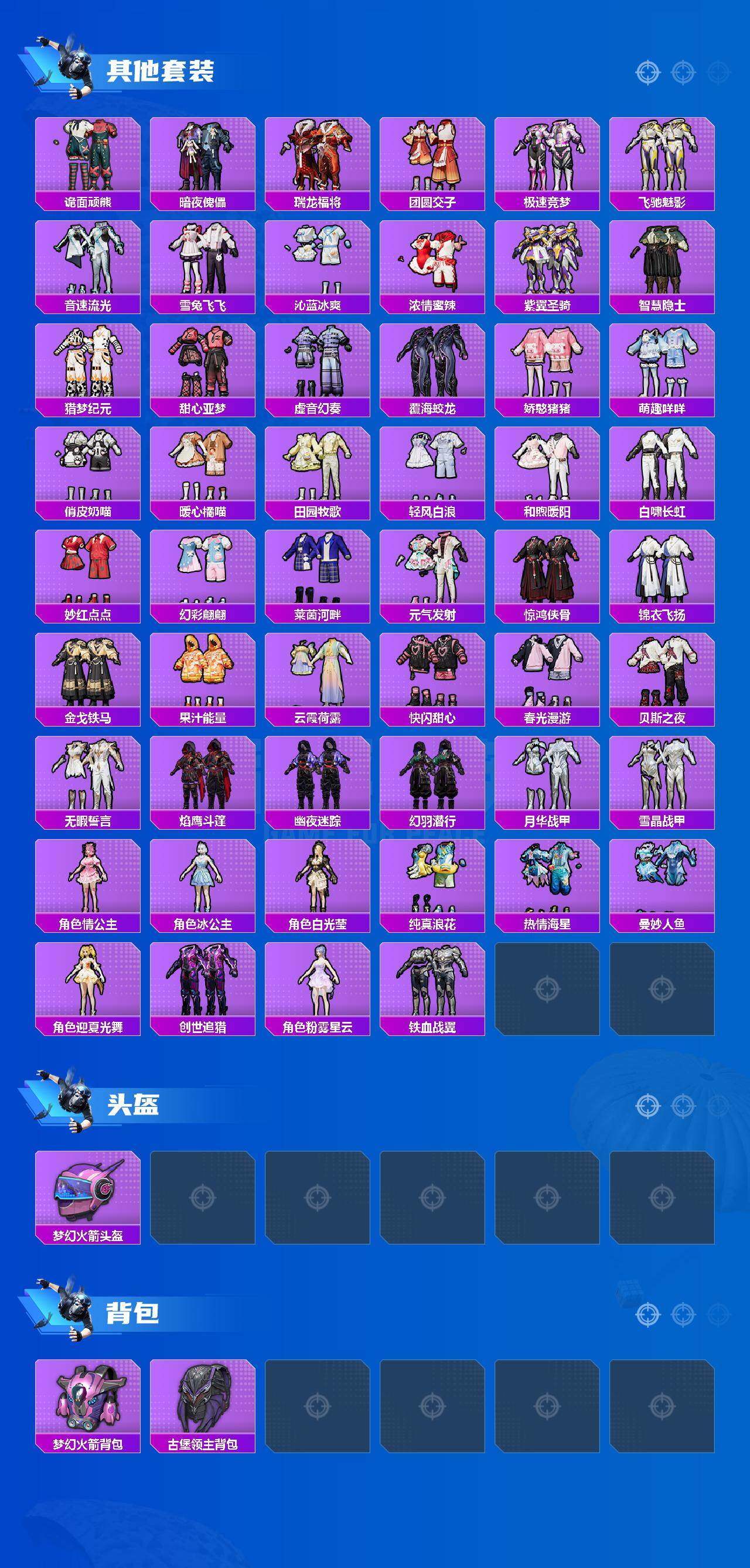 【粉色套装】:粉装-炙焰红王,粉装-暗夜玫瑰,粉装-彩虹鹿灵,粉装-山涧鹿灵,粉装-绚丽摇曳,粉装-闪耀律动,粉装-橘柚倾心,粉装-傲雪凌霜,粉装-旋转彩虹,粉装-未来歌姬,粉装-蜜语绒猫,角色-烟云彩露,角色-小蓝