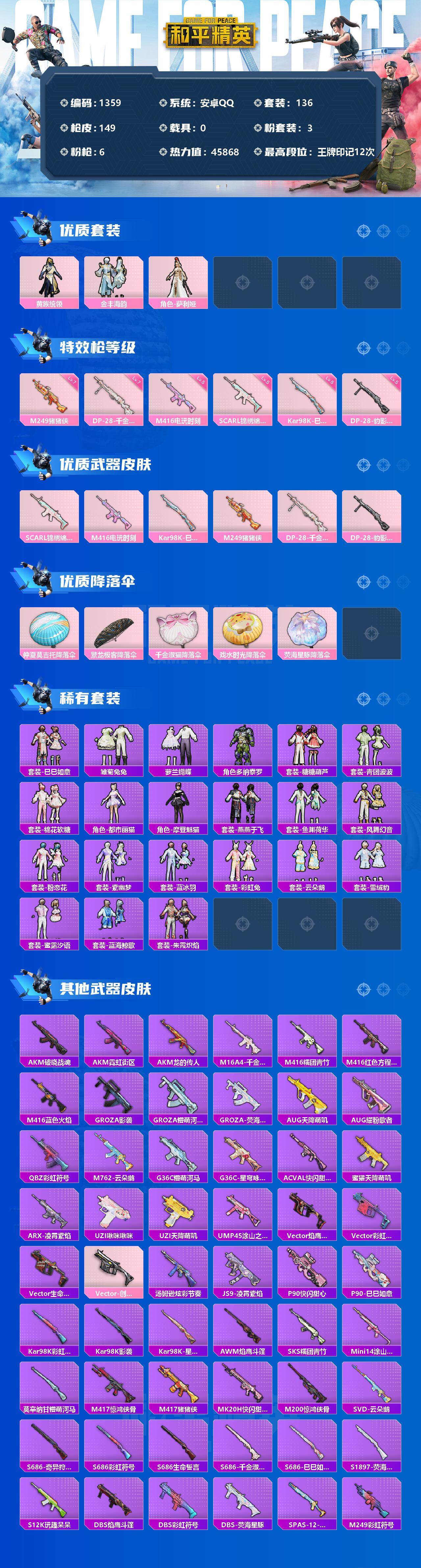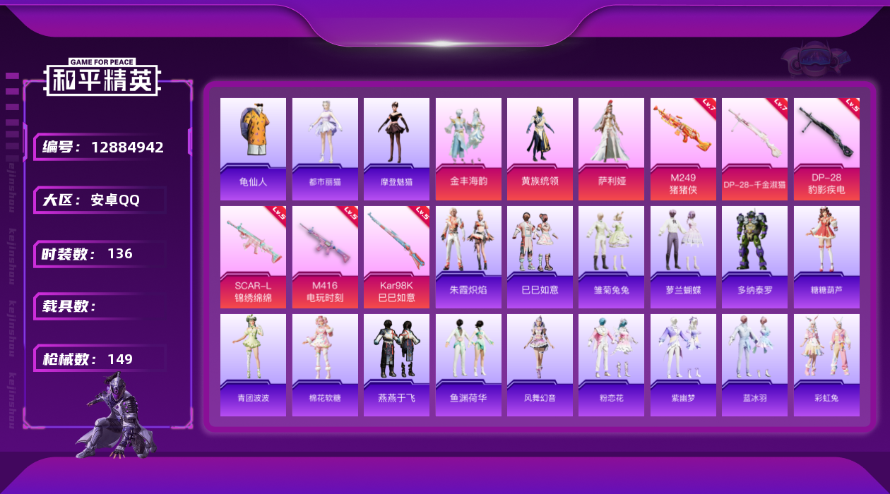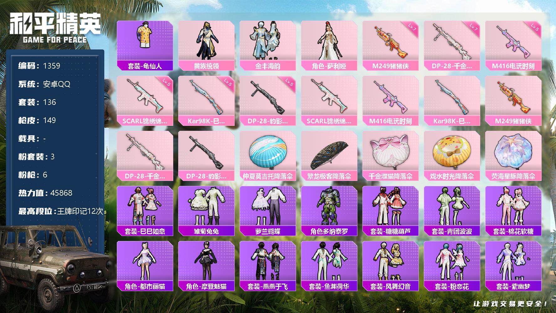 [12884942]安卓 手Q-3粉装-6特效枪-0载具-0粉色飞行器-45868热力值-12王牌印记-136套装-149枪皮 【热门品类】:套装-龟仙人 【粉色套装】:粉装-黄族统领,粉装-金丰海韵,角色-萨利娅 【粉色枪皮等级】:SCAR-L-锦绣绵绵(五级),M416-电玩时刻(五级),Kar98K-巳巳如意(五级),M249-猪猪侠(七级),DP-28-千金淑猫(七级),DP-28-豹影疾电(五级) 【粉色枪皮】:SCAR-L-锦绣绵绵,M416-电玩时刻,Kar98K-巳巳如意,M249-猪猪侠,DP-28-千金淑猫,DP-28-豹影疾电 【粉色降落伞】:仲夏莫吉托降落伞,繁龙极客降落伞,千金淑猫降落伞,戏水时光降落伞,荧海星豚降落伞 【稀有套装】:套装-龟仙人,套装-巳巳如意,套装-雏菊兔兔,套装-萝兰蝴蝶,角色-多纳泰罗,套装-糖糖葫芦,套装-青团波波,套装-棉花软糖,角色-都市丽猫,角色-摩登魅猫,套装-燕燕于飞,套装-鱼渊荷华,套装-风舞幻音,套装-粉恋花,套装-紫幽梦,套装-蓝冰羽,套装-彩虹兔,套装-云朵鹅,套装-雪绒豹,套装-蜜露汐语,套装-蓝海鲸歌,套装-朱霞炽焰 【稀有枪皮】:AKM-破晓战魂,AKM-霓虹街区,AKM-龙的传人,M16A4-千金淑猫,M416-糯团青竹,M416-红色方程式,M416-蓝色火焰,GROZA-影袭,GROZA-懵萌河马,GROZA-荧海星豚,AUG-天降萌叽,AUG-耀粉歌者,QBZ-彩虹符号,M762-云朵鹅,G36C-懵萌河马,G36C-星穹咏叹调,AC-VAL-快闪甜心,蜜獾-天降萌叽,ARX-凌霄紫焰,UZI-啾咪啾咪,UZI-天降萌叽,UMP45-涂山之恋,Vector-焰鹰斗篷,Vector-彩虹符号,Vector-生命誓言,Vector-创世·救赎,汤姆逊-炫彩节奏,JS9-凌霄紫焰,P90-快闪甜心,P90-巳巳如意,Kar98K-彩虹符号,Kar98K-影袭,Kar98K-星穹咏叹调,AWM-焰鹰斗篷,SKS-糯团青竹,Mini14-涂山之恋,莫辛纳甘-懵萌河马,M417-惊鸿侠骨,M417-猪猪侠,MK20-H-快闪甜心,M200-惊鸿侠骨,SVD-云朵鹅,S686-奇异狩猎者,S686-彩虹符号,S686-生命誓言,S686-巳巳如意,S686-千金淑猫,S1897-荧海星豚,S12K-玩趣呆呆,DBS