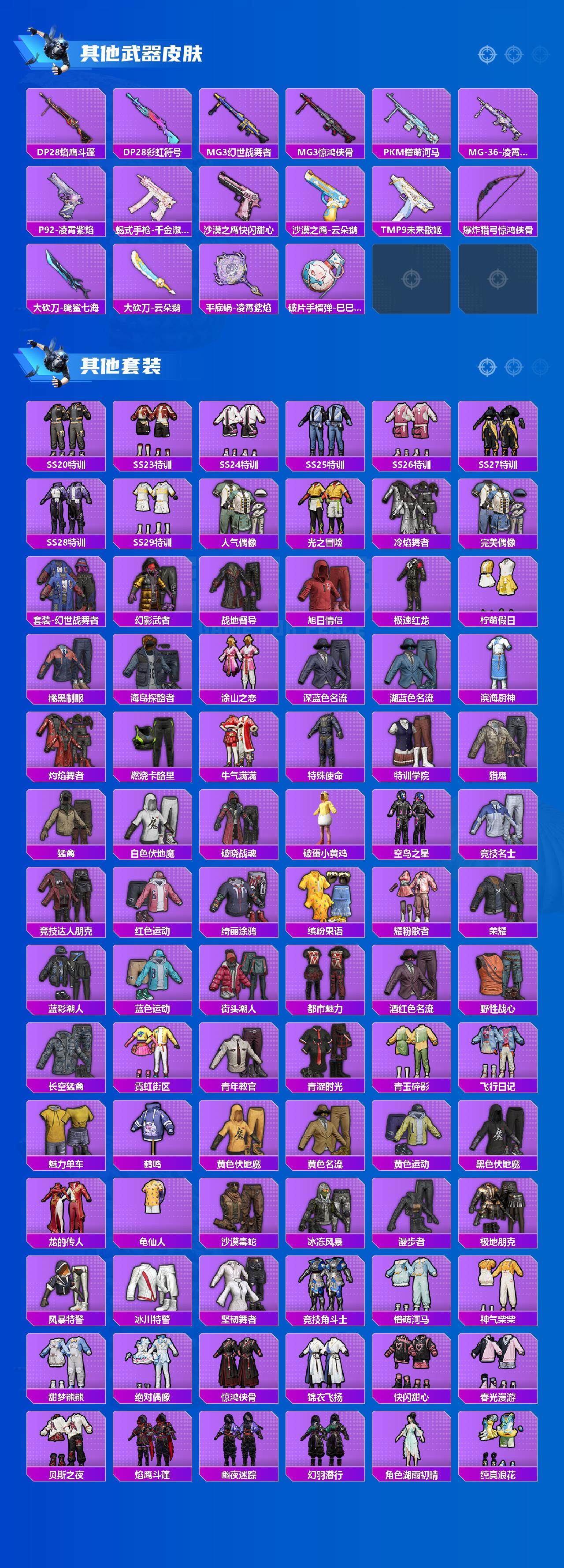 - [11626933]1粉装 4特效枪 6印记 可二次 可修改实名 优质装备:SLR暗夜玫瑰,M417第五大道,七级M417-第五大道,七级SLR-暗夜玫瑰,幻彩电音,Kar98K-巳巳如意 稀有枪皮:DP-28-豹影疾电 五级特效枪:五级Kar98K-巳巳如意,五级DP-28-豹影疾电 紫色装扮:田园牧歌,轻风白浪,和煦暖阳,SS22特训,莱茵河畔,SS23特训,幻彩翩翩,灵蜜圈圈,妙红点点,香榭午后,白兰地假日,娇憨猪猪,萌趣咩咩,SS21特训,SS31特训套装,冰川特警,冷焰舞者,旭日情侣,SS30特训套装,SS33特训套装,顶瓜瓜,SS20特训,魔力冰咖,都市魅力,长空猛禽,霓虹街区,青年教官,缤纷果语,耀眼新星,蓝色运动,街头潮人,超能勇士,魅力单车,鹤鸣,麻辣教官,黄色伏地魔,黄色名流,黄色运动,黑色伏地魔,龙的传人,龟仙人,冰河战士,龙魂突击队,柠萌假日,海岛探路者,涂山之恋,幻影武者,完美偶像,帅气教官,幻世战舞者,绮丽涂鸦,白色伏地魔,甜蜜告白,空岛之星,竞技达人朋克,王牌教练,牛气冲天,灰色格斗者,燃烧卡路里,猎鹰,SS29特训,星途旅人,纯真浪花,热情海星,SS28特训,玉兔迎春,巳巳如意,竞技名士,SS24特训(SS24特训套装),SS25特训,锦衣飞扬,焰鹰斗篷,幻羽潜行,幽夜迷踪,SS27特训,浪漫天命,SS26特训,春光漫游,快闪甜心,贝斯之夜,大橘大利,SS32特训服(SS32特训套装),青玉碎影,绯格组合,白糯汤圆,恋语绒绒,光之冒险 优质战备:圣堂之誓降落伞,星途旅人降落伞,繁龙极客降落伞,垂柳戏鸭降落伞,歌者泠鸢降落伞,第五大道降落伞,黄族统领降落伞,凝视深渊降落伞
