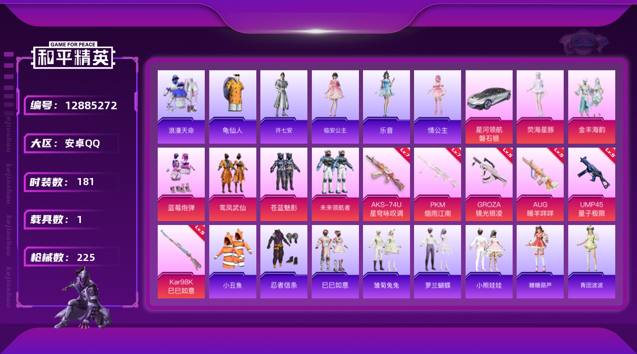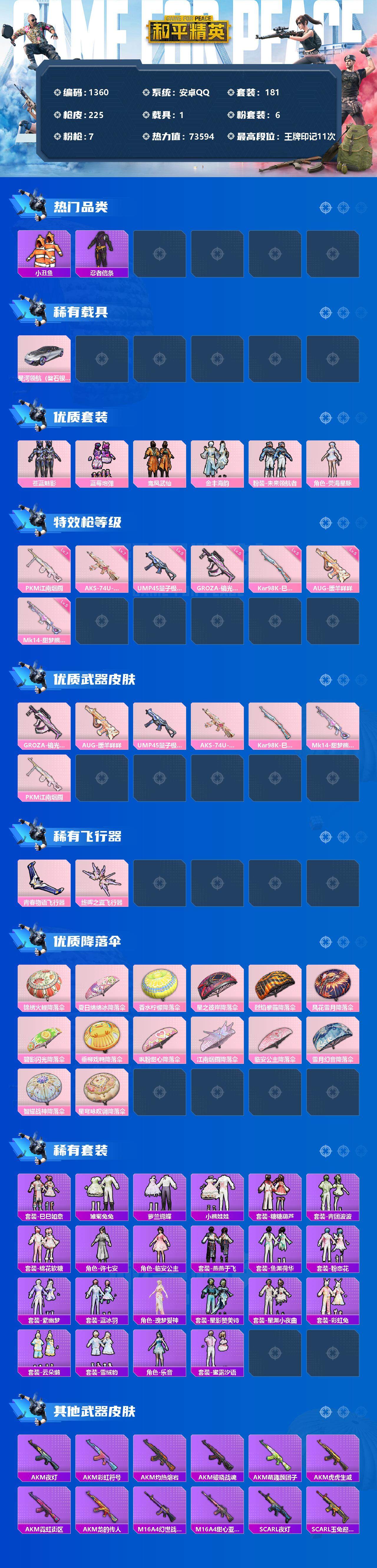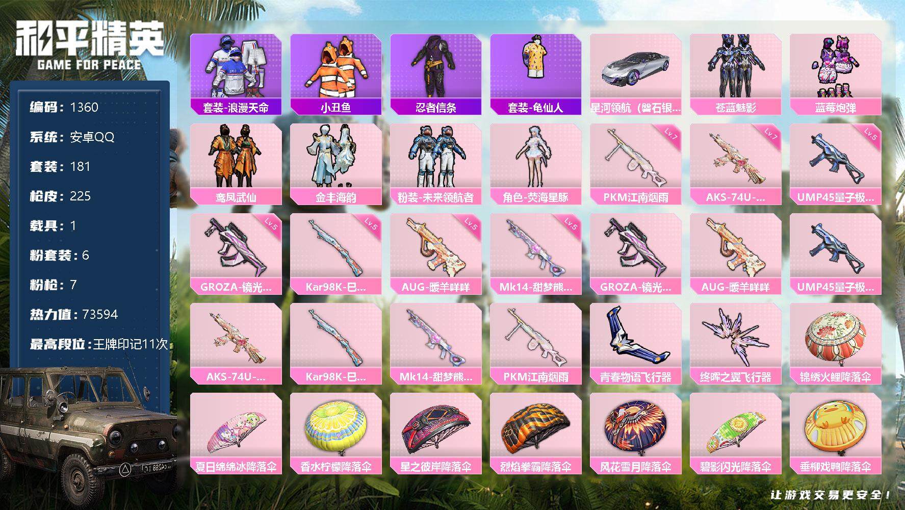 [12885272]安卓 手Q-6粉装-7特效枪-1载具-2粉色飞行器-73594热力值-11王牌印记-181套装-225枪皮 【热门品类】:套装-浪漫天命,套装-小丑鱼,套装-忍者信条,套装-龟仙人 【粉色载具】:星河领航(磐石银) 【粉色套装】:粉装-苍蓝魅影,粉装-蓝莓炮弹,粉装-鸾凤武仙,粉装-金丰海韵,粉装-未来领航者,角色-荧海星豚 【粉色枪皮等级】:GROZA-镜光银凌(五级),AUG-暖羊咩咩(五级),UMP45-量子极限(五级),AKS-74U-星穹咏叹调(七级),Kar98K-巳巳如意(五级),Mk14-甜梦熊击(五级),PKM-江南烟雨(七级) 【粉色枪皮】:GROZA-镜光银凌,AUG-暖羊咩咩,UMP45-量子极限,AKS-74U-星穹咏叹调,Kar98K-巳巳如意,Mk14-甜梦熊击,PKM-江南烟雨 【粉色飞行器】:青春物语飞行器,终晖之翼飞行器 【粉色降落伞】:锦绣火鲤降落伞,夏日绵绵冰降落伞,香水柠檬降落伞,星之彼岸降落伞,烈焰拳霸降落伞,风花雪月降落伞,碧影闪光降落伞,垂柳戏鸭降落伞,飒粉甜心降落伞,江南烟雨降落伞,临安公主降落伞,雪月幻音降落伞,智耀战神降落伞,星穹咏叹调降落伞 【稀有套装】:套装-龟仙人,套装-巳巳如意,套装-雏菊兔兔,套装-萝兰蝴蝶,套装-小熊娃娃,套装-糖糖葫芦,套装-青团波波,套装-棉花软糖,角色-许七安,角色-临安公主,套装-燕燕于飞,套装-鱼渊荷华,套装-粉恋花,套装-紫幽梦,套装-蓝冰羽,角色-瑰梦爱神,套装-星影赞美诗,套装-星渊小夜曲,套装-彩虹兔,套装-云朵鹅,套装-雪绒豹,角色-乐音,套装-蜜露汐语 【稀有枪皮】:AKM-夜灯,AKM-彩虹符号,AKM-灼热熔岩,AKM-破晓战魂,AKM-萌趣颜团子,AKM-虎虎生威,AKM-霓虹街区,AKM-龙的传人,M16A4-幻世战舞者,M16A4-甜心亚梦,SCAR-L-夜灯,SCAR-L-玉兔迎春,SCAR-L-红色方程式,SCAR-L-黄金龙骨,M416-月影鸳鸯,M416-糯团青竹,M416-红色方程式,M416-蓝色火焰,GROZA-彩虹符号,GROZA-懵萌河马,GROZA-治愈之星,GROZA-荧海星豚,AUG-天降萌叽,AUG-幻影战神,AUG-耀粉歌者,AUG-青春冒险家,QBZ-妙趣可丽,QBZ-彩虹符号,QBZ-洛神天依,QBZ-赛罗,QBZ-飞驰