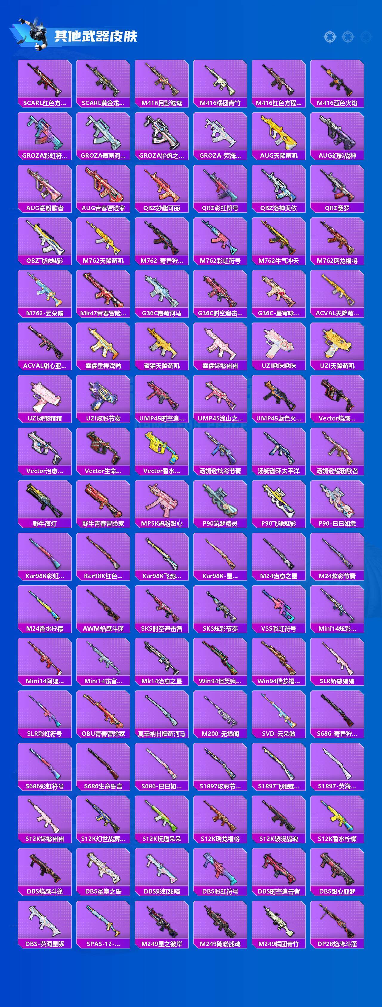 【稀有枪皮】:AKM-夜灯,AKM-彩虹符号,AKM-灼热熔岩,AKM-破晓战魂,AKM-萌趣颜团子,AKM-虎虎生威,AKM-霓虹街区,AKM-龙的传人,M16A4-幻世战舞者,M16A4-甜心亚梦,SCAR-L-夜灯,SCAR-L-玉兔迎春,SCAR-L-红色方程式,SCAR-L-黄金龙骨,M416-月影鸳鸯,M416-糯团青竹,M416-红色方程式,M416-蓝色火焰,GROZA-彩虹符号,GROZA-懵萌河马,GROZA-治愈之星,GROZA-荧海星豚,AUG-天降萌叽,AUG-幻影战神,AUG-耀粉歌者,AUG-青春冒险家,QBZ-妙趣可丽,QBZ-彩虹符号,QBZ-洛神天依,QBZ-赛罗,QBZ-飞驰