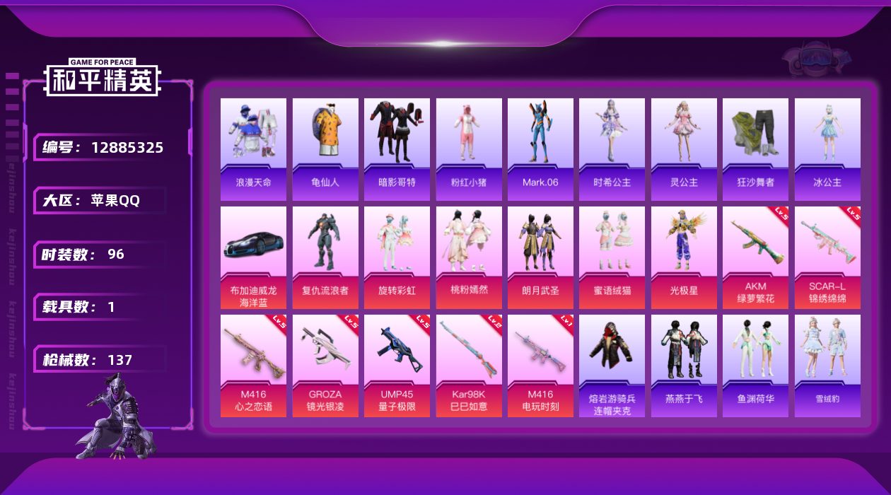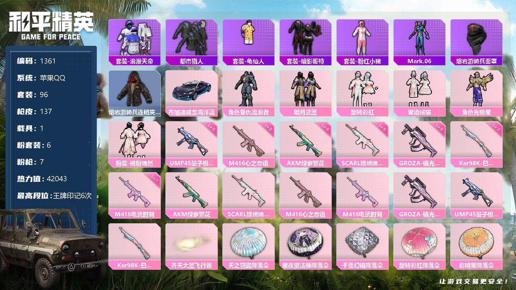[12885325]苹果 手Q-6粉装-7特效枪-1载具-2粉色飞行器-42043热力值-6王牌印记-96套装-137枪皮