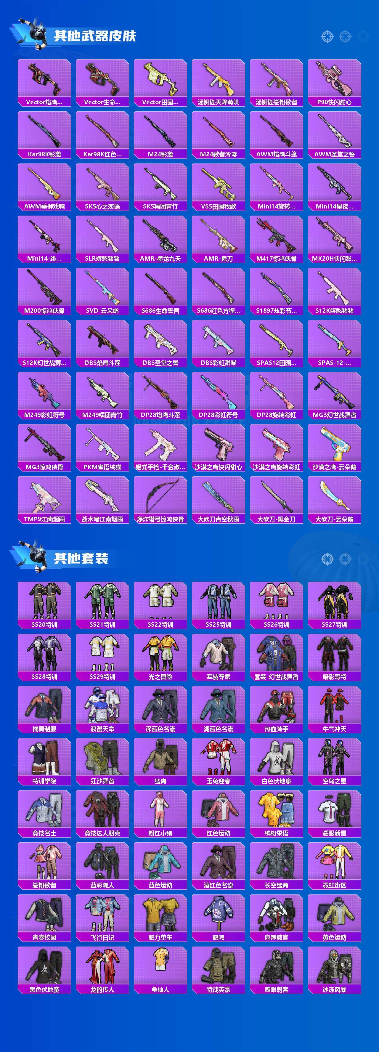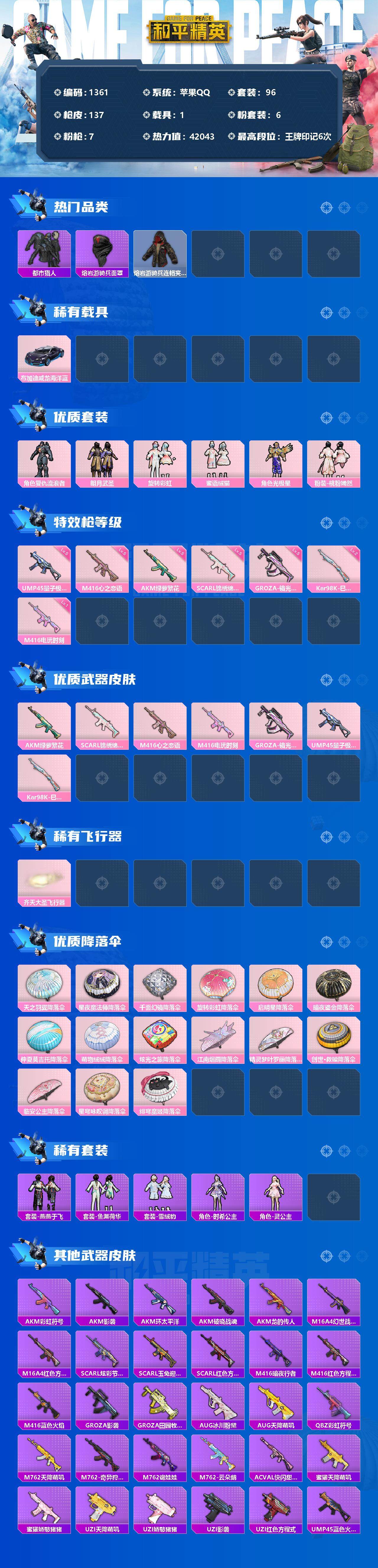 [12885325]苹果 手Q-6粉装-7特效枪-1载具-2粉色飞行器-42043热力值-6王牌印记-96套装-137枪皮 【热门品类】:套装-浪漫天命,套装-都市猎人,套装-龟仙人,套装-暗影哥特,套装-粉红小猪,角色-Mark.06,熔岩游骑兵面罩,熔岩游骑兵连帽夹克 【粉色载具】:布加迪威龙(海洋蓝) 【粉色套装】:角色-复仇流浪者,粉装-朗月武圣,粉装-旋转彩虹,粉装-蜜语绒猫,角色-光极星,粉装-桃粉嫣然 【粉色枪皮等级】:AKM-绿萝繁花(五级),SCAR-L-锦绣绵绵(五级),M416-心之恋语(五级),M416-电玩时刻(一级),GROZA-镜光银凌(五级),UMP45-量子极限(五级),Kar98K-巳巳如意(二级) 【粉色枪皮】:AKM-绿萝繁花,SCAR-L-锦绣绵绵,M416-心之恋语,M416-电玩时刻,GROZA-镜光银凌,UMP45-量子极限,Kar98K-巳巳如意 【粉色飞行器】:齐天大圣飞行器 【粉色降落伞】:天之羽翼降落伞,星夜魔法师降落伞,千面幻镜降落伞,旋转彩虹降落伞,启明星降落伞,暗夜鎏金降落伞,仲夏莫吉托降落伞,萌物绒绒降落伞,炫光之旅降落伞,江南烟雨降落伞,精灵梦叶罗丽降落伞,创世·救赎降落伞,临安公主降落伞,星穹咏叹调降落伞,绯穹魔姬降落伞 【稀有套装】:套装-龟仙人,套装-燕燕于飞,套装-鱼渊荷华,套装-雪绒豹,角色-时希公主,角色-灵公主 【稀有枪皮】:AKM-彩虹符号,AKM-影袭,AKM-环太平洋,AKM-破晓战魂,AKM-龙的传人,M16A4-幻世战舞者,M16A4-红色方程式,SCAR-L-炫彩节奏,SCAR-L-玉兔迎春,SCAR-L-红色方程式,M416-暗夜行者,M416-红色方程式,M416-蓝色火焰,GROZA-影袭,GROZA-田园牧歌,AUG-冰川粉黛,AUG-天降萌叽,QBZ-彩虹符号,M762-天降萌叽,M762-奇异狩猎者,M762-诡娃娃,M762-云朵鹅,AC-VAL-快闪甜心,蜜獾-天降萌叽,蜜獾-娇憨猪猪,UZI-天降萌叽,UZI-娇憨猪猪,UZI-影袭,UZI-红色方程式,UMP45-蓝色火焰,Vector-焰鹰斗篷,Vector-生命誓言,Vector-田园牧歌,汤姆逊-天降萌叽,汤姆逊-耀粉歌者,P90-快闪甜心,Kar98K-影袭,Kar98K-红色方程式,M24-影袭,M24-歌者泠鸢,