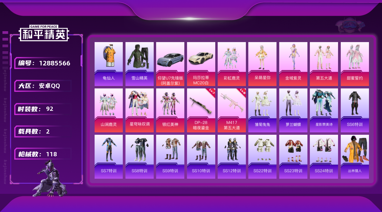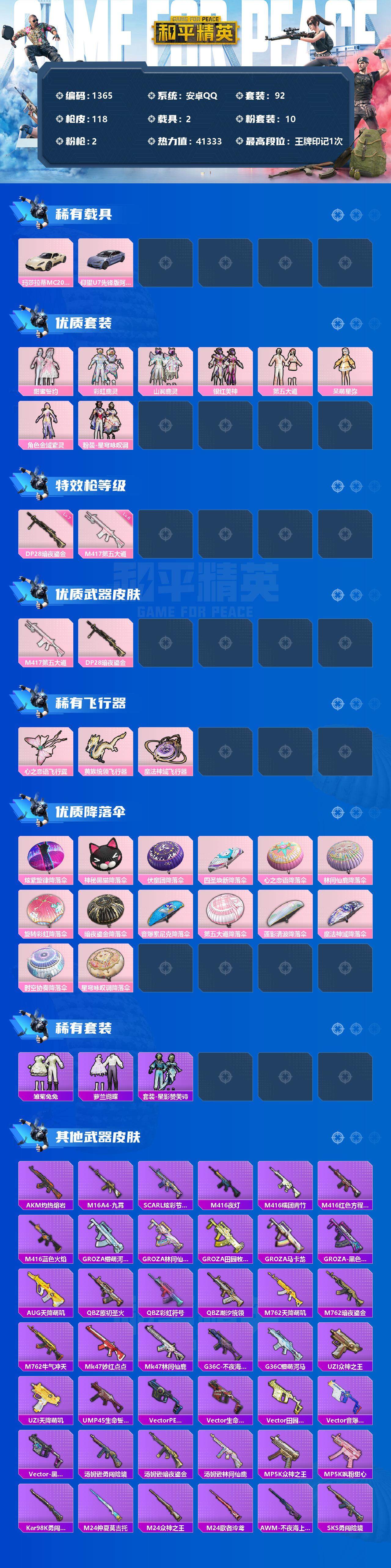 [12885566]安卓 手Q-10粉装-2特效枪-2载具-3粉色飞行器-41333热力值-1王牌印记-92套装-118枪皮 【热门品类】:套装-龟仙人,大砍刀-青龙偃月刀 【粉色载具】:玛莎拉蒂MC20(星石白),仰望U7(阿盖尔紫) 【粉色套装】:粉装-甜蜜誓约,粉装-彩虹鹿灵,粉装-山涧鹿灵,粉装-银红美神,粉装-第五大道,角色-呆萌星弥,角色-金域紫灵,粉装-星穹咏叹调 【粉色枪皮等级】:M417-第五大道(六级),DP-28-暗夜鎏金(七级) 【粉色枪皮】:M417-第五大道,DP-28-暗夜鎏金 【粉色飞行器】:心之恋语飞行翼,黄族统领飞行器,魔法神域飞行器 【粉色降落伞】:炫紫旋律降落伞,神秘黑猫降落伞,伏魔团降落伞,四圣焕新降落伞,心之恋语降落伞,林间仙鹿降落伞,旋转彩虹降落伞,暗夜鎏金降落伞,音爆索尼克降落伞,第五大道降落伞,莲影清波降落伞,魔法神域降落伞,时空协奏降落伞,星穹咏叹调降落伞 【稀有套装】:套装-龟仙人,套装-雏菊兔兔,套装-萝兰蝴蝶,套装-星影赞美诗 【稀有枪皮】:AKM-灼热熔岩,M16A4-九霄,SCAR-L-炫彩节奏,M416-夜灯,M416-糯团青竹,M416-红色方程式,M416-蓝色火焰,GROZA-懵萌河马,GROZA-林间仙鹿,GROZA-田园牧歌,GROZA-马卡龙,GROZA-黑色刀锋,AUG-天降萌叽,QBZ-原初圣火,QBZ-彩虹符号,QBZ-潮汐统领,M762-天降萌叽,M762-暗夜鎏金,M762-牛气冲天,Mk47-妙红点点,Mk47-林间仙鹿,G36C-不夜海上花,G36C-懵萌河马,UZI-众神之王,UZI-天降萌叽,UMP45-生命誓言,Vector-PEL轰鸣竞梦者,Vector-生命誓言,Vector-田园牧歌,Vector-音爆索尼克,Vector-黑色刀锋,汤姆逊-勇闯险境,汤姆逊-暗夜鎏金,汤姆逊-林间仙鹿,MP5K-众神之王,MP5K-飒粉甜心,Kar98K-勇闯险境,M24-歌者泠鸢,M24-仲夏莫吉托,M24-众神之王,AWM-不夜海上花,SKS-勇闯险境,SKS-未来歌姬,VSS-彩虹符号,VSS-田园牧歌,VSS-黑色刀锋,Mini14-原初圣火,Mini14-林间仙鹿,Mini14-炫彩节奏,Mini14-金鼠迎春,SLR-众神之王,SLR-彩虹符号,QBU-不夜海上花,莫辛纳甘-懵萌河马,A