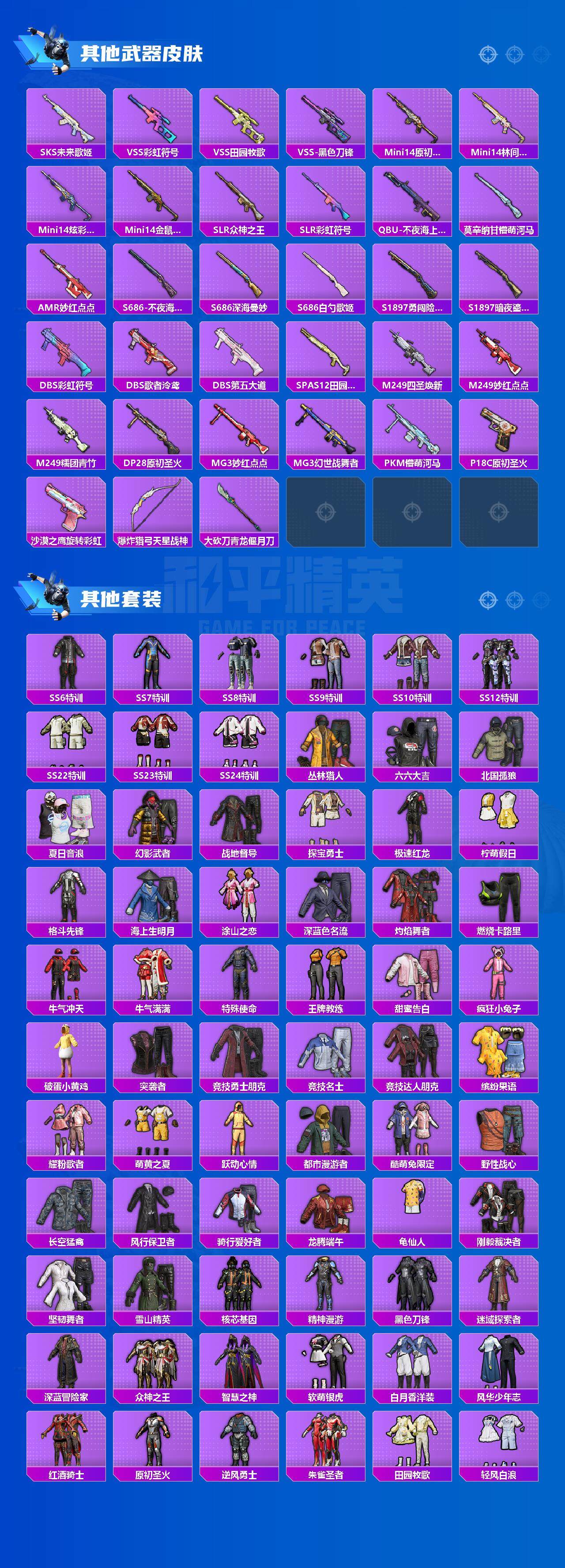 【稀有枪皮】:AKM-灼热熔岩,M16A4-九霄,SCAR-L-炫彩节奏,M416-夜灯,M416-糯团青竹,M416-红色方程式,M416-蓝色火焰,GROZA-懵萌河马,GROZA-林间仙鹿,GROZA-田园牧歌,GROZA-马卡龙,GROZA-黑色刀锋,AUG-天降萌叽,QBZ-原初圣火,QBZ-彩虹符号,QBZ-潮汐统领,M762-天降萌叽,M762-暗夜鎏金,M762-牛气冲天,Mk47-妙红点点,Mk47-林间仙鹿,G36C-不夜海上花,G36C-懵萌河马,UZI-众神之王,UZI-天降萌叽,UMP45-生命誓言,Vector-PEL轰鸣竞梦者,Vector-生命誓言,Vector-田园牧歌,Vector-音爆索尼克,Vector-黑色刀锋,汤姆逊-勇闯险境,汤姆逊-暗夜鎏金,汤姆逊-林间仙鹿,MP5K-众神之王,MP5K-飒粉甜心,Kar98K-勇闯险境,M24-歌者泠鸢,M24-仲夏莫吉托,M24-众神之王,AWM-不夜海上花,SKS-勇闯险境,SKS-未来歌姬,VSS-彩虹符号,VSS-田园牧歌,VSS-黑色刀锋,Mini14-原初圣火,Mini14-林间仙鹿,Mini14-炫彩节奏,Mini14-金鼠迎春,SLR-众神之王,SLR-彩虹符号,QBU-不夜海上花,莫辛纳甘-懵萌河马,A