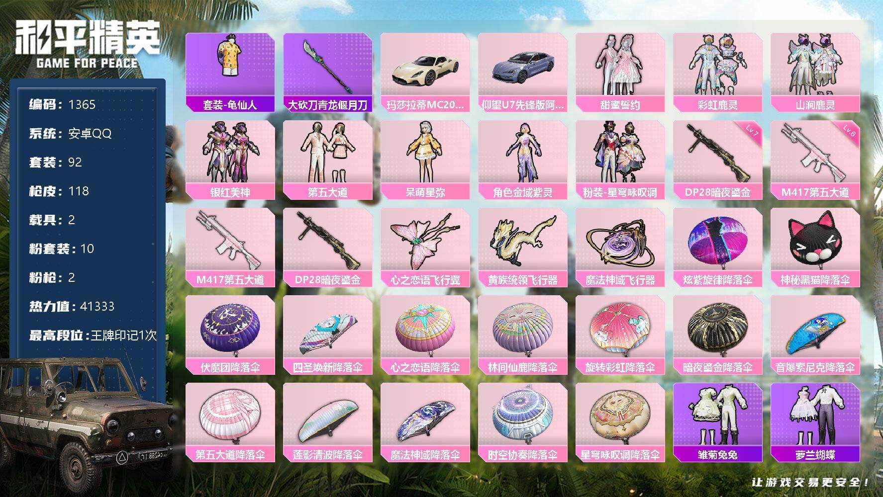 [12885566]安卓 手Q-10粉装-2特效枪-2载具-3粉色飞行器-41333热力值-1王牌印记-92套装-118枪皮