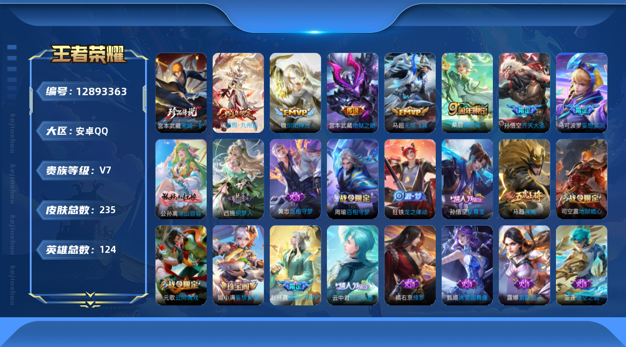 [12893363]安卓Q-V7-永恒钻石I段位-124英雄-235皮肤-0典藏-0珍品无双-0无双-1珍品传说-7传说-64史诗