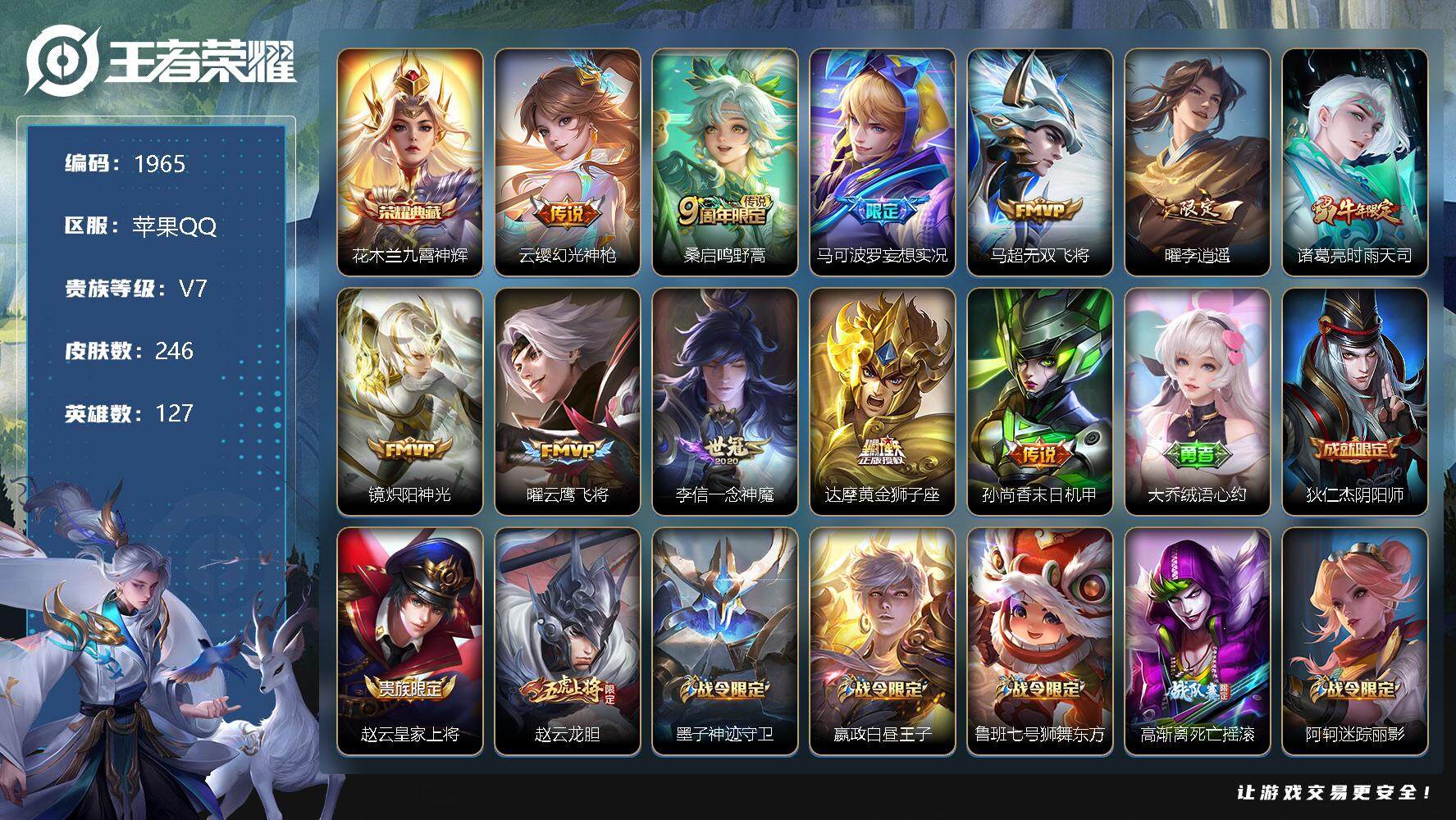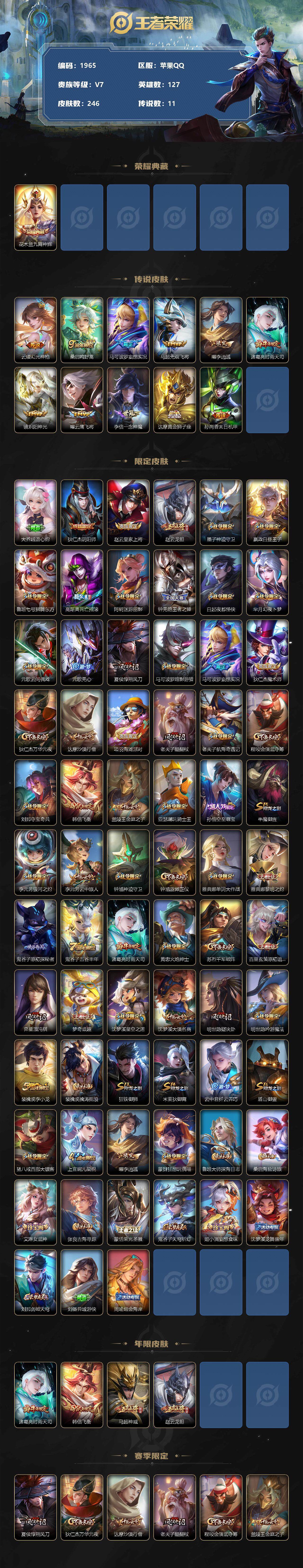 [12893988]苹果Q-V7-至尊星耀IV段位-127英雄-246皮肤-1典藏-0珍品无双-0无双-0珍品传说-11传说-66史诗