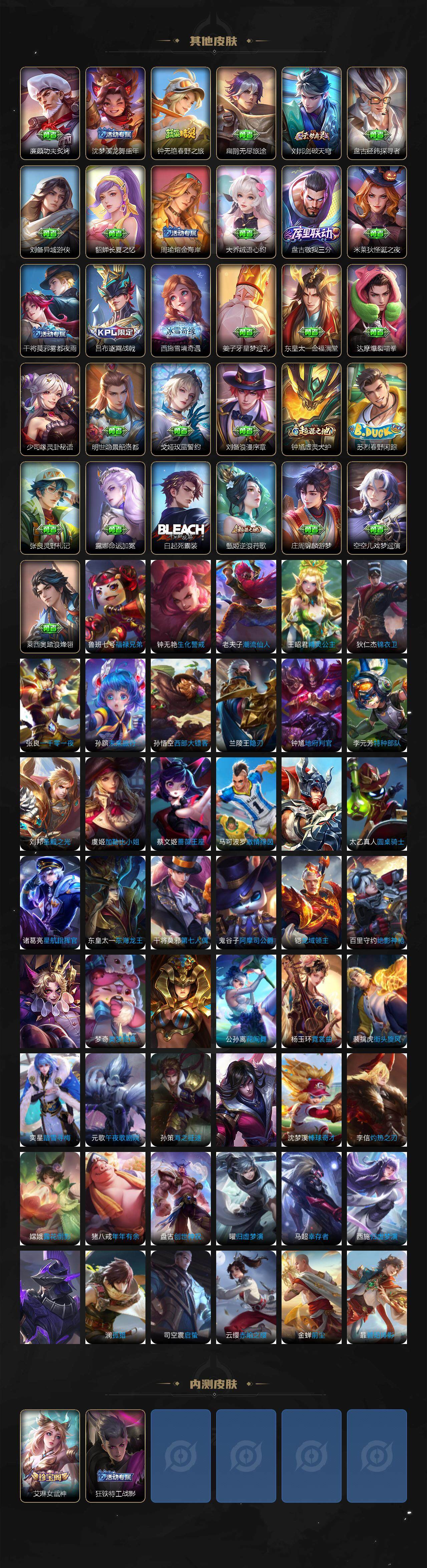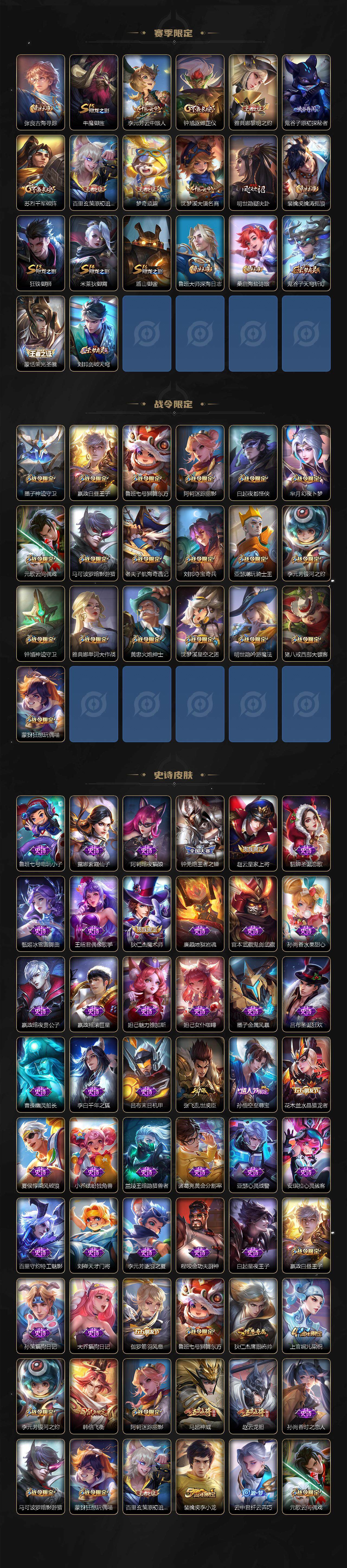 【限定皮肤】:大乔绒语心约,狄仁杰阴阳师,赵云皇家上将,赵云龙胆,墨子神迹守卫,嬴政白昼王子,鲁班七号狮舞东方,高渐离死亡摇滚,阿轲迷踪丽影,钟无艳王者之锤,白起夜都怪侠,芈月幻夜卜梦,元歌云间偶戏,元歌无心,夏侯惇朔风刀,马可波罗暗影游猎,马可波罗妄想实况,狄仁杰魔术师,狄仁杰万华元夜,达摩沙漠行僧,项羽海滩派对,老夫子醍醐杖,老夫子航海奇遇记,程咬金演武夺筹,刘邦夺宝奇兵,韩信飞衡,兰陵王金庭之子,亚瑟潮玩骑士王,孙悟空至尊宝,牛魔御旌,李元芳银河之约,李元芳云中旅人,钟馗神迹守卫,钟馗驱傩正仪,雅典娜单词大作战,雅典娜黎明之约,鬼谷子原初探秘者,鬼谷子五谷丰年,诸葛亮时雨天司,黄忠火炮绅士,苏烈千军破阵,百里玄策原初追逐者,弈星混沌棋,梦奇顽趣,沈梦溪星空之诺,沈梦溪大漠名商,明世隐疑决卦,明世隐吟游魔法,裴擒虎李小龙,裴擒虎擒涛扼浪,狂铁御狮,米莱狄御霄,云中君纤云弄巧,盾山御銮,猪八戒西部大镖客,上官婉儿梁祝,曜李逍遥 ,蒙犽狂想玩偶喵,鲁班大师探海日志,桑启海盐诗旅,艾琳女武神,张良古海寻踪,蒙恬荣光圣徽,鬼谷子天穹祈灯,姬小满妄想食味,沈梦溪龙舞盛年,刘邦剑破天穹,刘备异域游侠,周瑜熔金海岸