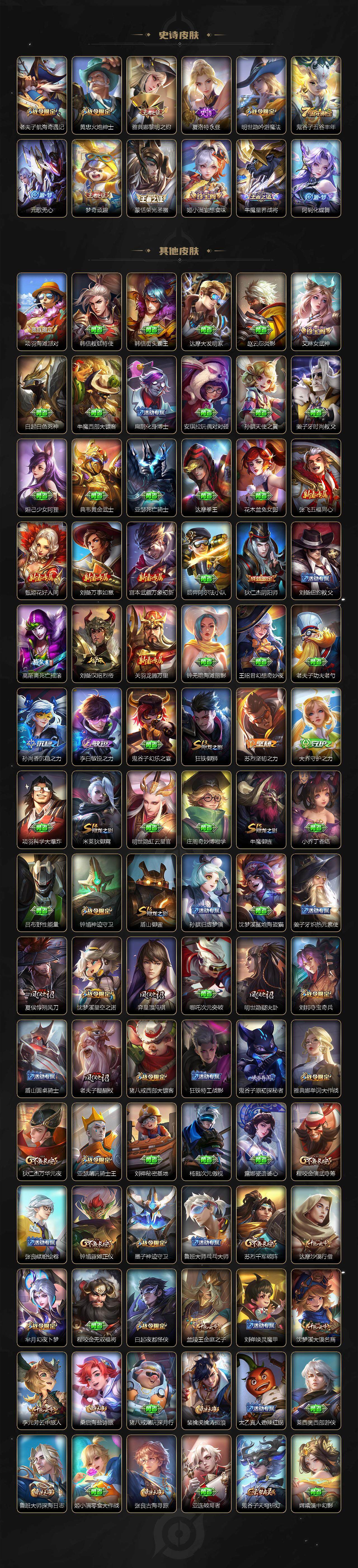 伽罗箭羽风息,李元芳逐浪之夏,大乔猫狗日记,孙策猫狗日记,露娜紫霞仙子,诸葛亮黄金分割率,王昭君偶像歌手,孙尚香时之恋人,阿轲暗夜猫娘,吕布末日机甲,鲁班七号电玩小子,嬴政摇滚巨星,刘禅天才门将,白起星夜王子,安琪拉心灵骇客,程咬金功夫厨神,兰陵王暗隐猎兽者,曹操幽灵船长,宫本武藏鬼剑武藏,亚瑟心灵战警,廉颇地狱岩魂,小乔缤纷独角兽,夏侯惇乘风破浪,花木兰水晶猎龙者,墨子金属风暴,百里玄策原初追逐者,吕布圣诞狂欢,貂蝉圣诞恋歌,百里守约特工魅影,嬴政暗夜贵公子,雅典娜黎明之约,李白千年之狐,夏洛特永昼
