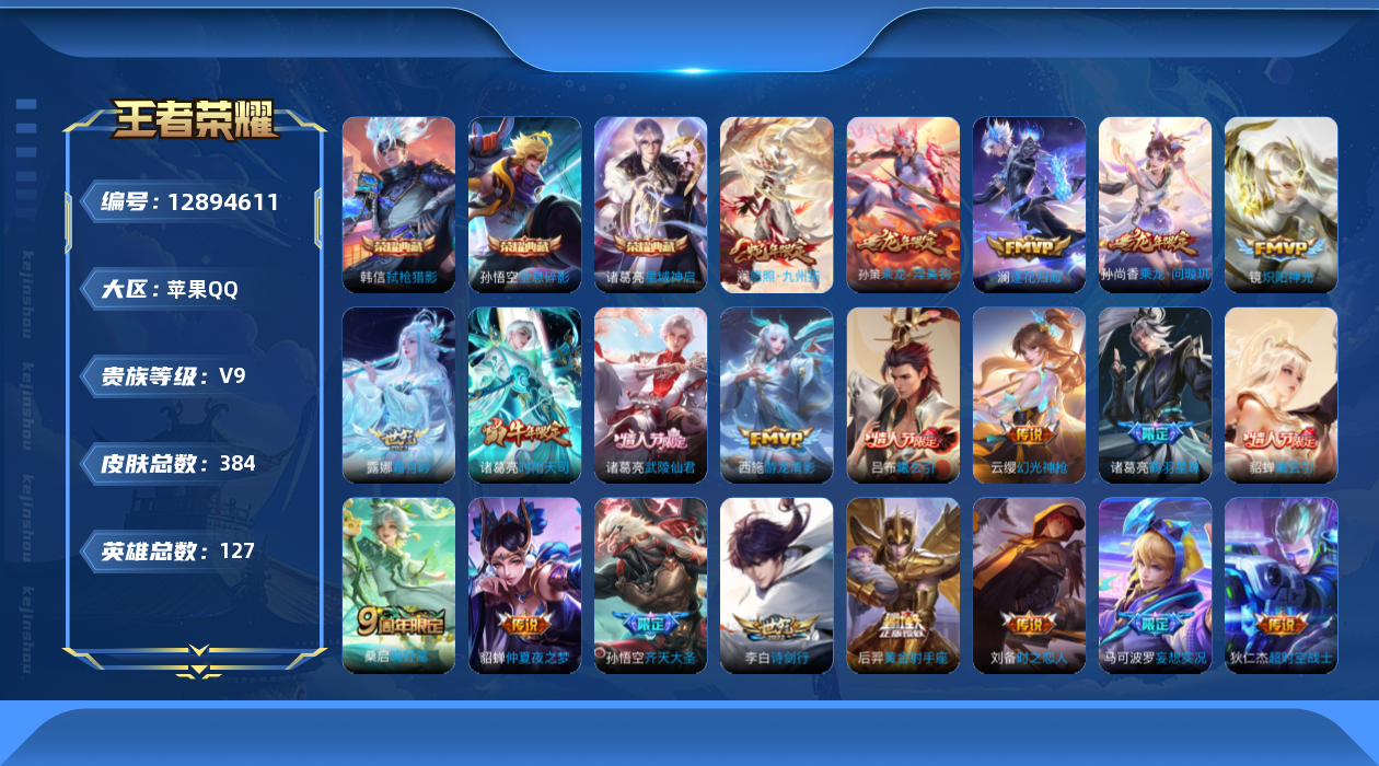 [12894611]苹果Q-V9-永恒钻石V段位-127英雄-384皮肤-3典藏-0珍品无双-0无双-0珍品传说-28传说-106史诗 【英雄全皮】:孙权全皮,太乙真人全皮,猪八戒全皮,蒙恬全皮,影全皮 【荣耀典藏】:孙悟空全息碎影,诸葛亮星域神启,韩信弑枪猎影 【传说皮肤】:澜愿照九州拓,云缨幻光神枪,桑启鸣野蒿,吕布曦玄引,貂蝉曦玄引,孙尚香乘龙问璇玑,孙策乘龙淬吴钩,澜逐花归海,露娜霜月吟,马可波罗妄想实况,诸葛亮鹤羽星尊,花木兰燃星之曲,孙悟空齐天大圣,李白诗剑行,西施游龙清影,周瑜音你心动,小乔音你心动,诸葛亮时雨天司,铠绛天战甲,镜炽阳神光,虞姬启明星使,刘备时之恋人,花木兰冠军飞将,梦奇胖达荣荣,后羿黄金射手座,诸葛亮武陵仙君,貂蝉仲夏夜之梦,狄仁杰超时空战士 【限定皮肤】:白起狰,大乔绒语心约,姜子牙天穹之誓,狄仁杰阴阳师,赵云皇家上将,赵云引擎之心,墨子神迹守卫,嬴政白昼王子,孙尚香蔷薇恋人,鲁班七号狮舞东方,庄周高山流水,高渐离玩趣恶龙,阿轲迷踪丽影,钟无艳超时空战士,扁鹊奇幻香踪,白起夜都怪侠,芈月重明,芈月幻夜卜梦,吕布猎兽之王,周瑜赤莲之焰,元歌云间偶戏,元歌无心,夏侯惇朔风刀,甄姬游园惊梦,甄姬落雪兰心,曹操烛龙,典韦穷奇,典韦蓝屏警告,马可波罗暗影游猎,马可波罗妄想实况,狄仁杰魔术师,狄仁杰万华元夜,达摩星际陆战队,达摩沙漠行僧,项羽海滩派对,老夫子醍醐杖,老夫子航海奇遇记,程咬金演武夺筹,刘邦夺宝奇兵,韩信傲雪梅枪,王昭君午后时光,兰陵王驯魔猎人,兰陵王金庭之子,花木兰燃星之曲,亚瑟潮玩骑士王,孙悟空美猴王,孙悟空至尊宝,孙悟空大圣娶亲,孙悟空孙行者,孙悟空齐天大圣,牛魔御旌,后羿圣弓游侠,李元芳银河之约,李元芳云中旅人,虞姬启明星使,钟馗神迹守卫,钟馗驱傩正仪,杨玉环遇见飞天,杨戬潮玩骑兵,女娲朔望之晖,干将莫邪胡桃夹子,干将莫邪真爱魔法,雅典娜单词大作战,雅典娜黎明之约,蔡文姬繁星吟游,太乙真人饕餮,太乙真人华丽摇滚,鬼谷子原初探秘者,鬼谷子五谷丰年,诸葛亮武陵仙君,诸葛亮时雨天司,诸葛亮鹤羽星尊,黄忠火炮绅士,铠青龙志,苏烈千军破阵,百里玄策原初追逐者,百里守约朱雀志,弈星混沌棋,梦奇顽趣,沈梦溪星空之诺,沈梦溪大漠名商,明世隐疑决卦,明世隐吟游魔法,裴擒虎李小龙,裴擒虎擒涛扼浪,狂铁御狮,狂铁电玩高手,米莱狄御霄,米莱狄胡桃异想国,云中君纤云弄