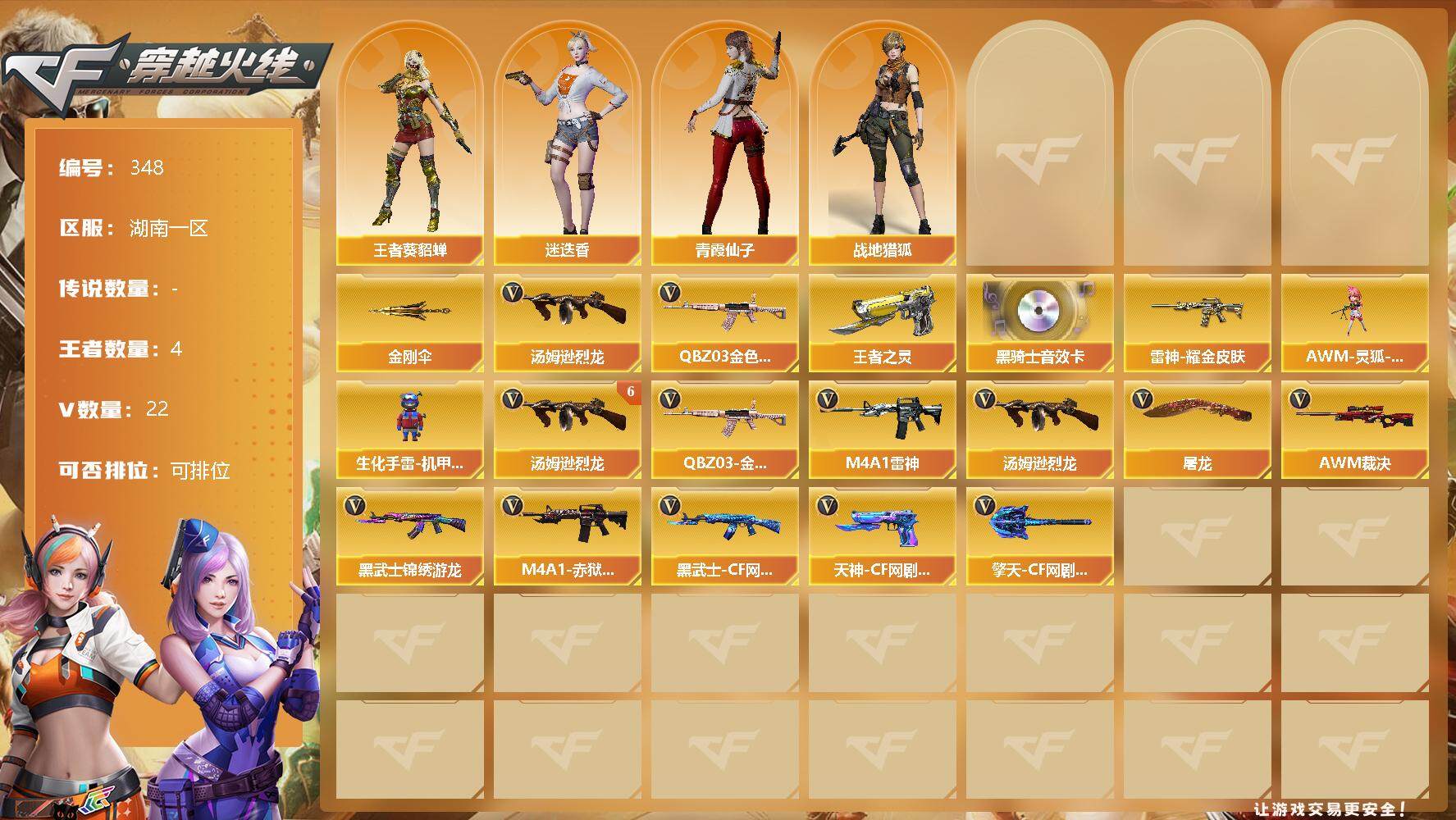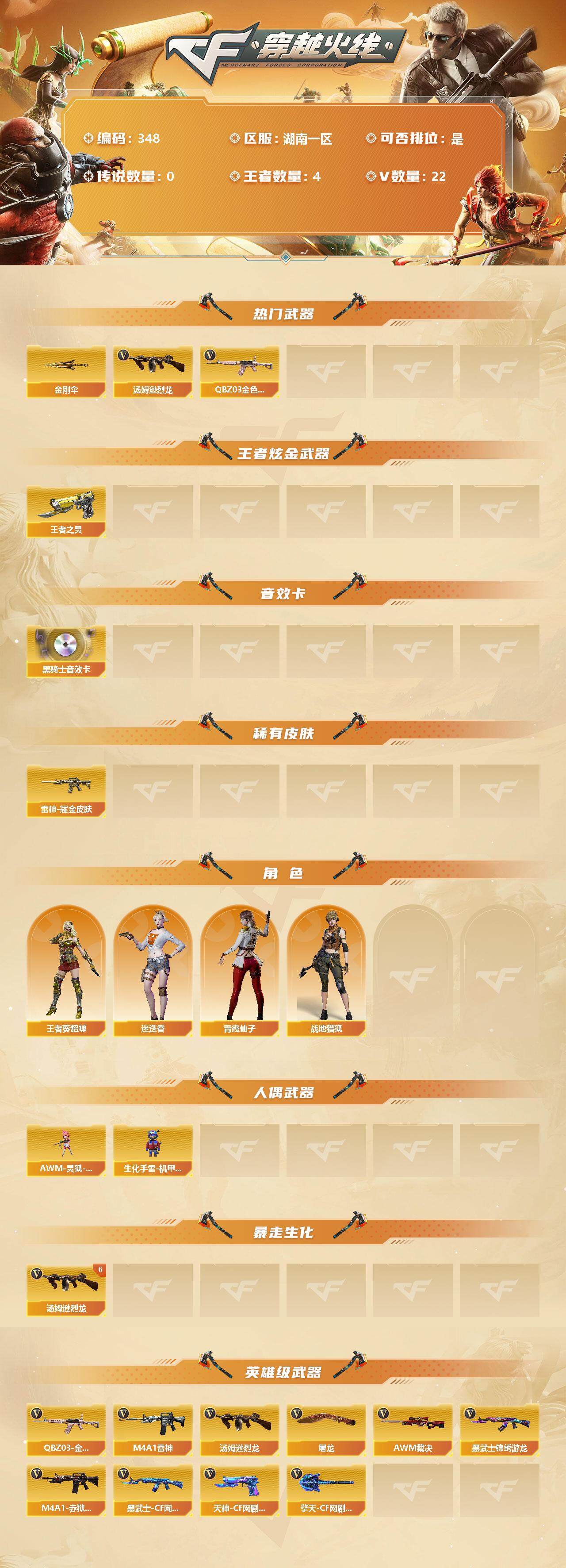 [12896225]【348】20V/100级/元帅/4王者/2英雄/QBZ03-金色蔷薇/汤姆逊-烈龙/金刚伞/王者之灵/M4A1-黑骑士音效卡/雷神-耀金皮肤/迷迭香/战地猎狐/王者-葵-貂蝉/青霞仙子/AWM-灵狐-15周年嘉年华/生化手雷-机甲核心/6烈龙/M4A1-雷神/AK47-黑武士-锦绣游龙/黑武士-CF网剧冠军/AWM-裁决/天神-CF网剧冠军/屠龙/擎天-CF网剧冠军/M4A1-赤狱骑士