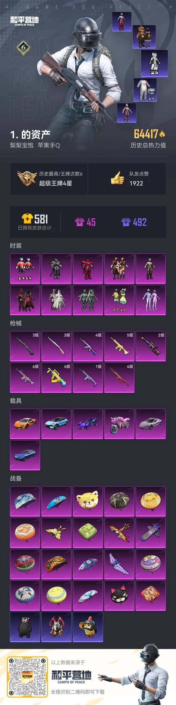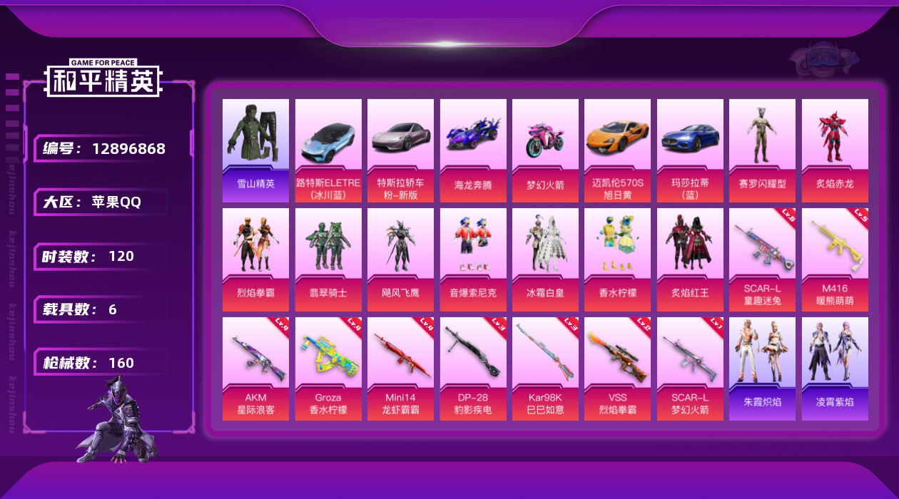 [12896868]苹果 手Q-10粉装-9特效枪-6载具-4粉色飞行器-64418热力值-6王牌印记-120套装-160枪皮