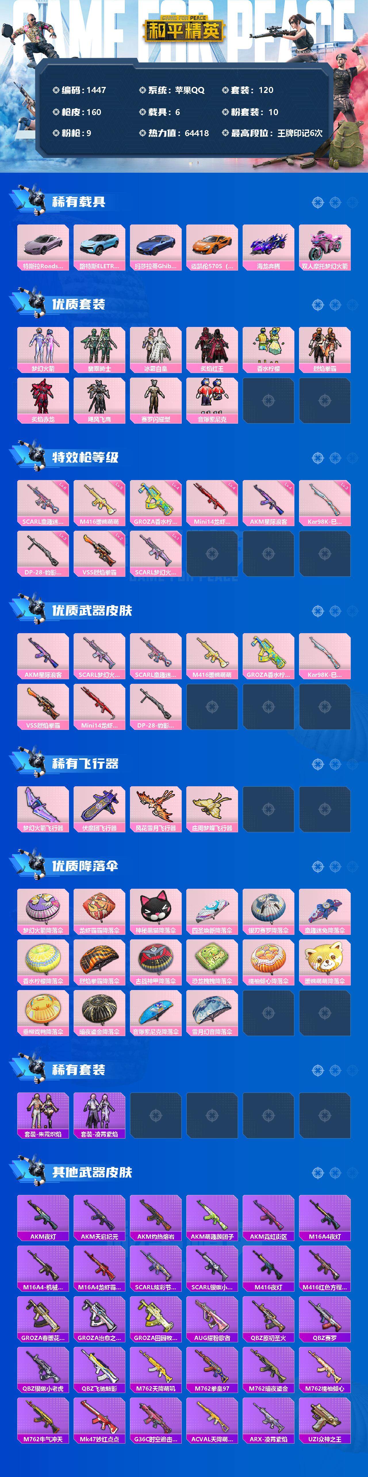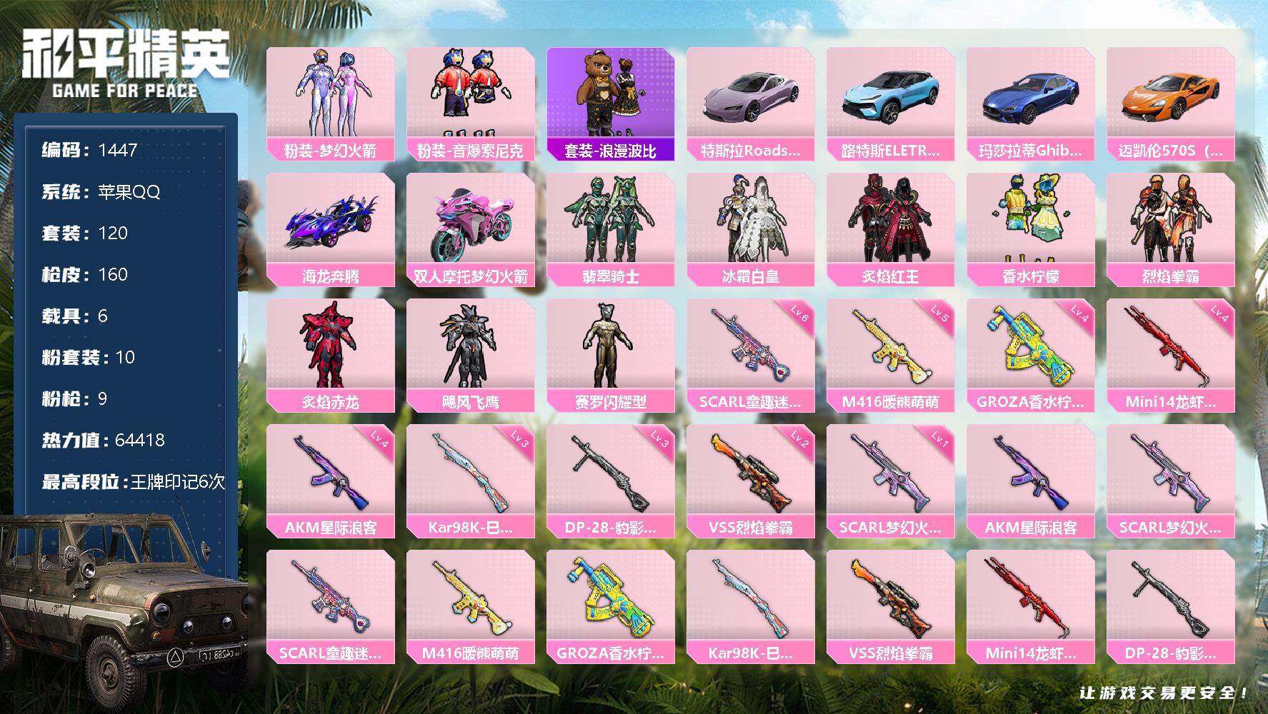 [12896868]苹果 手Q-10粉装-9特效枪-6载具-4粉色飞行器-64418热力值-6王牌印记-120套装-160枪皮 【热门品类】:粉装-梦幻火箭,粉装-音爆索尼克,套装-浪漫波比 【粉色载具】:特斯拉Roadster(沁心粉),路特斯ELETRE(冰川蓝),玛莎拉蒂Ghibli(蓝),迈凯伦570S(旭日黄),海龙奔腾,双人摩托-梦幻火箭 【粉色套装】:粉装-梦幻火箭,粉装-翡翠骑士,粉装-冰霜白皇,粉装-炙焰红王,粉装-香水柠檬,粉装-烈焰拳霸,粉装-炙焰赤龙,粉装-飓风飞鹰,角色-赛罗闪耀型,粉装-音爆索尼克 【粉色枪皮等级】:AKM-星际浪客(四级),SCAR-L-梦幻火箭(一级),SCAR-L-童趣迷兔(六级),M416-暖熊萌萌(五级),GROZA-香水柠檬(四级),Kar98K-巳巳如意(三级),VSS-烈焰拳霸(二级),Mini14-龙虾霸霸(四级),DP-28-豹影疾电(三级) 【粉色枪皮】:AKM-星际浪客,SCAR-L-梦幻火箭,SCAR-L-童趣迷兔,M416-暖熊萌萌,GROZA-香水柠檬,Kar98K-巳巳如意,VSS-烈焰拳霸,Mini14-龙虾霸霸,DP-28-豹影疾电 【粉色飞行器】:梦幻火箭飞行器,伏魔团飞行器,风花雪月飞行器,庄周梦蝶飞行器 【粉色降落伞】:梦幻火箭降落伞,龙虾霸霸降落伞,神秘黑猫降落伞,四圣焕新降落伞,银刃赛罗降落伞,童趣迷兔降落伞,香水柠檬降落伞,烈焰拳霸降落伞,古战神甲降落伞,恐龙拽拽降落伞,橘柚倾心降落伞,暖熊萌萌降落伞,垂柳戏鸭降落伞,暗夜鎏金降落伞,音爆索尼克降落伞,雪月幻音降落伞 【稀有套装】:套装-朱霞炽焰,套装-凌霄紫焰 【稀有枪皮】:AKM-夜灯,AKM-天启纪元,AKM-灼热熔岩,AKM-萌趣颜团子,AKM-霓虹街区,M16A4-夜灯,M16A4-机械英豪,M16A4-龙虾霸霸,SCAR-L-炫彩节奏,SCAR-L-银碳小老虎,M416-夜灯,M416-红色方程式,GROZA-春暖花开,GROZA-治愈之星,GROZA-田园牧歌,AUG-耀粉歌者,QBZ-原初圣火,QBZ-赛罗,QBZ-银碳小老虎,QBZ-飞驰魅影,M762-天降萌叽,M762-拳皇97,M762-暗夜鎏金,M762-橘柚倾心,M762-牛气冲天,Mk47-妙红点点,G36C-时空追击者,AC-VAL-天降萌叽,ARX-凌霄紫焰,U