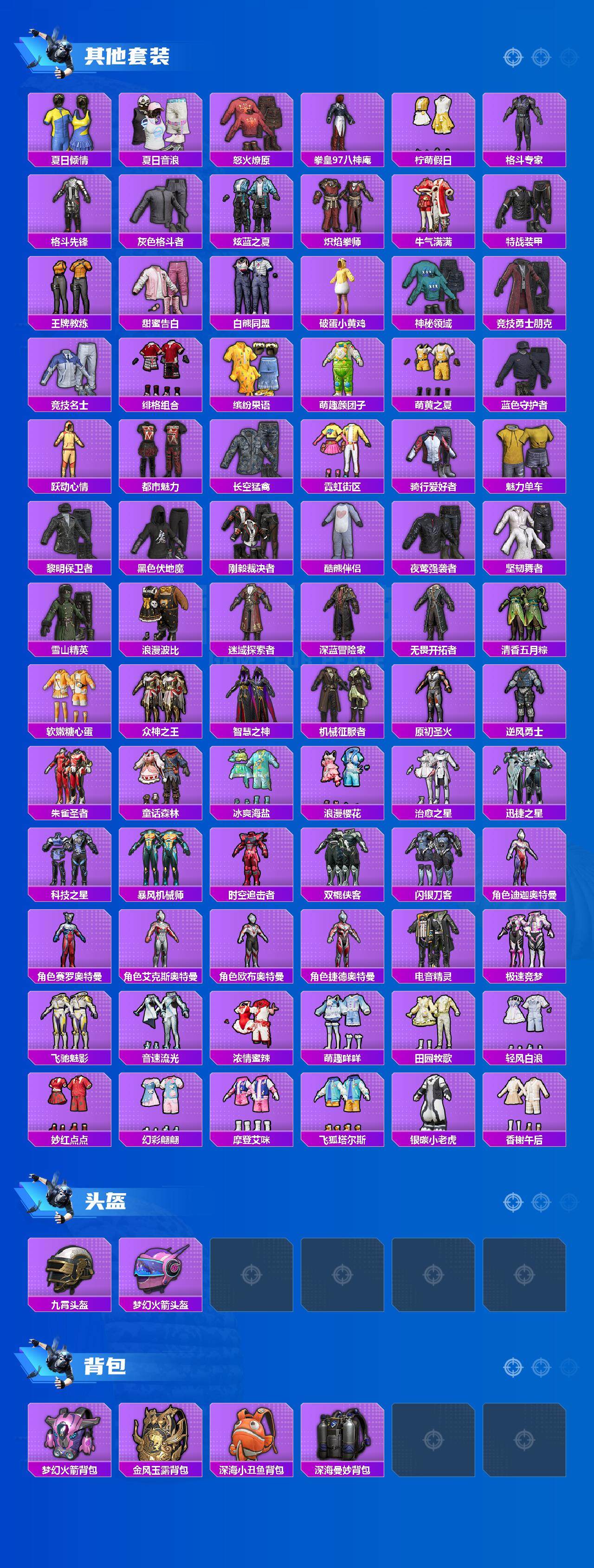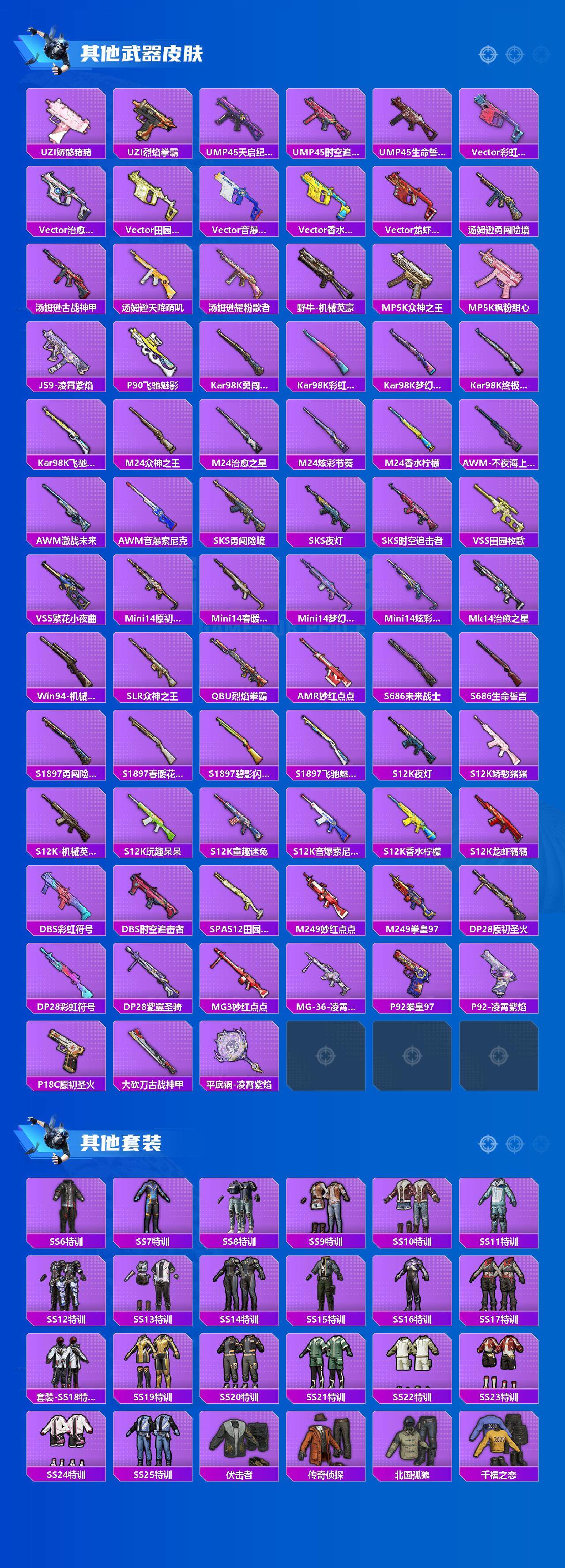 - [12214538]3粉装 4特效枪 2印记 可二次 可修改实名 女号 优质装备:AKM白勺歌姬,AKM-幽焰骑士,Kar98K-巳巳如意 热门装扮:呆萌星弥,白勺歌姬,小可学妹 稀有枪皮:DP-28-豹影疾电 六级特效枪:六级AKM-白勺歌姬 五级特效枪:五级Kar98K-巳巳如意 三级特效枪:三级AKM-幽焰骑士 一级特效枪:一级DP-28-豹影疾电 紫色装扮:SS31特训套装,极速光影,SS30特训套装,云朵鹅,雪绒豹,SS33特训套装,天籁歌者,缤纷果语,魅力单车,破蛋小黄鸡,异域银装,青团波波,糖糖葫芦,大橘大利,星渊小夜曲,蓝冰羽,紫幽梦,SS32特训服(SS32特训套装),绯格组合,新风雅兰 优质战备:幽焰列车飞行器,幽焰骑士降落伞,幻彩电音降落伞,智耀战神降落伞,白勺歌姬降落伞