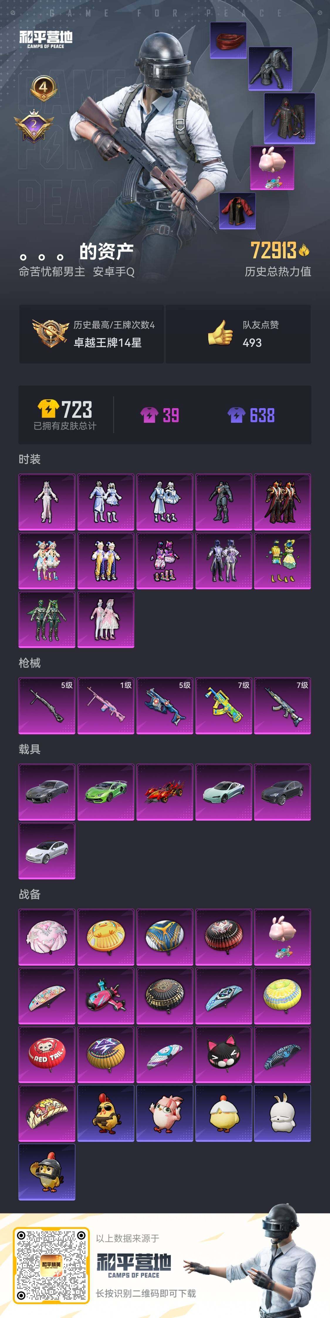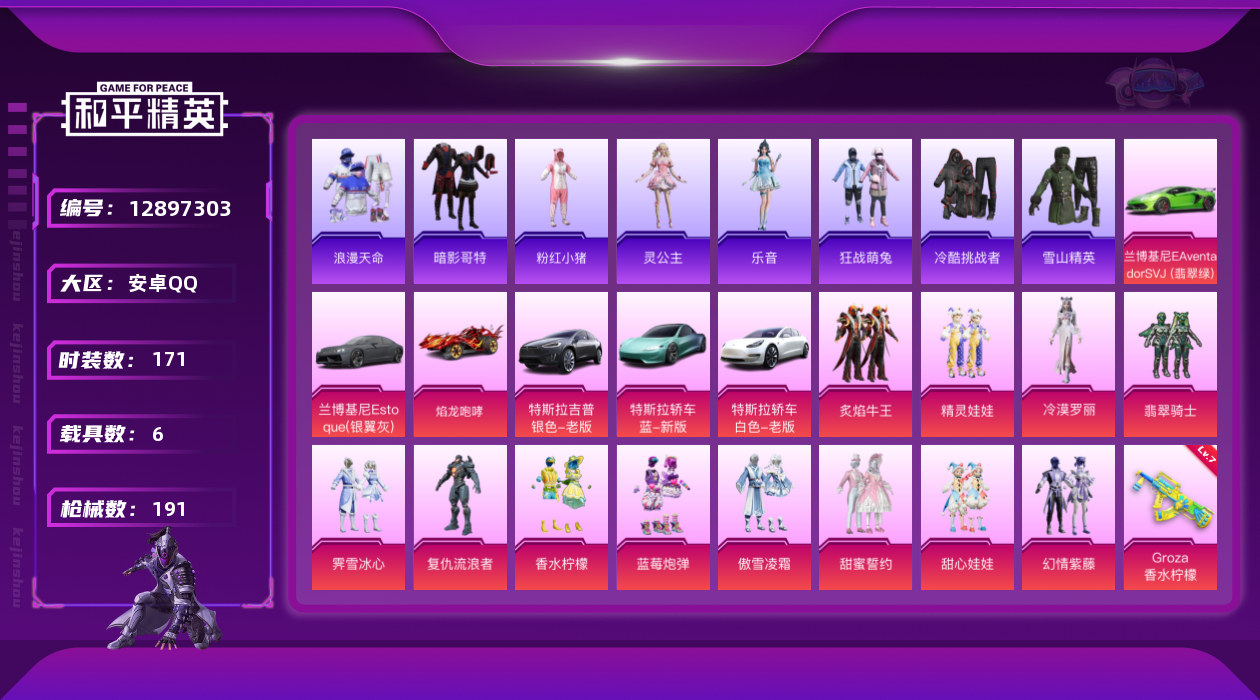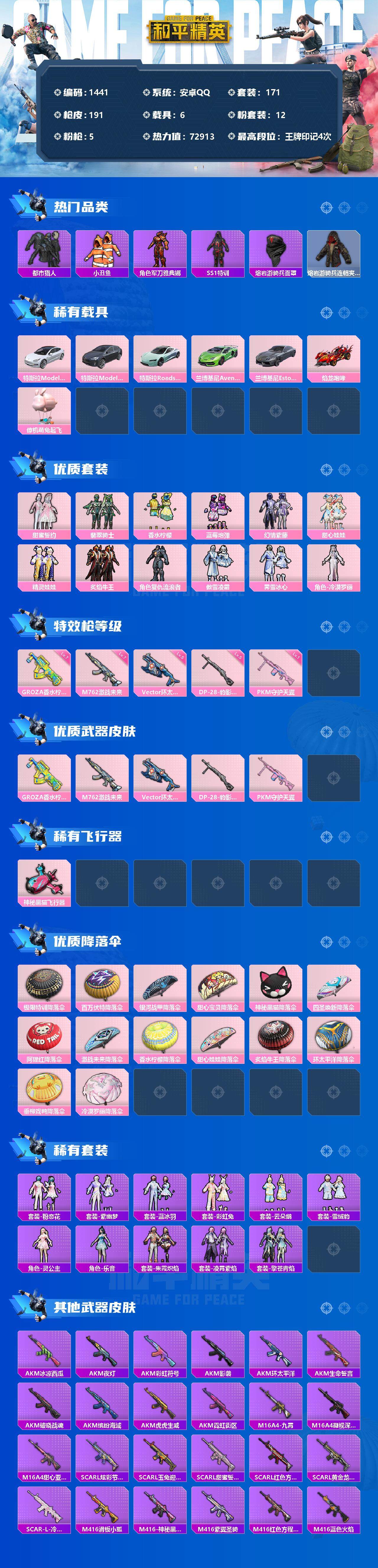 [12897303]安卓 手Q-12粉装-5特效枪-6载具-1粉色飞行器-72913热力值-4王牌印记-171套装-191枪皮