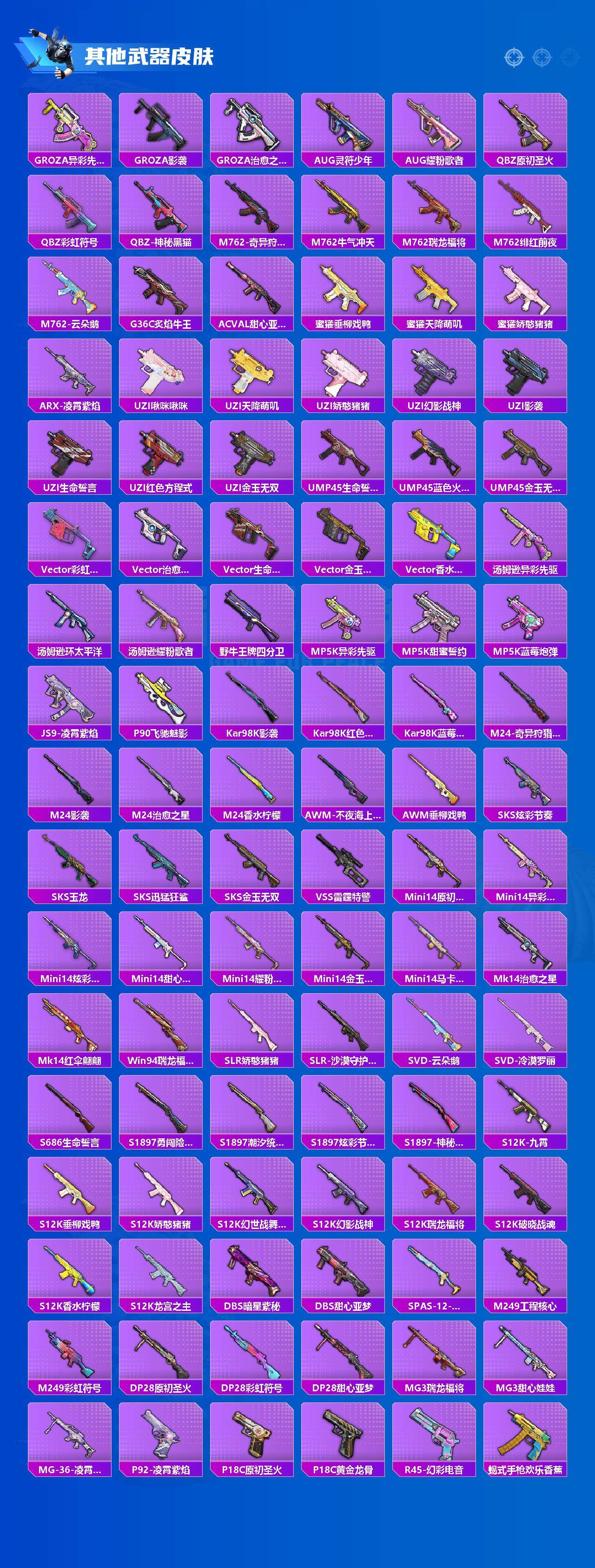 【稀有枪皮】:AKM-冰凉西瓜,AKM-夜灯,AKM-彩虹符号,AKM-影袭,AKM-环太平洋,AKM-生命誓言,AKM-破晓战魂,AKM-缤纷海域,AKM-虎虎生威,AKM-霓虹街区,M16A4-九霄,M16A4-凝视深渊,M16A4-甜心亚梦,SCAR-L-炫彩节奏,SCAR-L-玉兔迎春,SCAR-L-甜蜜誓约,SCAR-L-红色方程式,SCAR-L-黄金龙骨,SCAR-L-冷漠罗丽,M416-滑板小狐,M416-神秘黑猫,M416-紫翼圣骑,M416-红色方程式,M416-蓝色火焰,GROZA-异彩先驱,GROZA-影袭,GR