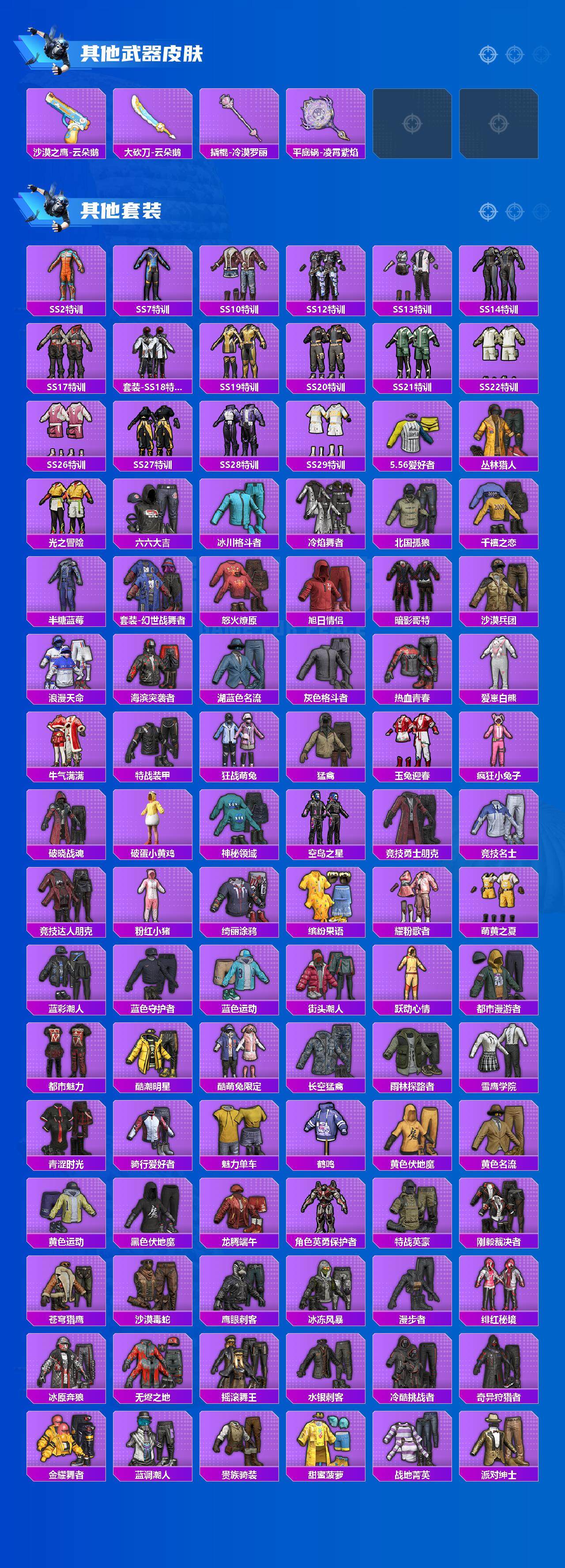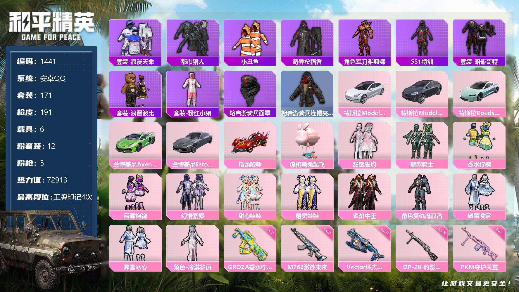 [12897303]安卓 手Q-12粉装-5特效枪-6载具-1粉色飞行器-72913热力值-4王牌印记-171套装-191枪皮 【热门品类】:套装-浪漫天命,套装-都市猎人,套装-小丑鱼,套装-奇异狩猎者,角色-军刀雅典娜,套装-SS1特训,套装-暗影哥特,套装-浪漫波比,套装-粉红小猪,熔岩游骑兵面罩,熔岩游骑兵连帽夹克 【粉色载具】:特斯拉Model 3(珍珠白),特斯拉Model X(冷光银),特斯拉Roadster(水滴蓝),兰博基尼Aventador SVJ(翡翠绿),兰博基尼Estoque(银翼灰),焰龙咆哮,僚机-萌兔起飞 【粉色套装】:粉装-甜蜜誓约,粉装-翡翠骑士,粉装-香水柠檬,粉装-蓝莓炮弹,粉装-幻情紫藤,粉装-甜心娃娃,粉装-精灵娃娃,粉装-炙焰牛王,角色-复仇流浪者,粉装-傲雪凌霜,粉装-霁雪冰心,角色-冷漠罗丽 【粉色枪皮等级】:GROZA-香水柠檬(七级),M762-激战未来(七级),Vector-环太平洋(五级),DP-28-豹影疾电(五级),PKM-守护天翼(一级) 【粉色枪皮】:GROZA-香水柠檬,M762-激战未来,Vector-环太平洋,DP-28-豹影疾电,PKM-守护天翼 【粉色飞行器】:神秘黑猫飞行器 【粉色降落伞】:极限特训降落伞,百万伏特降落伞,银河战甲降落伞,甜心宝贝降落伞,神秘黑猫降落伞,四圣焕新降落伞,阿狸红降落伞,激战未来降落伞,香水柠檬降落伞,甜心娃娃降落伞,炙焰牛王降落伞,环太平洋降落伞,垂柳戏鸭降落伞,冷漠罗丽降落伞 【稀有套装】:套装-粉恋花,套装-紫幽梦,套装-蓝冰羽,套装-彩虹兔,套装-云朵鹅,套装-雪绒豹,角色-灵公主,角色-乐音,套装-朱霞炽焰,套装-凌霄紫焰,套装-擎苍青焰 【稀有枪皮】:AKM-冰凉西瓜,AKM-夜灯,AKM-彩虹符号,AKM-影袭,AKM-环太平洋,AKM-生命誓言,AKM-破晓战魂,AKM-缤纷海域,AKM-虎虎生威,AKM-霓虹街区,M16A4-九霄,M16A4-凝视深渊,M16A4-甜心亚梦,SCAR-L-炫彩节奏,SCAR-L-玉兔迎春,SCAR-L-甜蜜誓约,SCAR-L-红色方程式,SCAR-L-黄金龙骨,SCAR-L-冷漠罗丽,M416-滑板小狐,M416-神秘黑猫,M416-紫翼圣骑,M416-红色方程式,M416-蓝色火焰,GROZA-异彩先驱,GROZA-影袭,GR