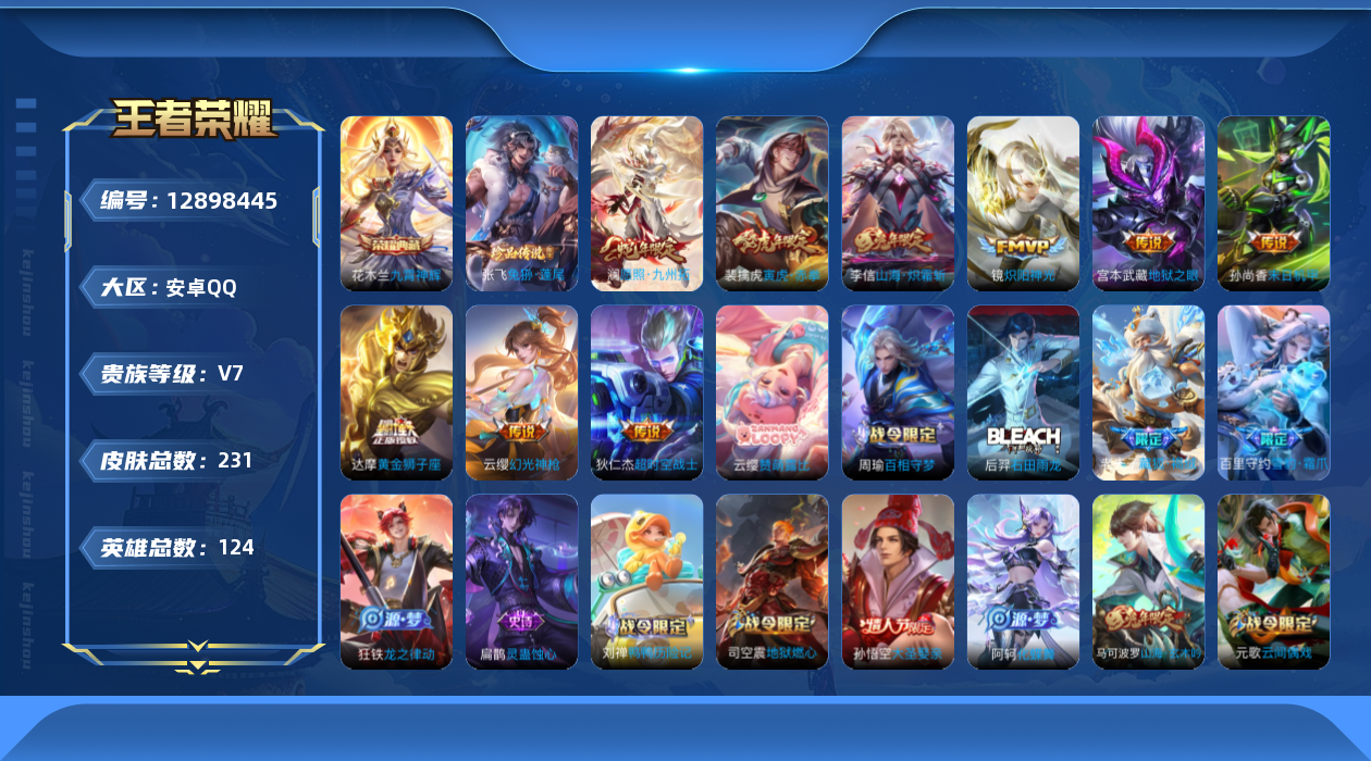 [12898445]安卓Q-V7-最强王者段位-124英雄-231皮肤-1典藏-0珍品无双-0无双-1珍品传说-9传说-73史诗