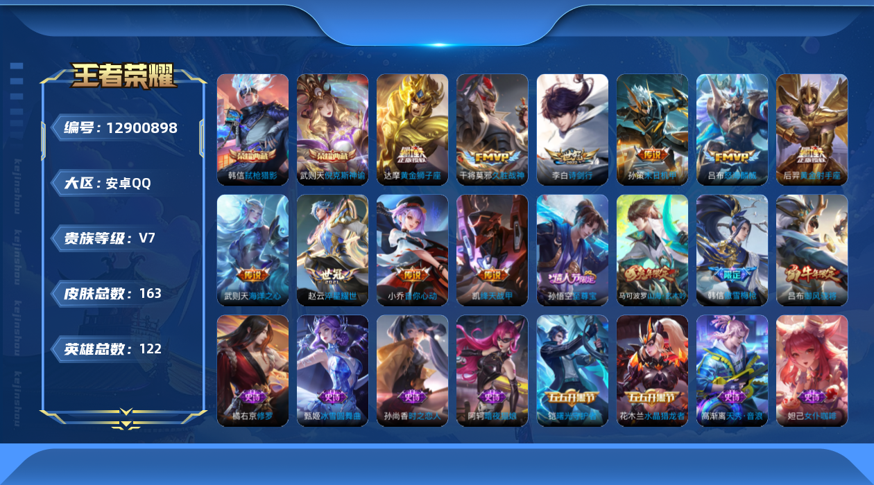 [12900898]安卓Q-V7-尊贵铂金IV段位-120英雄-163皮肤-2典藏-0珍品无双-0无双-0珍品传说-10传说-41史诗