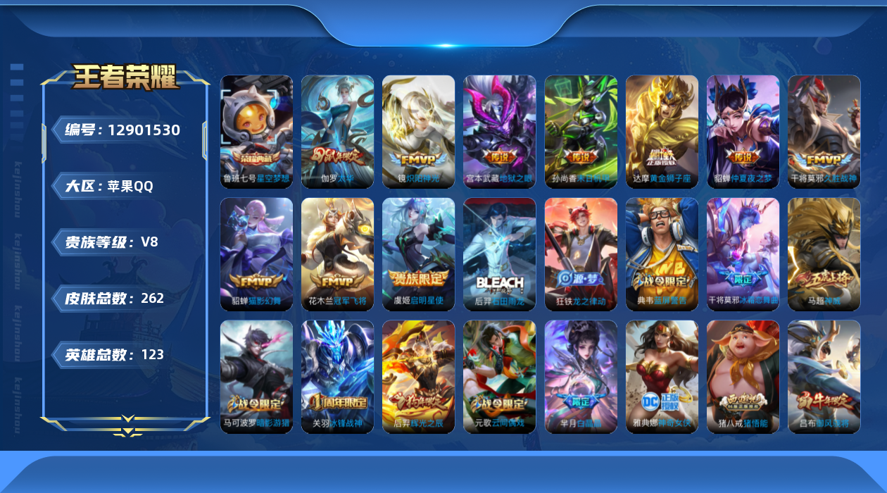[12901530]苹果Q-V6-永恒钻石III段位-122英雄-262皮肤-1典藏-0珍品无双-0无双-0珍品传说-10传说-75史诗
