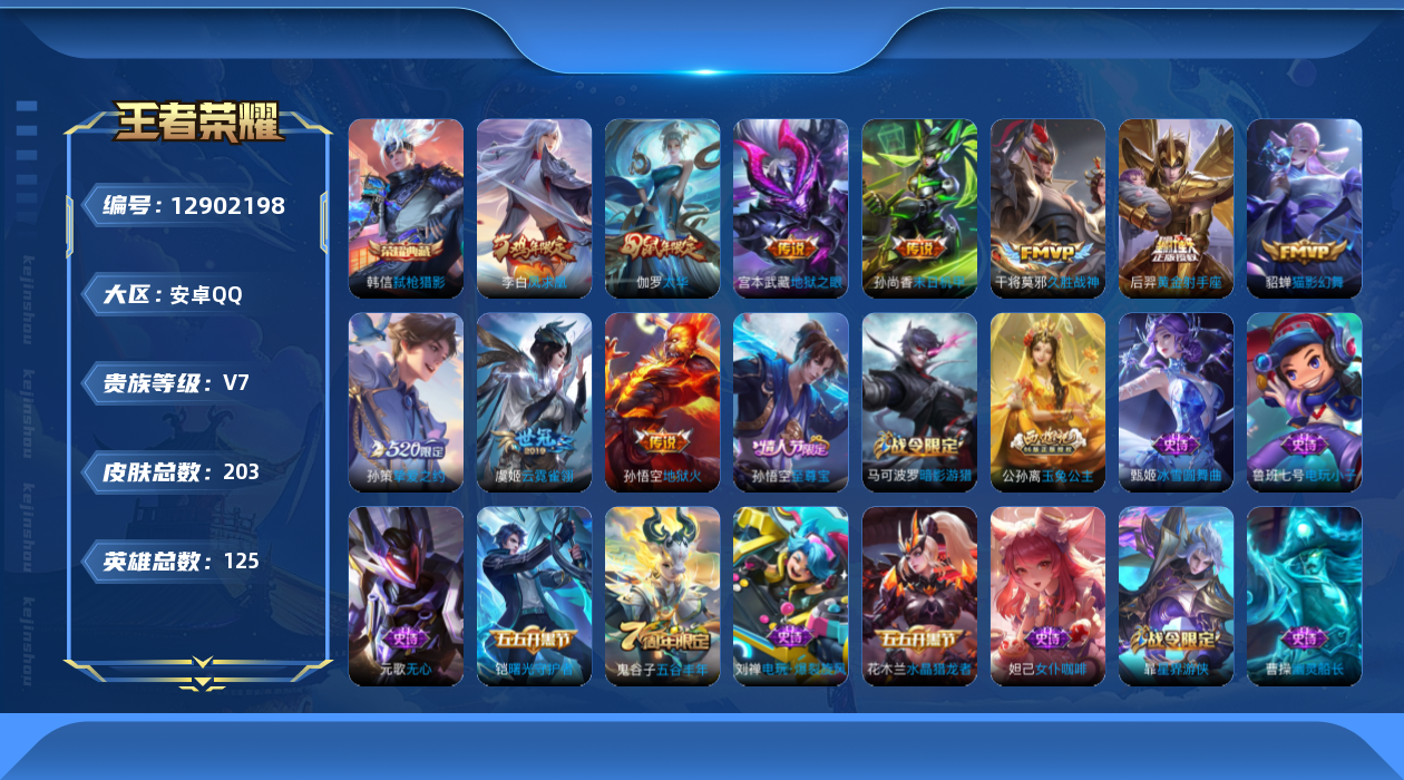[12902198]安卓Q-V0-永恒钻石IV段位-125英雄-203皮肤-1典藏-0珍品无双-0无双-0珍品传说-10传说-41史诗
