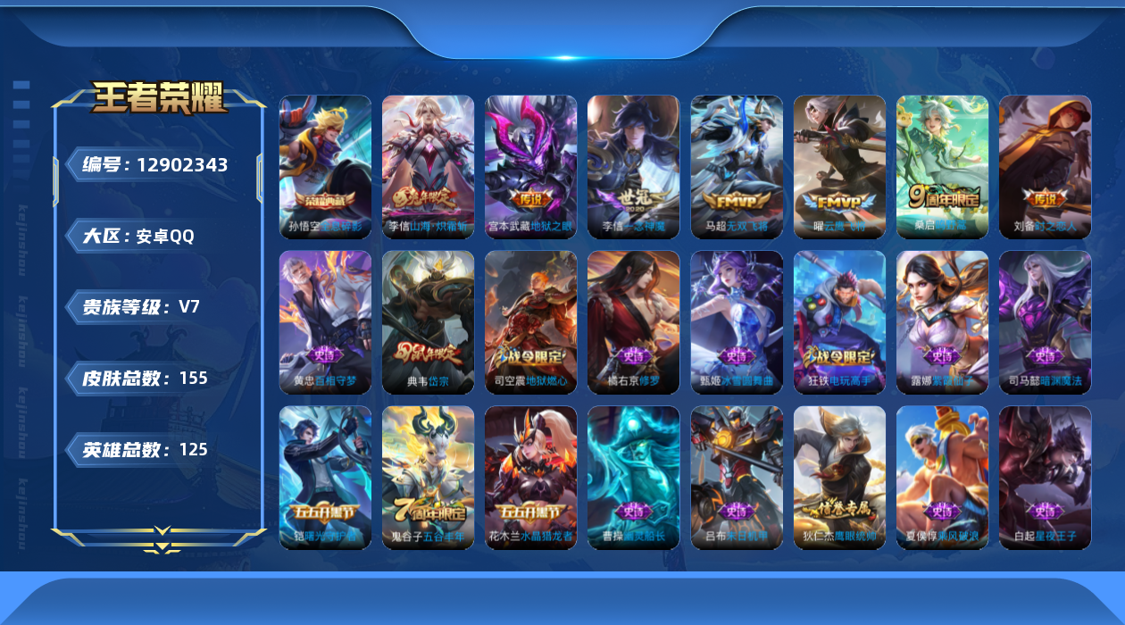[12902343]安卓Q-V6-至尊星耀V段位-125英雄-155皮肤-1典藏-0珍品无双-0无双-0珍品传说-7传说-38史诗 【英雄全皮】:李信全皮,蒙恬全皮 【荣耀典藏】:孙悟空全息碎影 【传说皮肤】:桑启鸣野蒿,李信山海炽霜斩,马超无双飞将,曜云鹰飞将,李信一念神魔,刘备时之恋人,宫本武藏地狱之眼 【限定皮肤】:姜子牙天穹之誓,狄仁杰阴阳师,赵云皇家上将,高渐离玩趣恶龙,钟无艳超时空战士,甄姬落雪兰心,典韦岱宗,狄仁杰魔术师,达摩沙漠行僧,项羽海滩派对,王昭君午后时光,兰陵王金庭之子,李元芳云中旅人,鬼谷子五谷丰年,沈梦溪大漠名商,裴擒虎擒涛扼浪,狂铁电玩高手,李信山海炽霜斩,上官婉儿梁祝,鲁班大师探海日志,桑启海盐诗旅,艾琳流音漫舞,司空震地狱燃心,阿古朵江河有灵,张良古海寻踪,蒙恬荣光圣徽,妲己灵卜魔法,鬼谷子天穹祈灯,沈梦溪龙舞盛年,刘邦剑破天穹,程咬金群星魔术团,周瑜熔金海岸 【年限皮肤】:典韦岱宗,李信山海炽霜斩 【赛季限定】:达摩沙漠行僧,兰陵王金庭之子,张良古海寻踪,李元芳云中旅人,沈梦溪大漠名商,裴擒虎擒涛扼浪,鲁班大师探海日志,桑启海盐诗旅,鬼谷子天穹祈灯,蒙恬荣光圣徽,刘邦剑破天穹,姜子牙天穹之誓 【战令限定】:钟无艳超时空战士,甄姬落雪兰心,王昭君午后时光,艾琳流音漫舞,狂铁电玩高手,司空震地狱燃心,妲己灵卜魔法 【史诗皮肤】:露娜紫霞仙子,赵云皇家上将,赵云未来纪元,貂蝉圣诞恋歌,甄姬冰雪圆舞曲,王昭君偶像歌手,狄仁杰魔术师,宫本武藏鬼剑武藏,孙尚香水果甜心,嬴政摇滚巨星,妲己魅力维加斯,吕布圣诞狂欢,曹操幽灵船长,吕布末日机甲,花木兰水晶猎龙者,夏侯惇乘风破浪,亚瑟心灵战警,雅典娜冰冠公主,铠曙光守护者,蔡文姬舞动绿茵,李元芳逐浪之夏,程咬金功夫厨神,白起星夜王子,狄仁杰鹰眼统帅,上官婉儿梁祝,典韦岱宗,橘右京修罗,司马懿暗渊魔法,狂铁电玩高手,钟无艳超时空战士,鬼谷子五谷丰年,司空震地狱燃心,阿古朵江河有灵,妲己灵卜魔法,蒙恬荣光圣徽,牛魔星界战将,孙膑茶境仙,弈星万物之道,黄忠百相守梦 【其他皮肤】:项羽海滩派对,韩信教廷特使,韩信街头霸王,赵云忍炎影,芈月红桃皇后,白起白色死神,宫本武藏未来纪元,安琪拉玩偶对对碰,典韦黄金武士,亚瑟死亡骑士,达摩拳王,花木兰兔女郎,刘备万事如意,宫本武藏万象初新,后羿阿尔法小队,狄仁杰阴阳师,刘备汉昭烈帝,关