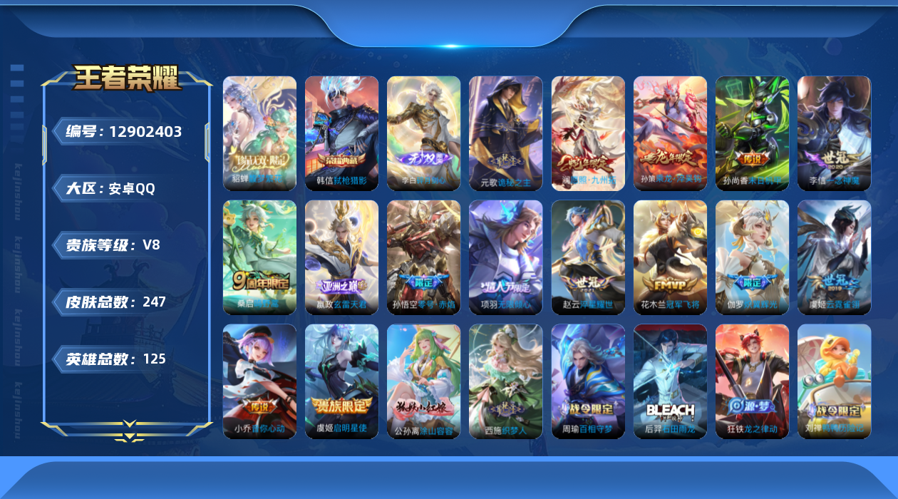 [12902403]安卓Q-V8-最强王者段位-125英雄-247皮肤-1典藏-1珍品无双-1无双-0珍品传说-15传说-59史诗