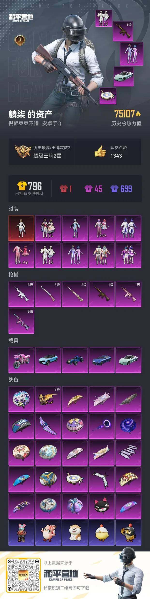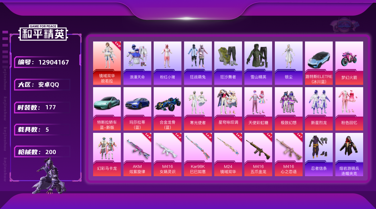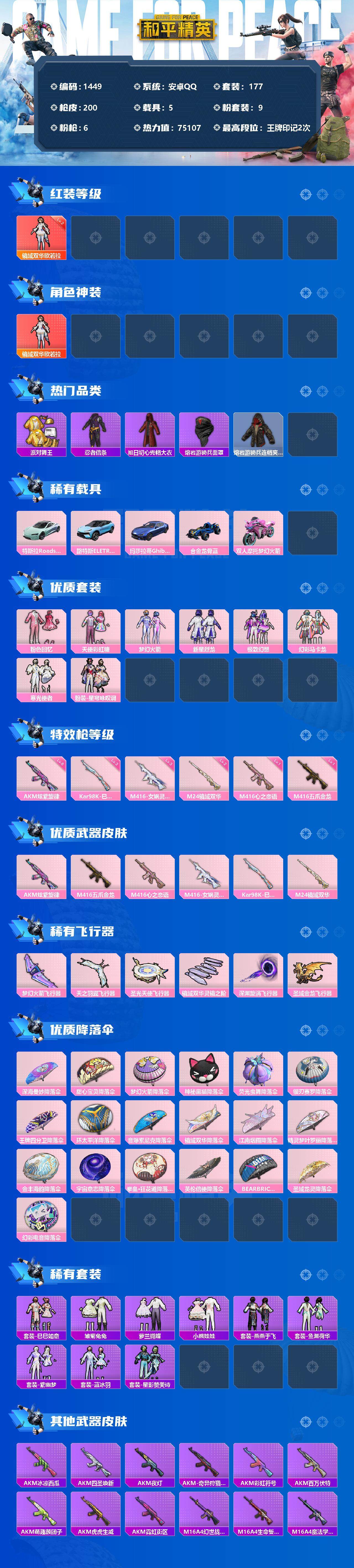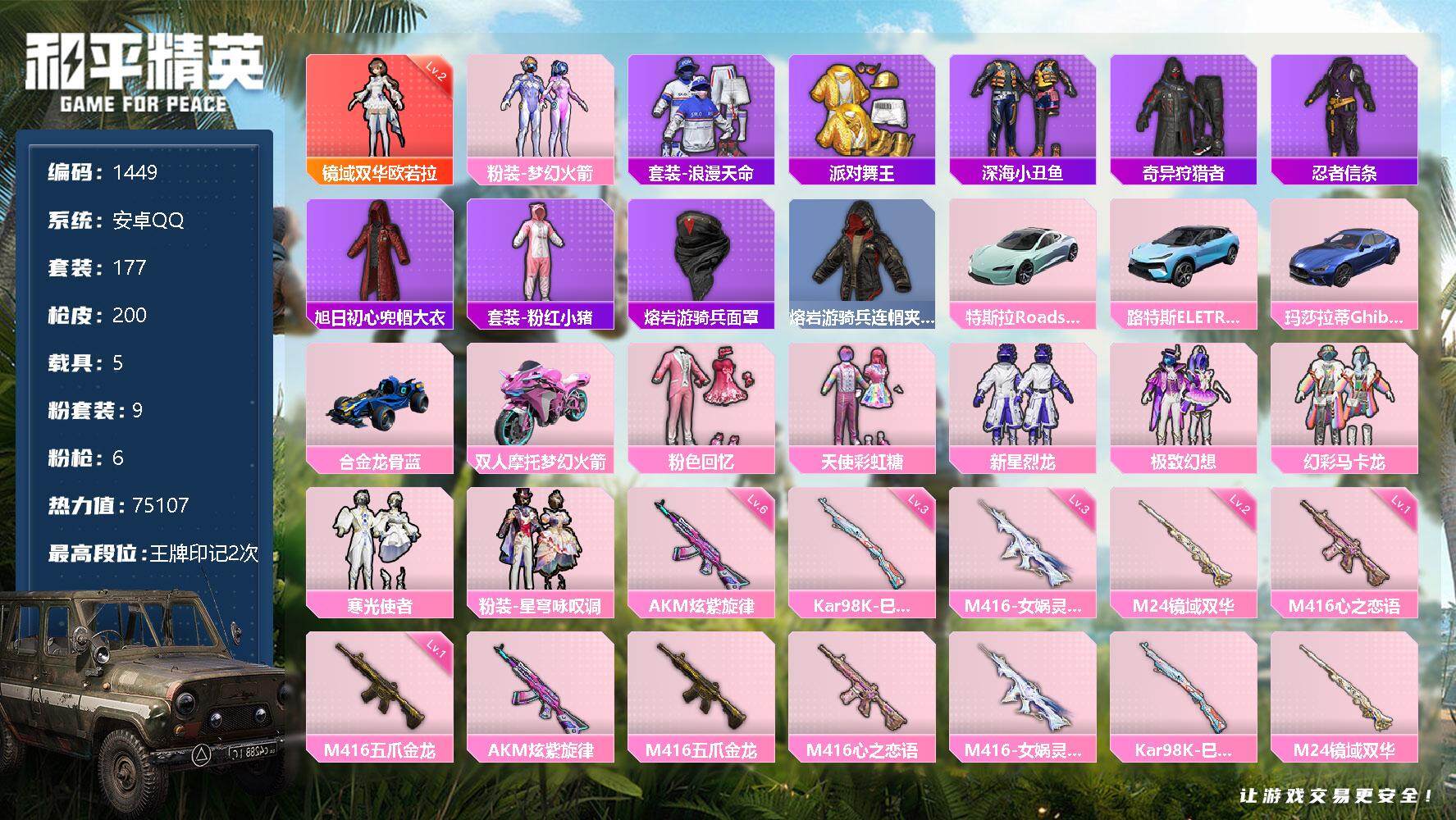 [12904167]安卓 手Q-1神装-9粉装-6特效枪-5载具-6粉色飞行器-75107热力值-2王牌印记-177套装-200枪皮