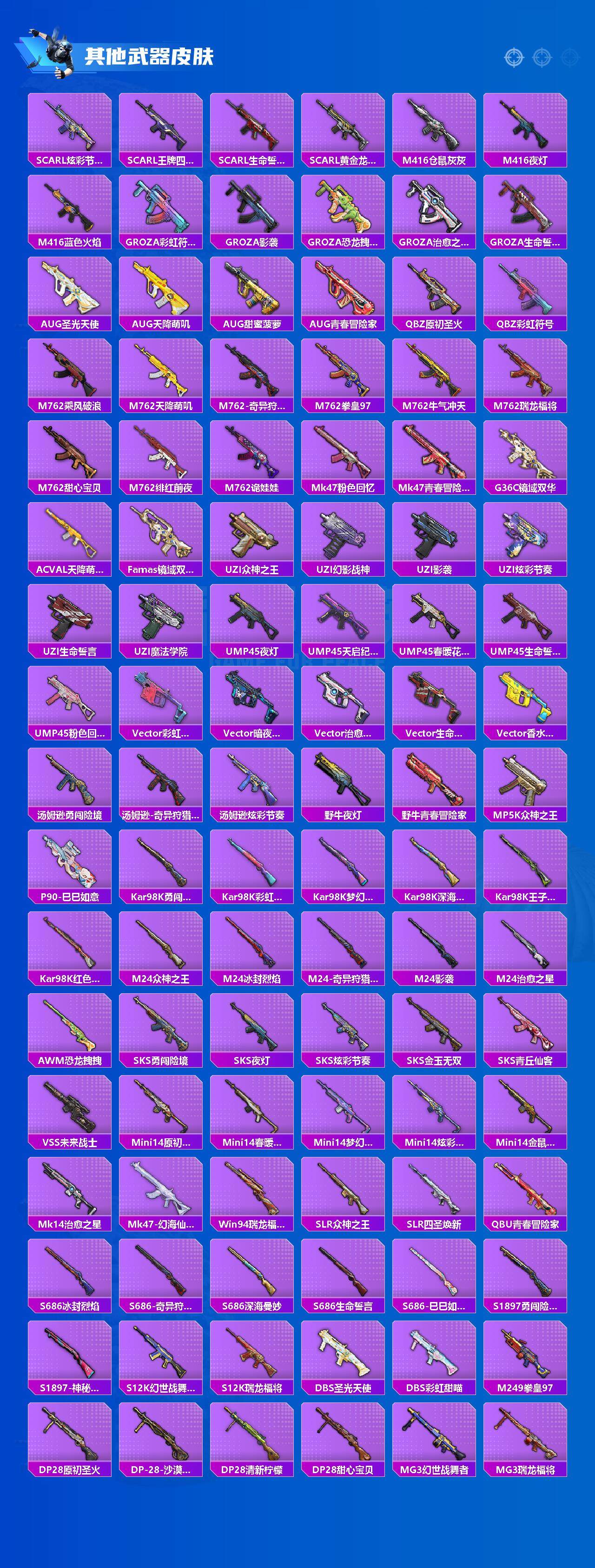 【稀有枪皮】:AKM-冰凉西瓜,AKM-四圣焕新,AKM-夜灯,AKM-奇异狩猎者,AKM-彩虹符号,AKM-百万伏特,AKM-萌趣颜团子,AKM-虎虎生威,AKM-霓虹街区,M16A4-幻世战舞者,M16A4-生命誓言,M16A4-魔法学院,SCAR-L-炫彩节奏,SCAR-L-王牌四分卫,SCAR-L-生命誓言,SCAR-L-黄金龙骨,M416-仓鼠灰灰,M416-夜灯,M416-蓝色火焰