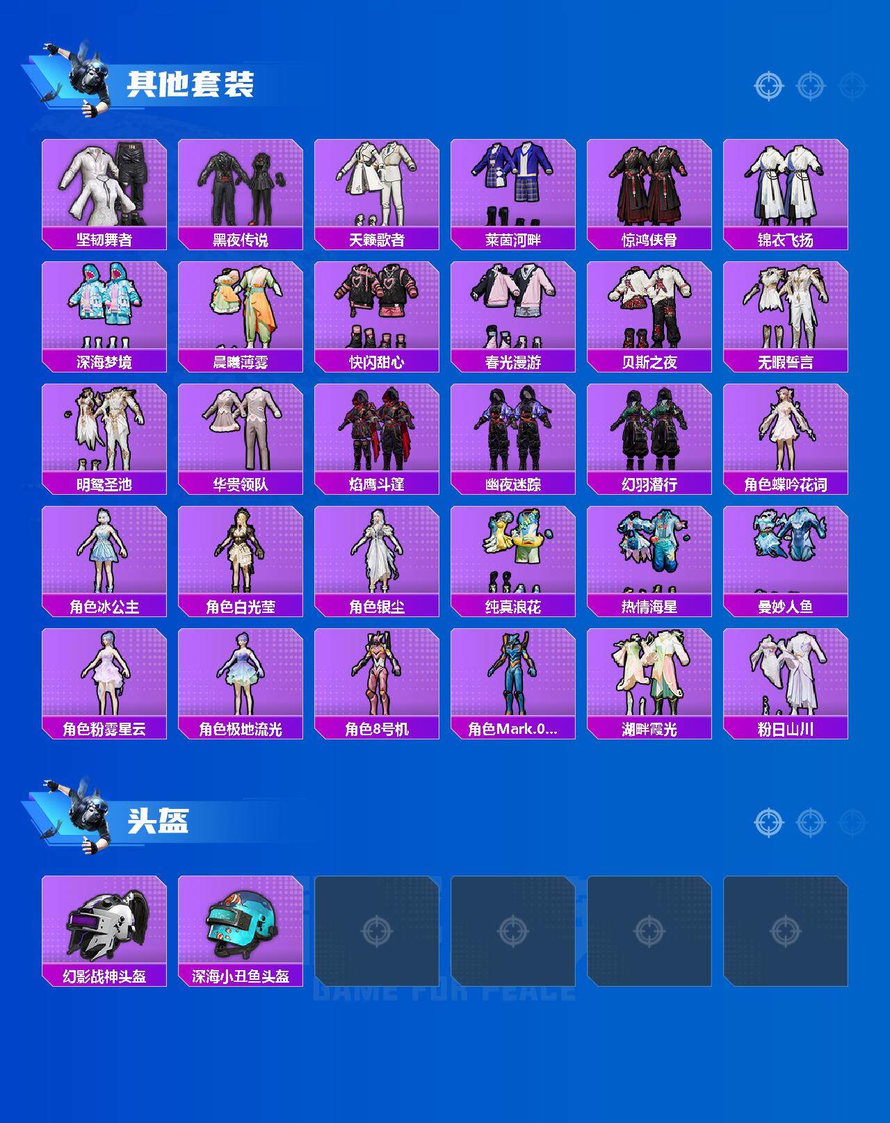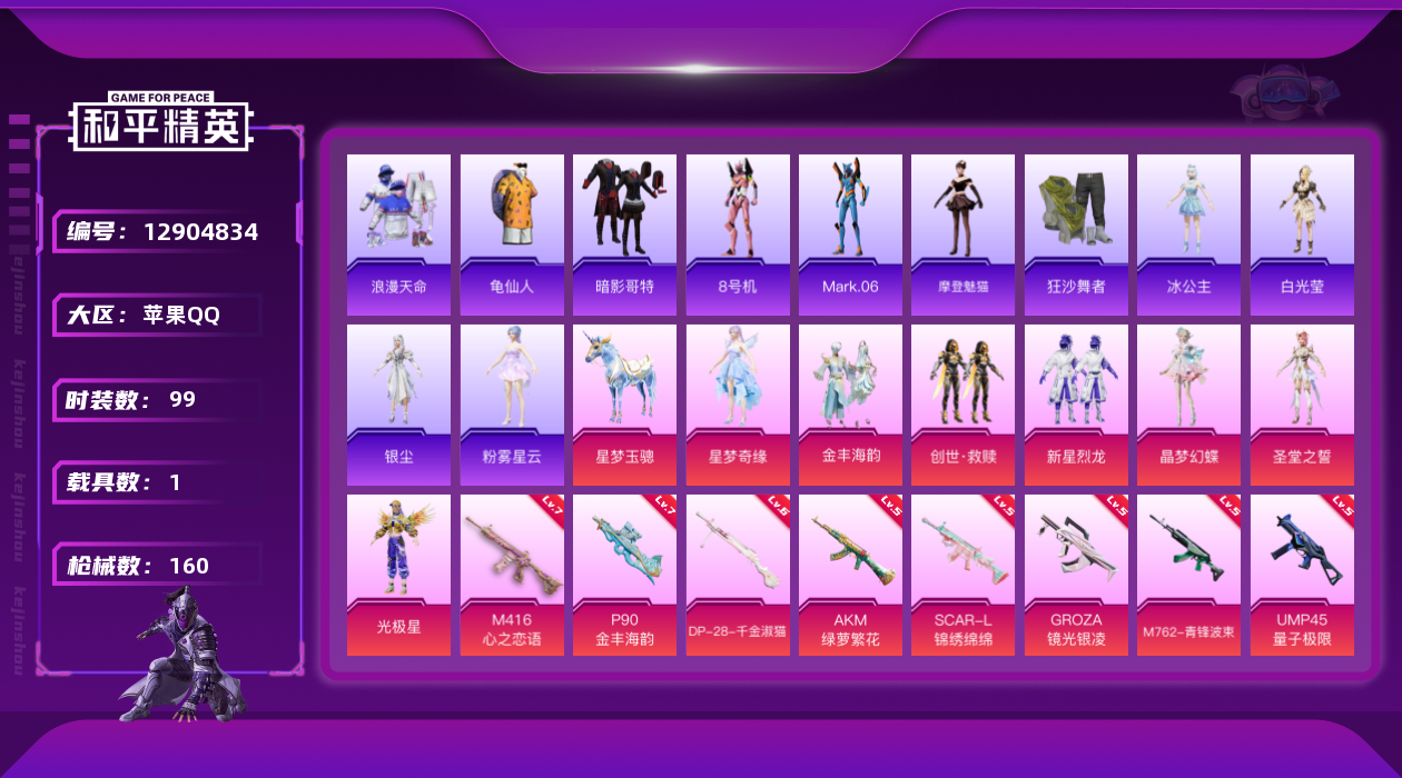 [12904834]苹果 手Q-7粉装-11特效枪-1载具-7粉色飞行器-55688热力值-7王牌印记-99套装-160枪皮 【热门品类】:套装-浪漫天命,套装-奇异狩猎者,角色-忠猛周仓,套装-龟仙人,套装-暗影哥特,角色-8号机,角色-Mark.06 【粉色载具】:星梦玉骢 【粉色套装】:粉装-新星烈龙,角色-圣堂之誓,角色-光极星,套装-创世·救赎,角色-星梦奇缘,粉装-金丰海韵,角色-晶梦幻蝶 【粉色枪皮等级】:AKM-绿萝繁花(五级),SCAR-L-锦绣绵绵(五级),M416-心之恋语(七级),GROZA-镜光银凌(五级),M762-青锋波束(五级),UMP45-量子极限(五级),UMP45-宇宙意志(三级),P90-金丰海韵(七级),Kar98K-巳巳如意(五级),DP-28-千金淑猫(六级),DP-28-豹影疾电(三级) 【粉色枪皮】:AKM-绿萝繁花,SCAR-L-锦绣绵绵,M416-心之恋语,GROZA-镜光银凌,M762-青锋波束,UMP45-量子极限,UMP45-宇宙意志,P90-金丰海韵,Kar98K-巳巳如意,DP-28-千金淑猫,DP-28-豹影疾电 【粉色飞行器】:镜光幻境飞行翼,镜域双华-灵镜之阶,龙翔九天飞行器,幻海精灵飞行器,深渊漩涡飞行器,飞天猪飞行器 【粉色降落伞】:极限特训降落伞,洛神天依降落伞,天之羽翼降落伞,第五大道降落伞,炎氏战神降落伞,圣堂之誓降落伞,小叽联名款降落伞,祥瑞锦鲤降落伞,精灵梦叶罗丽降落伞,星梦奇缘降落伞,金丰海韵降落伞,宇宙意志降落伞,千金淑猫降落伞,樱桃泡泡降落伞 【稀有套装】:套装-龟仙人,套装-雏菊兔兔,套装-萝兰蝴蝶,套装-小熊娃娃,套装-糖糖葫芦,套装-青团波波,套装-棉花软糖,角色-摩登魅猫,套装-晶灵使者,套装-朱霞炽焰,套装-凌霄紫焰 【稀有枪皮】:AKM-奇异狩猎者,AKM-影袭,AKM-缤纷海域,AKM-霓虹街区,AKM-龙的传人,M16A4-莲影清波,M16A4-千金淑猫,SCAR-L-夜灯,M416-摩登王国,M416-糯团青竹,M416-绯红前夜,GROZA-影袭,AUG-青春冒险家,QBZ-潮汐统领,M762-奇异狩猎者,M762-绯红前夜,Mk47-摩登王国,G36C-星穹咏叹调,AC-VAL-快闪甜心,AC-VAL-闲梦青缨,蜜獾-天降萌叽,ARX-凌霄紫焰,UZI-啾咪啾咪,UZI-天