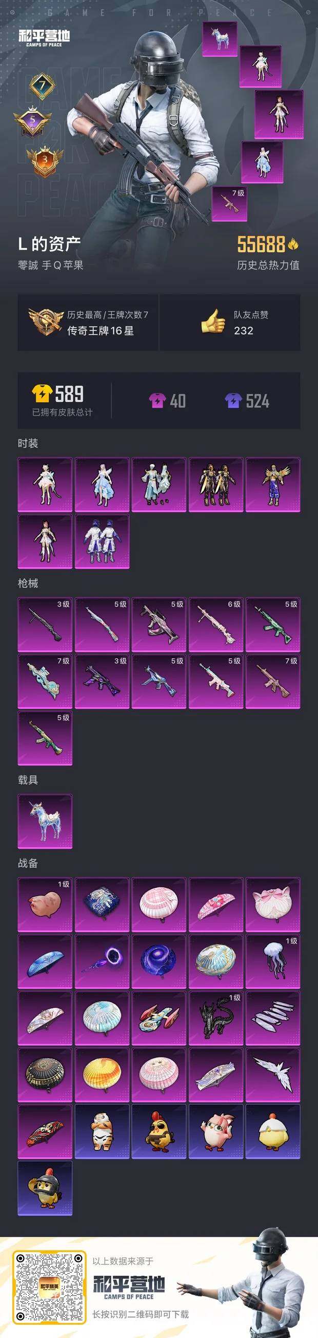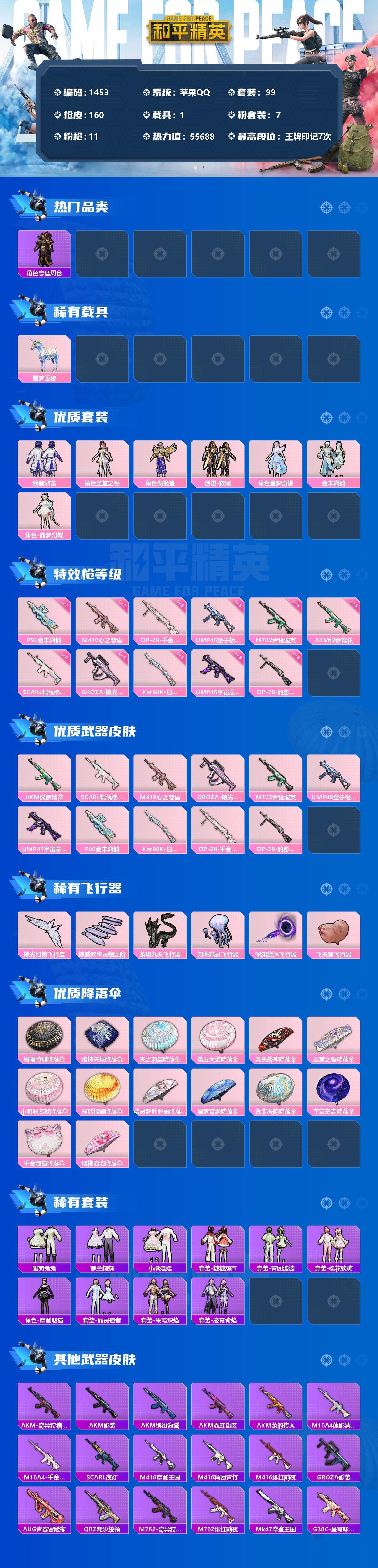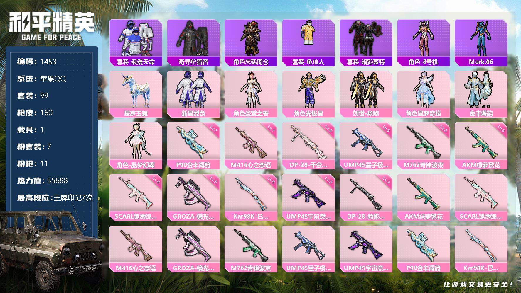 [12904834]苹果 手Q-7粉装-11特效枪-1载具-7粉色飞行器-55688热力值-7王牌印记-99套装-160枪皮