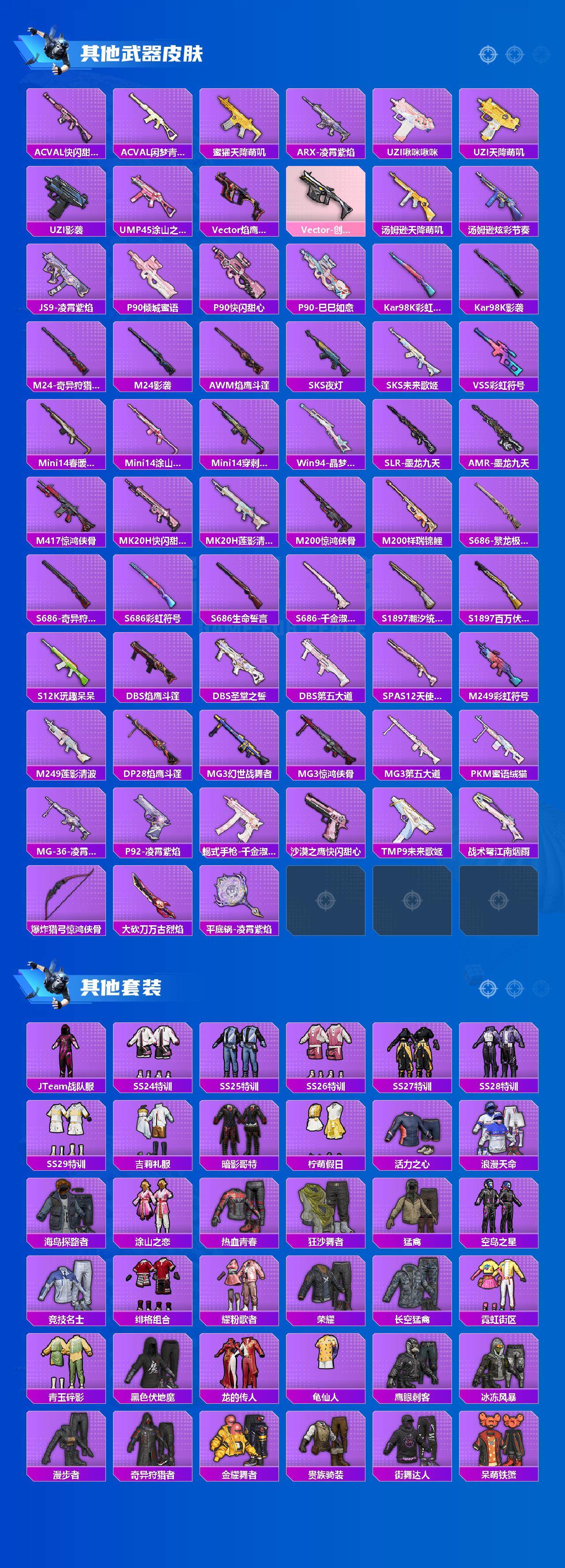【稀有枪皮】:AKM-奇异狩猎者,AKM-影袭,AKM-缤纷海域,AKM-霓虹街区,AKM-龙的传人,M16A4-莲影清波,M16A4-千金淑猫,SCAR-L-夜灯,M416-摩登王国,M416-糯团青竹,M416-绯红前夜,GROZA-影袭,AUG-青春冒险家,QBZ-潮汐统领,M762-奇异狩猎者,M762-绯红前夜,Mk47-摩登王国,G36C-星穹咏叹调,AC-VAL-快闪甜心,AC-VAL-闲梦青缨,蜜獾-天降萌叽,ARX-凌霄紫焰,UZI-啾咪啾咪,UZI-天