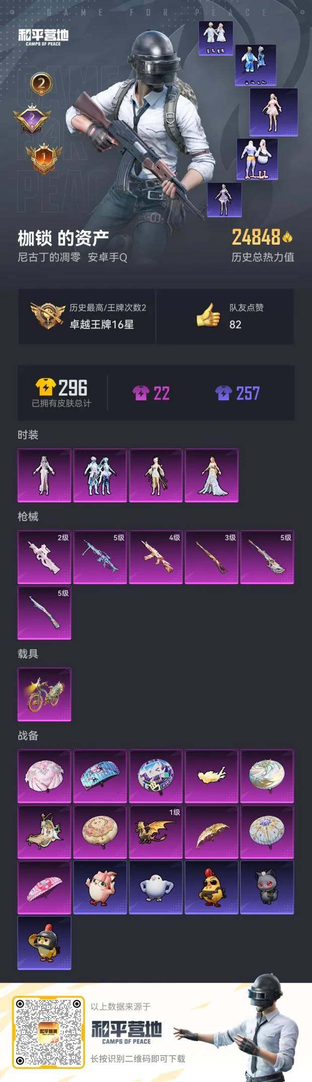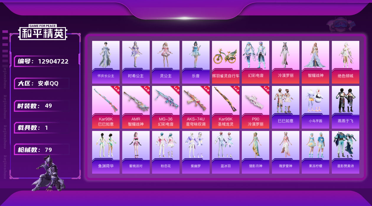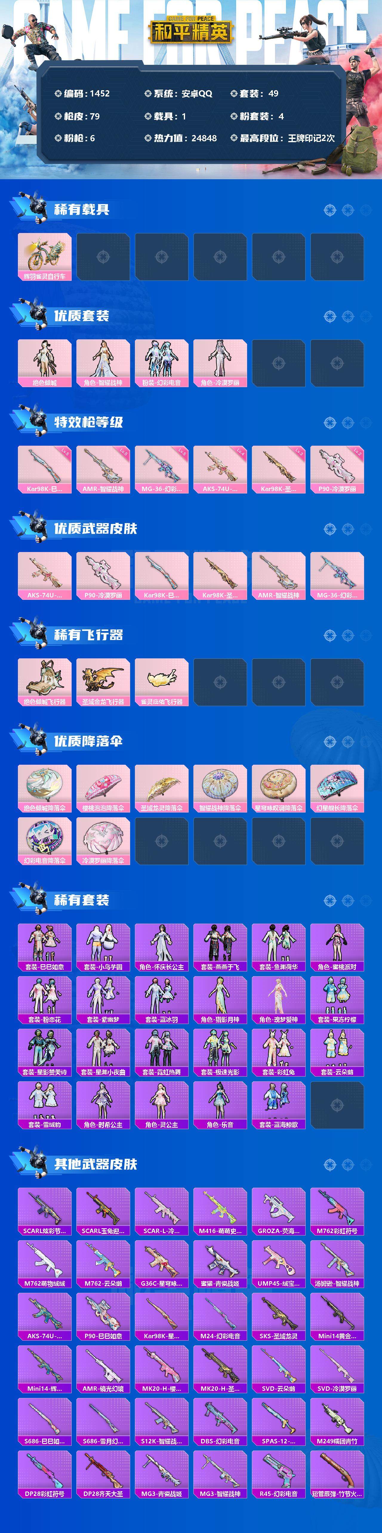 [12904722]安卓 手Q-4粉装-6特效枪-1载具-3粉色飞行器-24848热力值-2王牌印记-49套装-79枪皮 【粉色载具】:辉羽雀灵自行车 【粉色套装】:角色-绝色倾城,角色-智耀战神,粉装-幻彩电音,角色-冷漠罗丽 【粉色枪皮等级】:AKS-74U-星穹咏叹调(四级),P90-冷漠罗丽(二级),Kar98K-巳巳如意(五级),Kar98K-圣域龙灵(三级),AMR-智耀战神(五级),MG-36-幻彩电音(五级) 【粉色枪皮】:AKS-74U-星穹咏叹调,P90-冷漠罗丽,Kar98K-巳巳如意,Kar98K-圣域龙灵,AMR-智耀战神,MG-36-幻彩电音 【粉色飞行器】:绝色倾城飞行器,圣域金龙飞行器,雀灵庇佑飞行器 【粉色降落伞】:绝色倾城降落伞,樱桃泡泡降落伞,圣域龙灵降落伞,智耀战神降落伞,星穹咏叹调降落伞,幻星舰长降落伞,幻彩电音降落伞,冷漠罗丽降落伞 【稀有套装】:套装-巳巳如意,套装-小鸟芋圆,角色-怀庆长公主,套装-燕燕于飞,套装-鱼渊荷华,角色-蜜桃派对,套装-粉恋花,套装-紫幽梦,套装-蓝冰羽,角色-猎影月神,角色-瑰梦爱神,套装-果冻柠檬,套装-星影赞美诗,套装-星渊小夜曲,套装-霓虹热舞,套装-极速光影,套装-彩虹兔,套装-云朵鹅,套装-雪绒豹,角色-时希公主,角色-灵公主,角色-乐音,套装-蓝海鲸歌 【稀有枪皮】:SCAR-L-炫彩节奏,SCAR-L-玉兔迎春,SCAR-L-冷漠罗丽,M416-萌萌史莱姆,GROZA-荧海星豚,M762-彩虹符号,M762-萌物绒绒,M762-云朵鹅,G36C-星穹咏叹调,蜜獾-青瓷战姬,UMP45-绒宝小鹅,汤姆逊-智耀战神,AKS-74U-辉羽雀灵,P90-巳巳如意,Kar98K-星穹咏叹调,M24-幻彩电音,SKS-圣域龙灵,Mini14-黄金龙骨,Mini14-辉羽雀灵,AMR-镜光幻境,MK20-H-樱桃泡泡,MK20-H-圣域龙灵,SVD-云朵鹅,SVD-冷漠罗丽,S686-雪月幻音,S686-巳巳如意,S12K-智耀战神,DBS-幻彩电音,SPAS-12-云朵鹅,M249-糯团青竹,DP-28-彩虹符号,DP-28-齐天大圣,MG3-青瓷战姬,MG3-智耀战神,R45-幻彩电音,短管霰弹-竹节火铳,短管霰弹-圣域龙灵,短管霰弹-星穹咏叹调,沙漠之鹰-云朵鹅,爆炸猎弓-雪月幻音,大砍刀-云朵鹅,撬棍