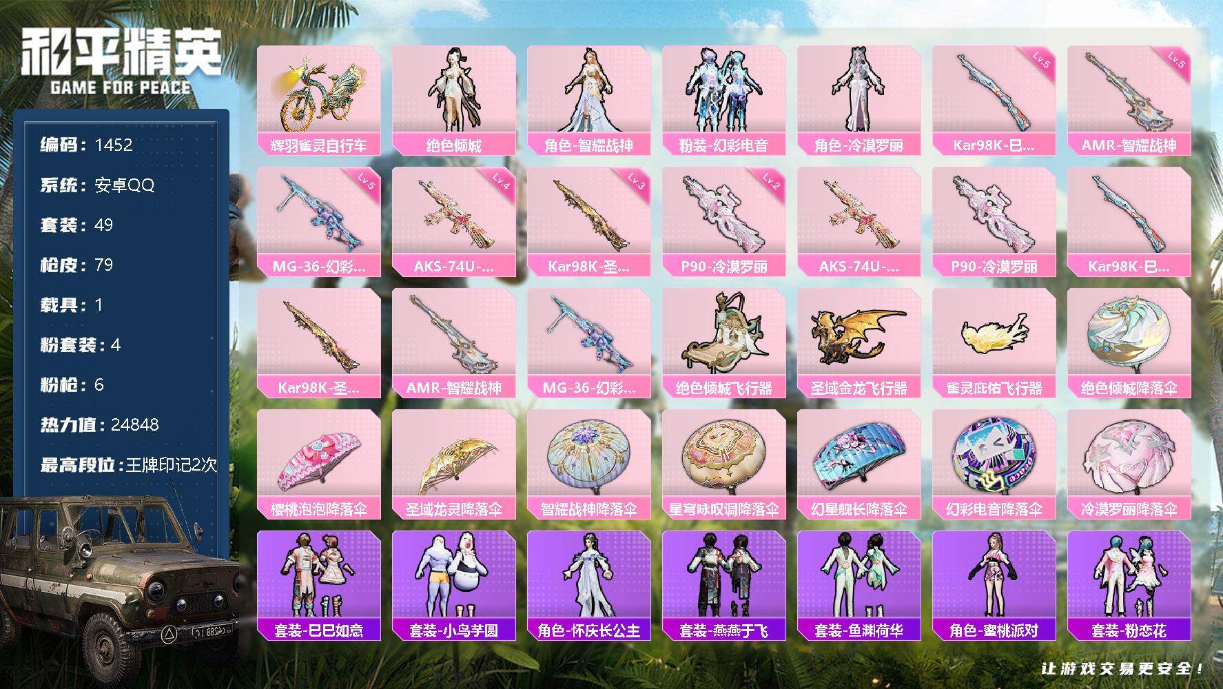 [12904722]安卓 手Q-4粉装-6特效枪-1载具-3粉色飞行器-24848热力值-2王牌印记-49套装-79枪皮