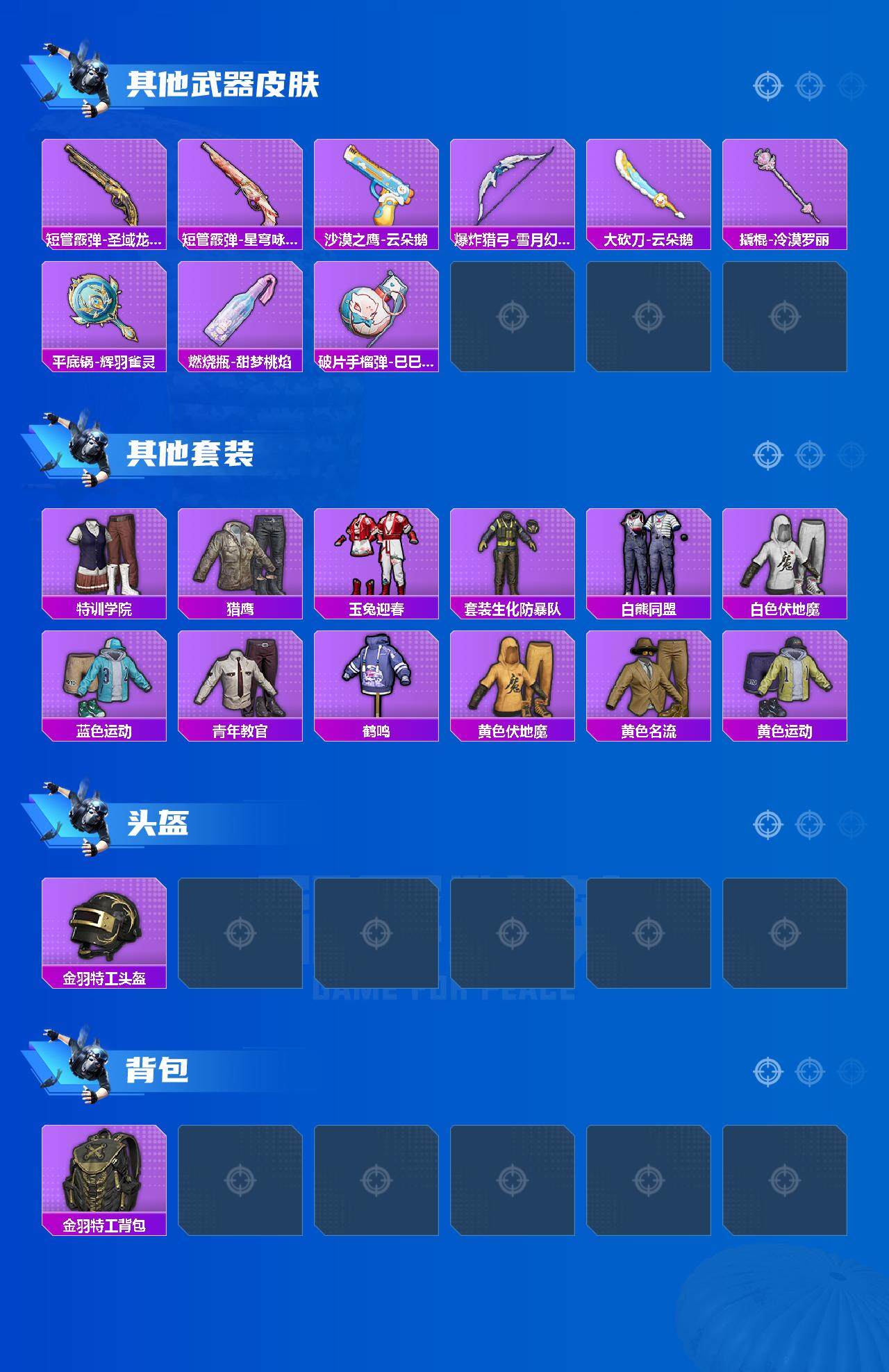 - [12244406]9粉装 5特效枪 2载具 11印记 可二次 可修改实名 身法装备:暗影哥特(红眼罩),沙漠守护者 优质装备:玛莎拉蒂Ghibli(粉),特斯拉Model X(冷光银),沙漠守护者(黑丝),M762甜蜜誓约,AKM炫紫旋律,Kar98K伏魔团,M416五爪金龙,奇异狩猎者,古堡领主,火曜朱雀,水曜玄武,金属狂野,缤纷油彩(猪妹猪脸妹),彗云及圣,PEL轰鸣竞梦者,新星烈龙(小白龙),狩月元帅,七级AKM-炫紫旋律,七级M416-五爪金龙 热门装扮:沙漠守护者,神秘黑猫,软萌银虎,罗小黑,大橘为重,潮萌小黄鸭,浪漫波比 稀有枪皮:DP-28-豹影疾电 五级特效枪:五级M762-甜蜜誓约,五级DP-28-豹影疾电 四级特效枪:四级Kar98K-伏魔团 紫色装扮:SS21特训,SS2特训,SS3特训,SS5特训,六六大吉,军械专家,凛冬战士,刚毅裁决者,北国孤狼,旭日情侣,SS33特训套装,5.56爱好者,SS20特训,银白舞王,SS13特训,吉莉礼服,电音精灵,瑞龙福将,团圆交子,SS17特训,SS18特训,都市漫游者,金鼠迎春,长空猛禽,雪山征服者,雪山精英,霓虹街区,耀动青春,耀眼新星,蓝彩潮人,蓝色守护者,虎虎生威吉莉,跃动心情,风行保卫者,飞行日记,骑行爱好者,麻辣教官,黑色伏地魔,朋克之心,格斗先锋,沙漠兵团,海滨突袭者,滨海假日,圣诞大吉,夏日音浪,夜莺强袭者,幻世保卫者,幻世战舞者,怒火燎原,战地菁英,探宝勇士,滨海厨神,绮丽涂鸦,疯狂小兔子,破蛋小黄鸡,甜蜜告白,空投萌叽,竞技勇士朋克,甜蜜熊情侣,王牌教练,灰色格斗者,热血青春,熔岩使者,特战装甲,特殊使命,特训学院,镭射皇者,森林游猎者,竞技名士,暗影哥特(红眼罩),粉红小猪,SS26特训,春光漫游,快闪甜心,炽焰拳师,格斗专家,SS6特训,拳皇97八神庵,SS7特训,人鱼之吻,深蓝冒险家,迷域探索者,顽皮玉兔,幻世尖兵,花式比心,太极红客,摩艾涂鸦,SS8特训,乘风破浪,粉甜马卡龙,逆风勇士,SS12特训,PEL躁动竞梦者,纯白誓言,众神之王,智慧之神,SS9特训,舞夜骑士,红酒骑士,不夜海上花,风华少年志,白月香洋装,SS10特训,暗夜契约,神奈川冲浪里,荷鲁斯之眼,机械英豪,机械征服者,SS11特训,绯格组合,传奇侦探,特种空勤,海上生明月,爆竹金鼠 优质战备:圣堂之誓降落伞,沙丘之主降落伞,