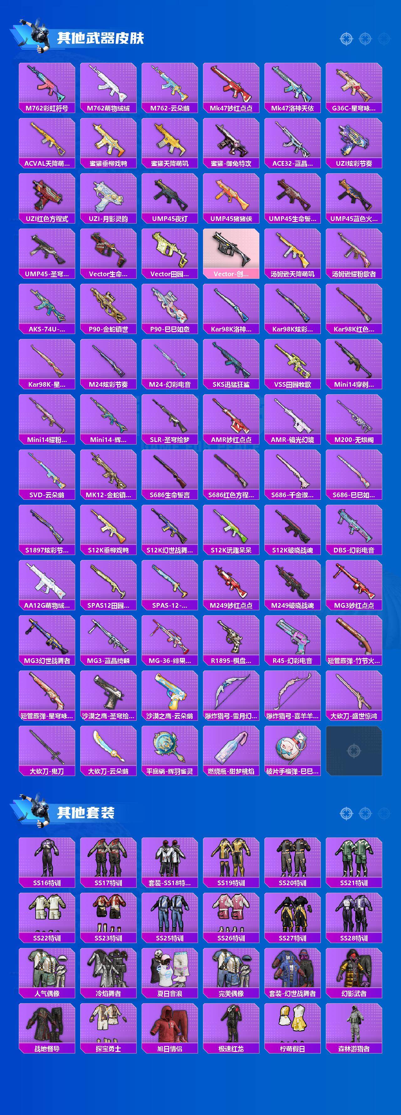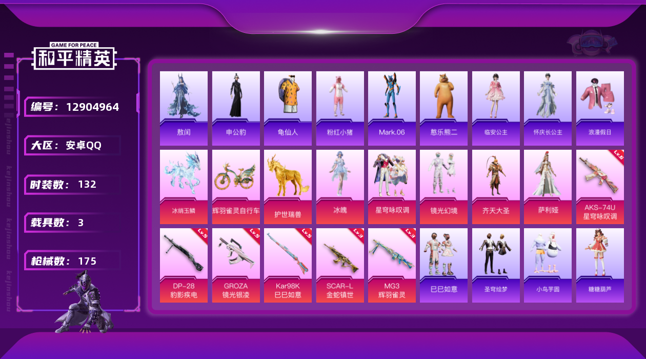 [12904964]安卓 手Q-5粉装-7特效枪-3载具-7粉色飞行器-56966热力值-16王牌印记-132套装-175枪皮 【热门品类】:套装-深海小丑鱼,套装-龟仙人,套装-粉红小猪,角色-Mark.06 【粉色载具】:护世瑞兽,冰绡玉鳞,辉羽雀灵自行车 【粉色套装】:粉装-齐天大圣,粉装-镜光幻境,角色-萨利娅,粉装-星穹咏叹调,角色-冰魄 【粉色枪皮等级】:SCAR-L-金蛇镇世(三级),GROZA-镜光银凌(五级),AKS-74U-星穹咏叹调(六级),Kar98K-巳巳如意(五级),Mk14-甜梦熊击(五级),DP-28-豹影疾电(五级),MG3-辉羽雀灵(三级) 【粉色枪皮】:SCAR-L-金蛇镇世,GROZA-镜光银凌,AKS-74U-星穹咏叹调,Kar98K-巳巳如意,Mk14-甜梦熊击,DP-28-豹影疾电,MG3-辉羽雀灵 【粉色飞行器】:齐天大圣飞行器,千面幻镜飞行器,镜光幻境飞行翼,万象金身飞行器,百变魔方飞行器,雀灵庇佑飞行器 【粉色降落伞】:暗夜玫瑰降落伞,千面幻镜降落伞,萌物绒绒降落伞,繁龙极客降落伞,霓虹漫游降落伞,创世·救赎降落伞,临安公主降落伞,金蛇镇世降落伞,幻影飞狐降落伞,雪月幻音降落伞,星穹咏叹调降落伞,辉羽雀灵降落伞,幻彩电音降落伞 【稀有套装】:套装-龟仙人,玩偶服-憨乐熊二,套装-巳巳如意,套装-圣穹绘梦,套装-小鸟芋圆,套装-糖糖葫芦,套装-青团波波,套装-棉花软糖,角色-临安公主,角色-怀庆长公主,套装-燕燕于飞,套装-鱼渊荷华,套装-旋风灵鼠,套装-粉恋花,套装-紫幽梦,套装-蓝冰羽,套装-星影赞美诗,套装-星渊小夜曲,套装-极速光影,套装-彩虹兔,套装-云朵鹅,套装-雪绒豹,套装-蜜露汐语,角色-敖闰,角色-申公豹 【稀有枪皮】:AKM-彩虹符号,AKM-生命誓言,AKM-破晓战魂,AKM-虎虎生威,AKM-龙的传人,M16A4-幻世战舞者,M16A4-红色方程式,M16A4-蓝色火焰,SCAR-L-玉兔迎春,SCAR-L-红色方程式,M416-糯团青竹,M416-红色方程式,M416-蓝色火焰,GROZA-田园牧歌,AUG-海螺星光,AUG-耀粉歌者,AUG-金蛇镇世,M762-天降萌叽,M762-彩虹符号,M762-萌物绒绒,M762-云朵鹅,Mk47-妙红点点,Mk47-洛神天依,G36C-星穹咏叹调,AC-VAL-天降