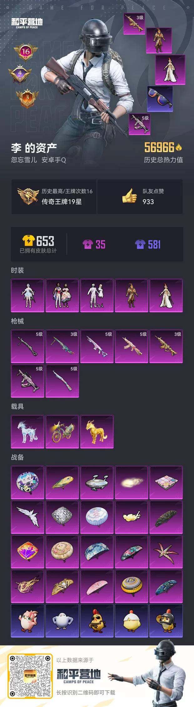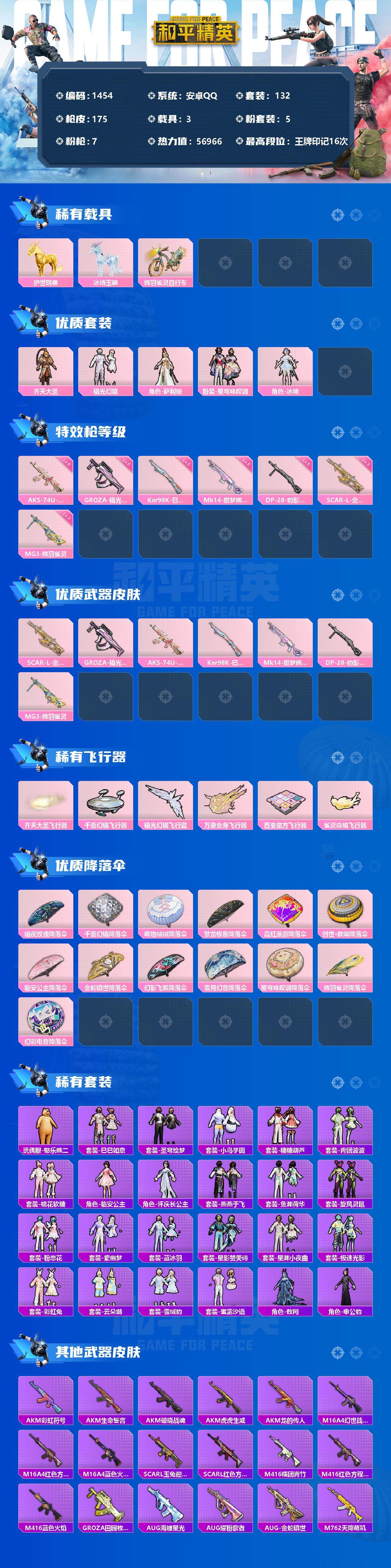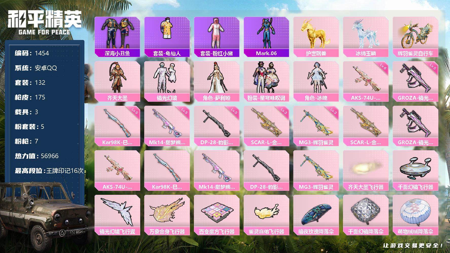 [12904964]安卓 手Q-5粉装-7特效枪-3载具-7粉色飞行器-56966热力值-16王牌印记-132套装-175枪皮