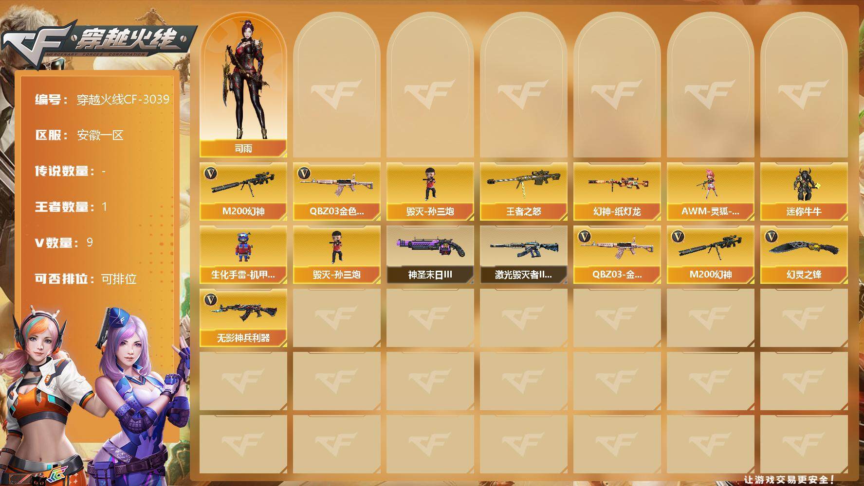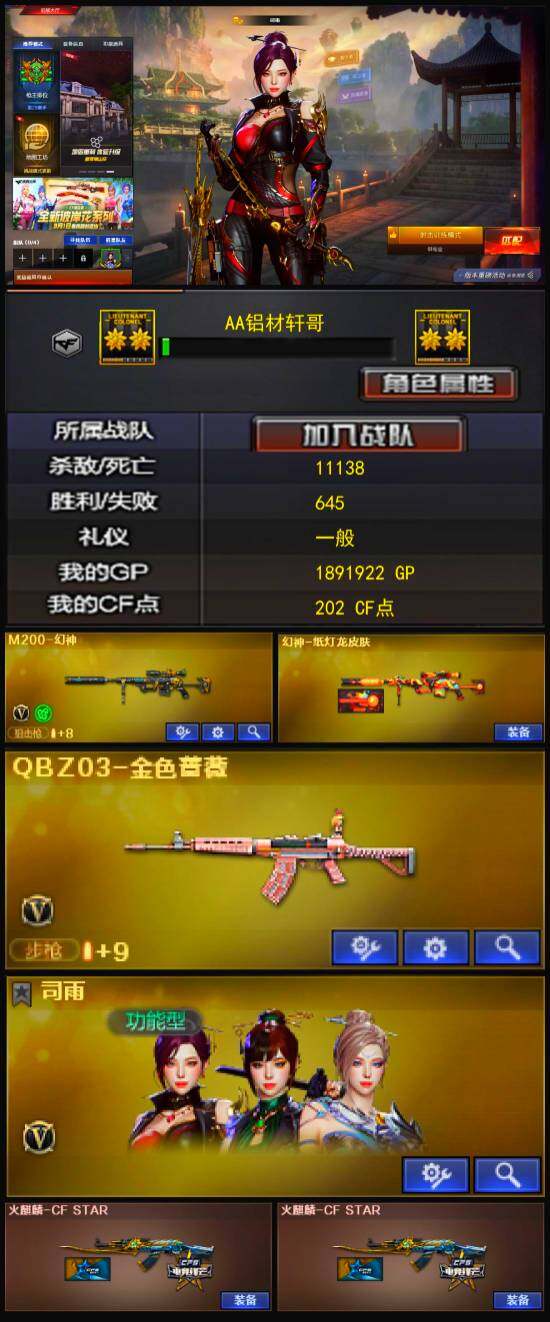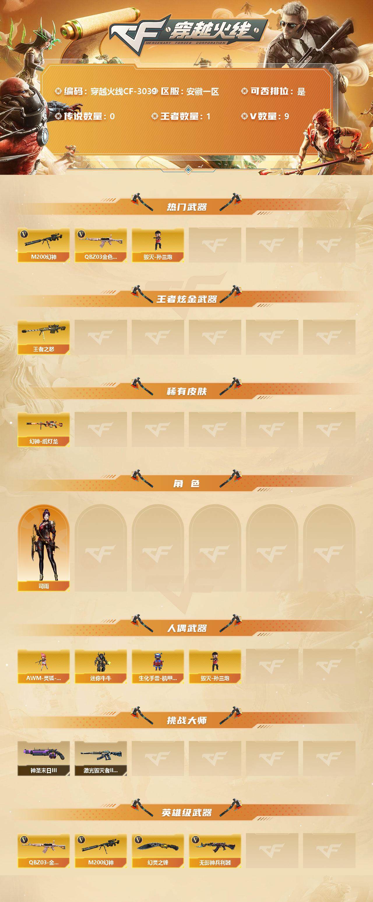 [12905895]安徽一区-9V-1王者-0炫金 【热门武器】:QBZ03-金色蔷薇,M200-幻神,毁灭-孙三炮 【王者炫金武器】:王者之怒 【稀有皮肤】:幻神-纸灯龙皮肤 【角色】:司雨 【人偶武器】:毁灭-孙三炮,AWM-灵狐-15周年嘉年华,迷你牛牛,生化手雷-机甲核心 【挑战大师】:神圣爆裂者-末日III,激光毁灭者III-白马银枪 【英雄级武器】:无影-神兵利器,QBZ03-金色蔷薇,M200-幻神,幻灵之锋 【特殊枪械】: