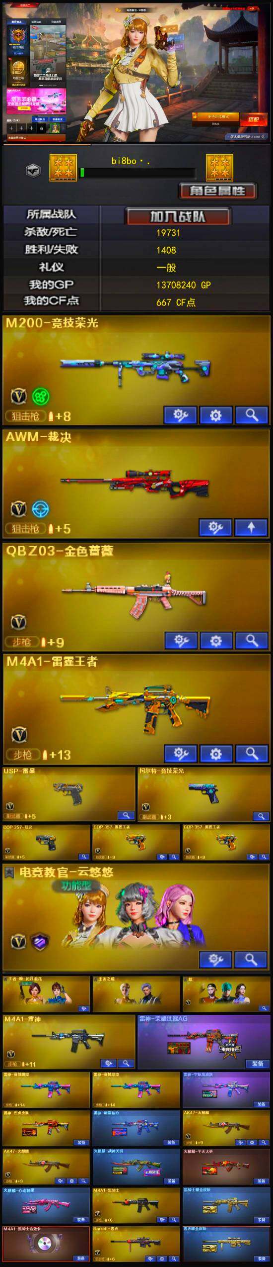 - [12315421]【商品标题】:四川二区-21V-0王者-0炫金 【热门武器】:QBZ03-金色蔷薇,M200-幻神,柯尔特-冠军之特,M4A1-黑骑士,汤姆逊-烈龙*3,加特林-炼狱,斯泰尔-蝴蝶,沙鹰-修罗,Knife-冠军之刃,黄金猫猫手套-白鲨 【稀有皮肤】:M200-幻神-黄忠皮肤,幻神-降龙,QBZ03-冠军之薇,雷神-冠军之魄,火麒麟-平天大圣,火麒麟-心动糖果,黑骑士-冠军之势,毁灭-暗月,毁灭-冠军之怒,毁灭-风暴,修罗-冠军之魂 【角色】:灵动武士 【人偶武器】:斯泰尔-蝴蝶,AWM-灵狐-15周年嘉年华,迷你巨石泰坦-魔花研究所,迷你牛魔王,迷你波特博士,迷你生化手雷 【暴走生化】:斯泰尔-蝴蝶,超级对讲机 【挑战大师】:神圣爆裂者-末日III,冰龙粉碎者-白马银枪 【英雄级武器】:QBZ03-金色蔷薇,无影-神兵利器,M4A1-雷神,M4A1-玫瑰精灵,M4A1-黑骑士,加特林-炼狱,汤姆逊-烈龙*3,AK47-火麒麟,AN94-超新星,Barrett-毁灭,M200-幻神,柯尔特-冠军之特,沙鹰-修罗,擎天,屠龙 【特殊枪械】:蝴蝶斯泰尔+3烈龙,1黑骑士,3烈龙,1炼狱,1蝴蝶斯泰尔