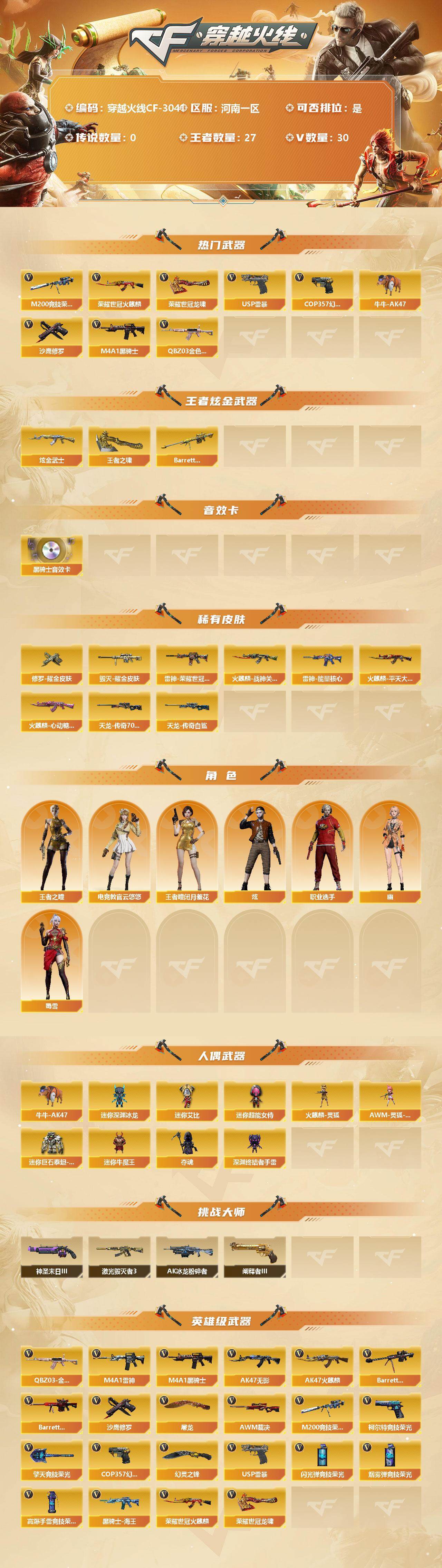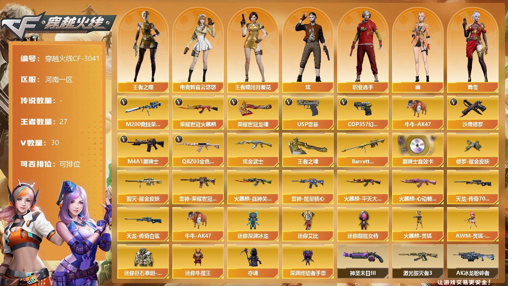 [12906324]河南一区-30V-27王者-1炫金 【热门武器】:QBZ03-金色蔷薇,M200-竞技荣光,荣耀世冠-火麒麟,牛牛-AK47,M4A1-黑骑士,USP-雷暴,COP 357-幻灵,沙鹰-修罗,荣耀世冠-龙啸 【王者炫金武器】:Barrett-雷霆王者,王者之啸,炫金武士 【音效卡】:M4A1-黑骑士音效卡 【稀有皮肤】:雷神-能量核心,雷神-荣耀世冠AG,火麒麟-战神关羽,火麒麟-平天大圣,火麒麟-心动糖果,毁灭耀金皮肤,AWM-天龙-传奇70KG,AWM-天龙-传奇白鲨,修罗耀金皮肤 【角色】:炫,电竞教官-云悠悠,王者-瞳-闭月羞花,王者之瞳,幽,蜀雪,职业选手 【人偶武器】:火麒麟-灵狐,AWM-灵狐-15周年嘉年华,牛牛-AK47,迷你深渊冰龙*2,迷你艾比,迷你超能女侍,迷你巨石泰坦-魔花研究所,迷你牛魔王,夺魂,深渊终结者手雷*2 【挑战大师】:神圣爆裂者-末日III,阐释者III,激光毁灭者III,AK47-冰龙粉碎者 【英雄级武器】:AK47-火麒麟*2,M4A1-雷神,M4A1-黑骑士,AK47-无影,QBZ03-金色蔷薇,荣耀世冠-火麒麟,黑骑士-海王,Barrett-毁灭,Barrett-极光,AWM-裁决,M200-竞技荣光,沙鹰-修罗,USP-雷暴,COP 357-幻灵,柯尔特-竞技荣光,屠龙,幻灵之锋,擎天-竞技荣光,荣耀世冠-龙啸,高爆手雷-竞技荣光,闪光弹-竞技荣光,烟雾弹-竞技荣光 【特殊枪械】:1黑骑士