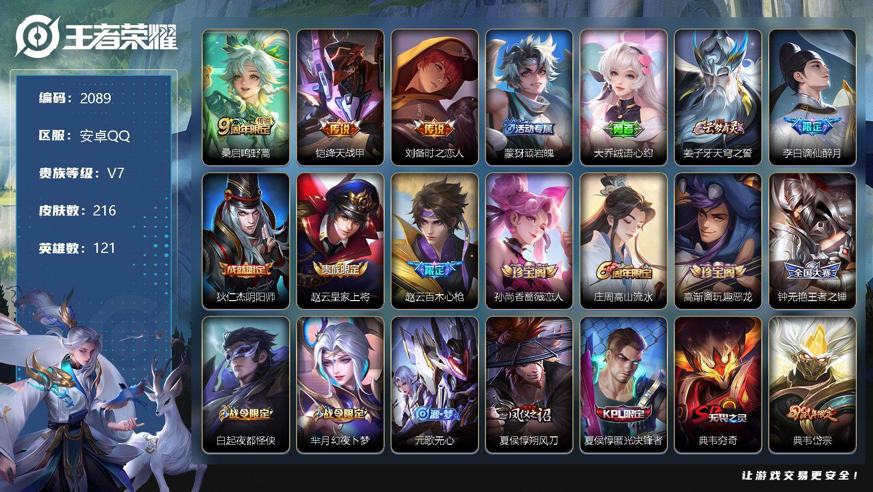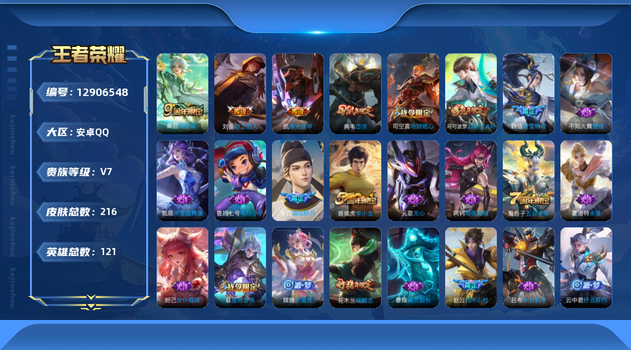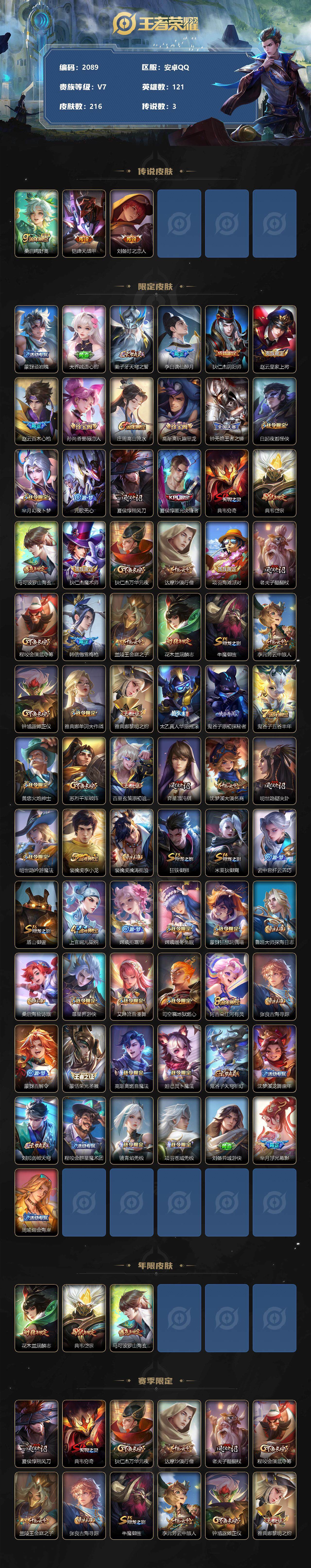[12906548]安卓Q-V7-至尊星耀V段位-121英雄-216皮肤-0典藏-0珍品无双-0无双-0珍品传说-3传说-58史诗