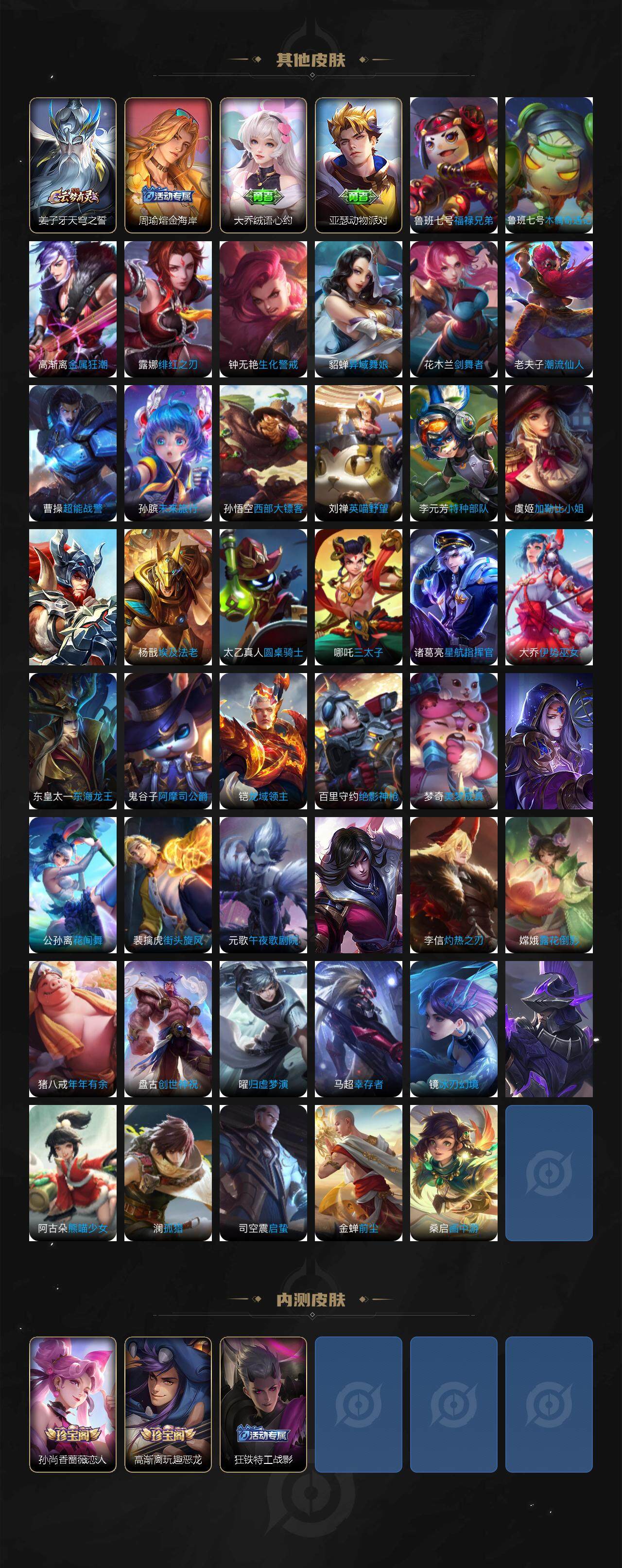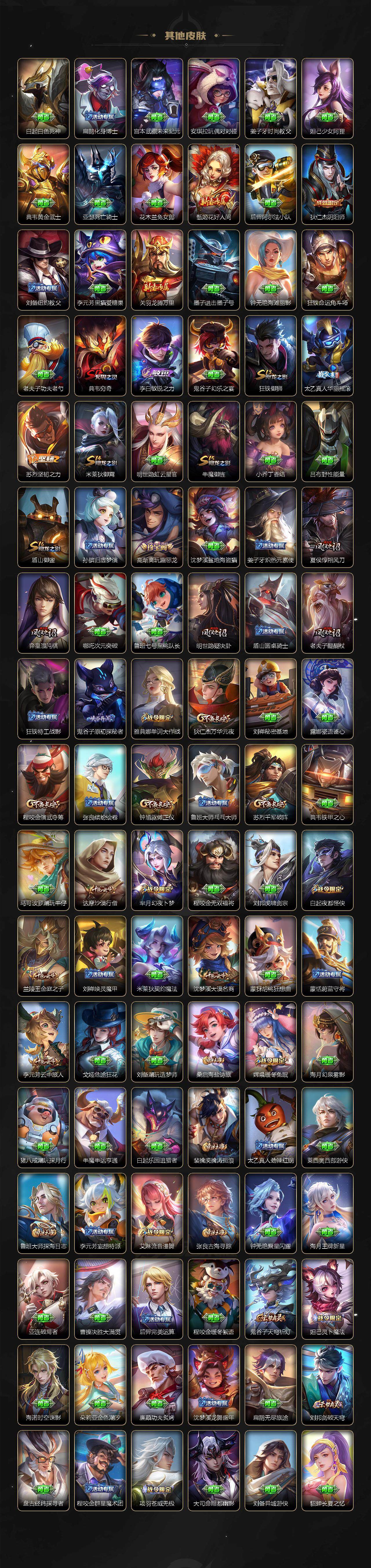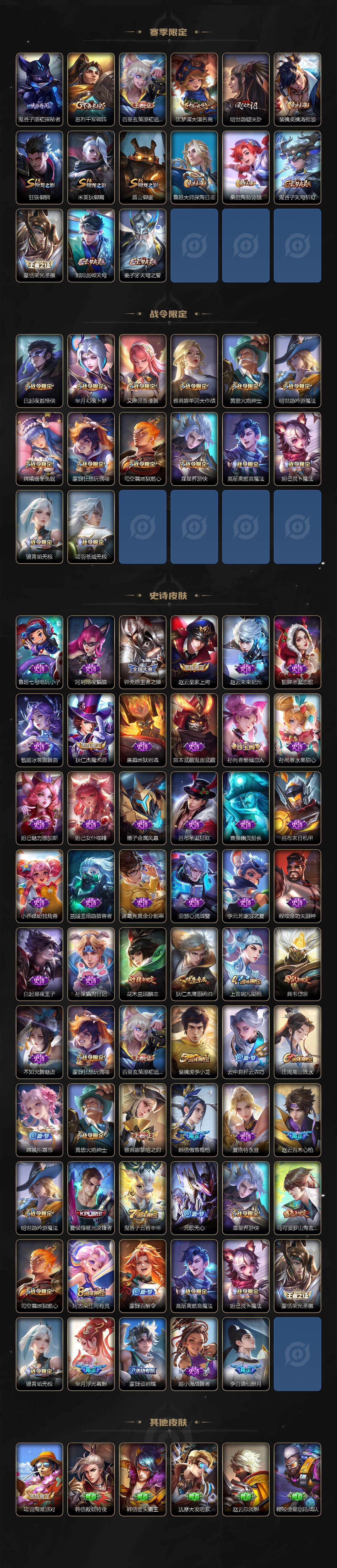 【限定皮肤】:蒙犽顽岩魄,大乔绒语心约,姜子牙天穹之誓,李白谪仙醉月,狄仁杰阴阳师,赵云皇家上将,赵云百木心枪,孙尚香蔷薇恋人,庄周高山流水,高渐离玩趣恶龙,钟无艳王者之锤,白起夜都怪侠,芈月幻夜卜梦,元歌无心,夏侯惇朔风刀,夏侯惇匿光决锋者,典韦穷奇,典韦岱宗,马可波罗山海玄木吟,狄仁杰魔术师,狄仁杰万华元夜,达摩沙漠行僧,项羽海滩派对,老夫子醍醐杖,程咬金演武夺筹,韩信傲雪梅枪,兰陵王金庭之子,花木兰瑞麟志,牛魔御旌,李元芳云中旅人,钟馗驱傩正仪,雅典娜单词大作战,雅典娜黎明之约,太乙真人华丽摇滚,鬼谷子原初探秘者,鬼谷子五谷丰年,黄忠火炮绅士,苏烈千军破阵,百里玄策原初追逐者,弈星混沌棋,沈梦溪大漠名商,明世隐疑决卦,明世隐吟游魔法,裴擒虎李小龙,裴擒虎擒涛扼浪,狂铁御狮,米莱狄御霄,云中君纤云弄巧,盾山御銮,上官婉儿梁祝,嫦娥拒霜思,嫦娥暖冬兔眠,蒙犽狂想玩偶喵,鲁班大师探海日志,桑启海盐诗旅,暃星界游侠,艾琳流音漫舞,司空震地狱燃心,阿古朵江河有灵,张良古海寻踪,蒙犽百解令,蒙恬荣光圣徽,高渐离燃音魔法,妲己灵卜魔法,鬼谷子天穹祈灯,沈梦溪龙舞盛年,刘邦剑破天穹,程咬金群星魔术团,镜青焰无极,项羽苍威无极,刘备异域游侠,芈月浮光幕影,周瑜熔金海岸