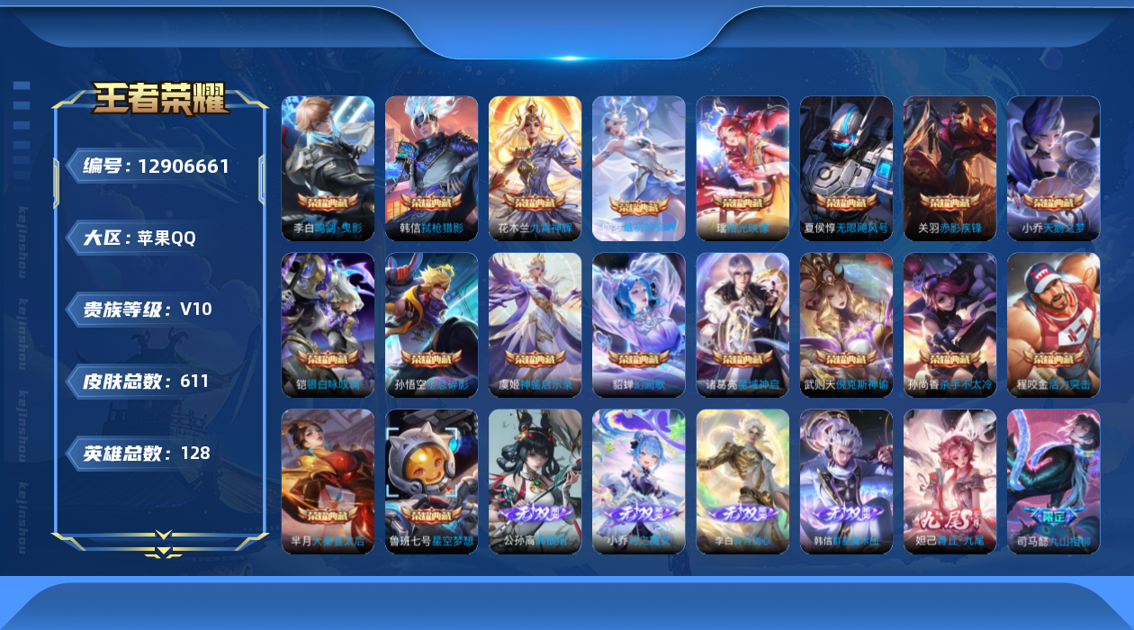 [12906661]苹果Q-V10-永恒钻石II段位-127英雄-611皮肤-18典藏-0珍品无双-5无双-0珍品传说-108传说-213史诗