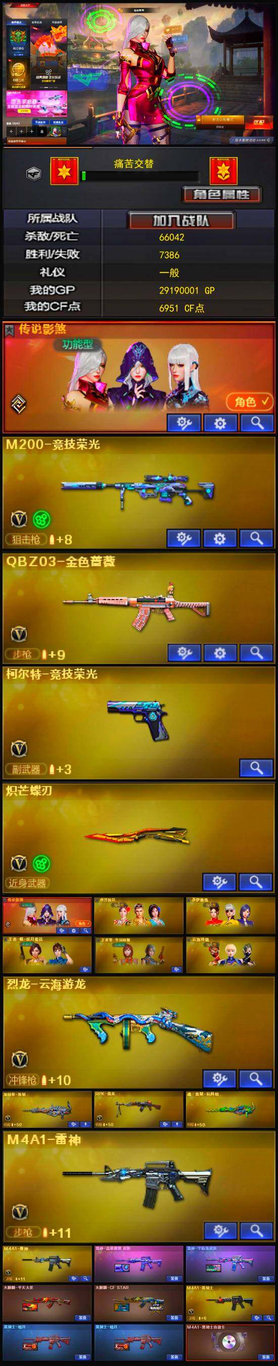 【英雄级武器】:M4A1-雷神*2,M4A1-黑骑士,超新星-热带奇洋,黑武士-锦绣游龙,QBZ03-金色蔷薇,烈火-动感闪耀,M200-竞技荣光,RPK-盘龙,加特林-炼狱,柯尔特-竞技荣光,天神-动感闪耀,屠龙,擎天-竞技荣光,炽芒蝶刃,屠龙-动感闪耀,擎天-云海游龙,龙啸-热带奇洋,屠龙-云海游龙,高爆手雷-竞技荣光*5,手雷-动感闪耀,闪光弹-竞技荣光*5,烟雾弹-竞技荣光*3,M4A1-赤狱骑士