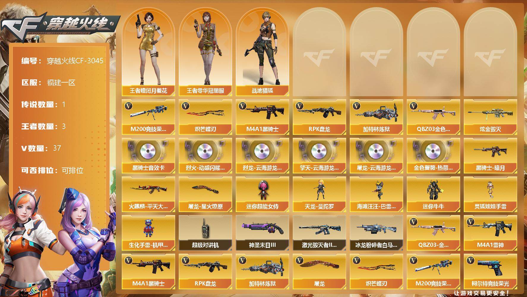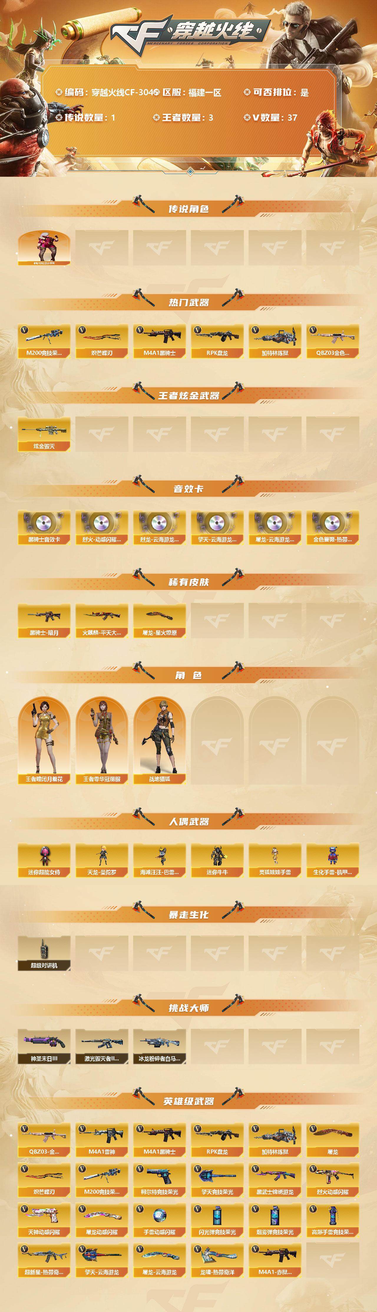 [12907340]福建一区-37V-3王者-1炫金 【传说角色】:传说影煞 【热门武器】:QBZ03-金色蔷薇,M200-竞技荣光,M4A1-黑骑士,RPK-盘龙,加特林-炼狱,炽芒蝶刃 【王者炫金武器】:炫金毁灭 【音效卡】:烈火-动感闪耀 音效卡,烈龙-云海游龙音效卡,擎天-云海游龙音效卡,屠龙-云海游龙音效卡,QBZ03-金色蔷薇-热带奇洋音效卡,M4A1-黑骑士音效卡 【稀有皮肤】:火麒麟-平天大圣,黑骑士-暗月*2,屠龙-星火燎原 【角色】:战地猎狐,王者-瞳-闭月羞花,王者零-华冠丽服 【人偶武器】:天龙-曼陀罗,海滩汪汪-巴雷特,迷你超能女侍,迷你牛牛,灵狐娃娃手雷*2,生化手雷-机甲核心*4 【暴走生化】:超级对讲机 【挑战大师】:神圣爆裂者-末日III,激光毁灭者III-白马银枪*2,冰龙粉碎者-白马银枪*2 【英雄级武器】:M4A1-雷神*2,M4A1-黑骑士,超新星-热带奇洋,黑武士-锦绣游龙,QBZ03-金色蔷薇,烈火-动感闪耀,M200-竞技荣光,RPK-盘龙,加特林-炼狱,柯尔特-竞技荣光,天神-动感闪耀,屠龙,擎天-竞技荣光,炽芒蝶刃,屠龙-动感闪耀,擎天-云海游龙,龙啸-热带奇洋,屠龙-云海游龙,高爆手雷-竞技荣光*5,手雷-动感闪耀,闪光弹-竞技荣光*5,烟雾弹-竞技荣光*3,M4A1-赤狱骑士 【特殊枪械】:1黑骑士,1盘龙,1炼狱