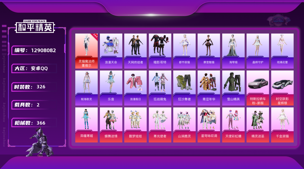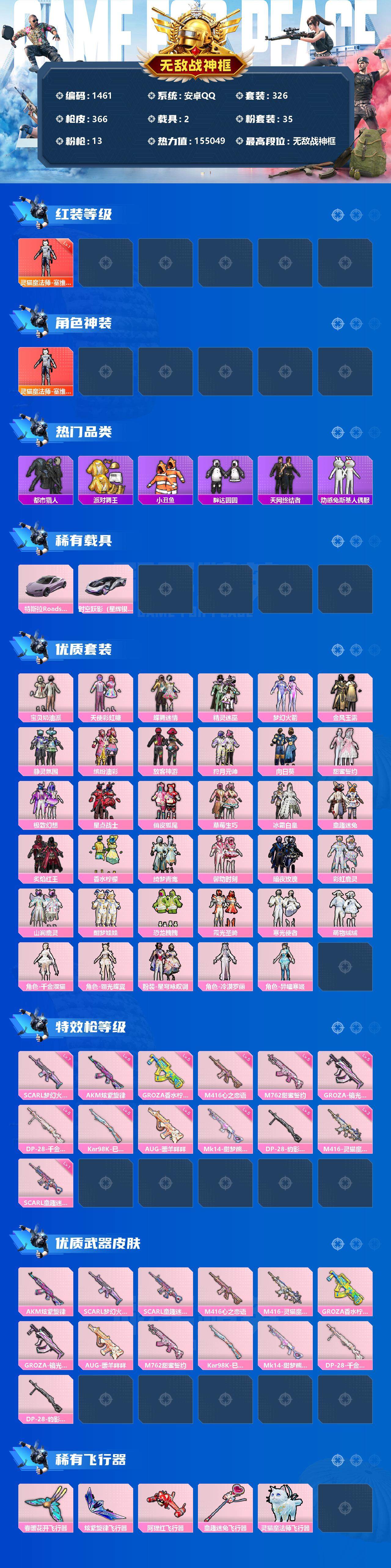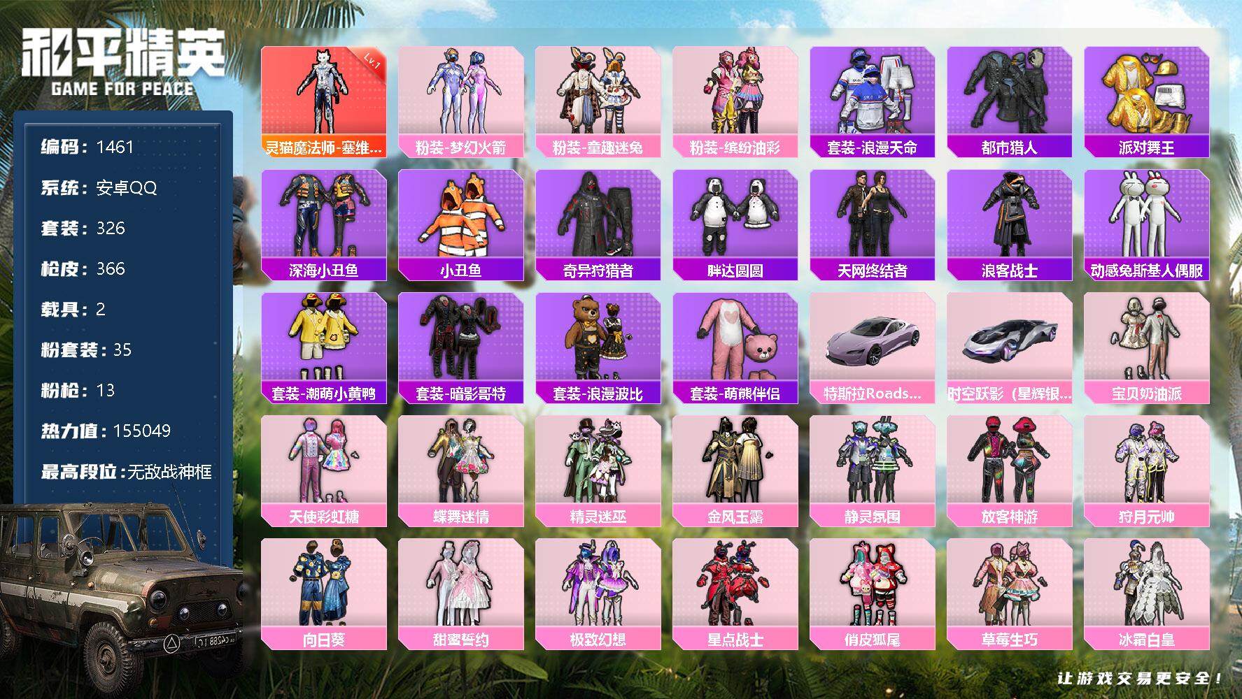 [12908082]安卓 手Q-无敌战神框-1神装-35粉装-13特效枪-2载具-5粉色飞行器-155049热力值-18王牌印记-326套装-366枪皮